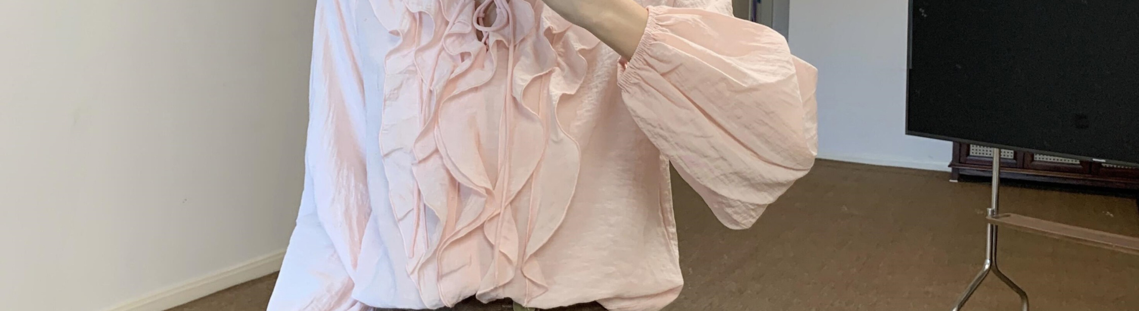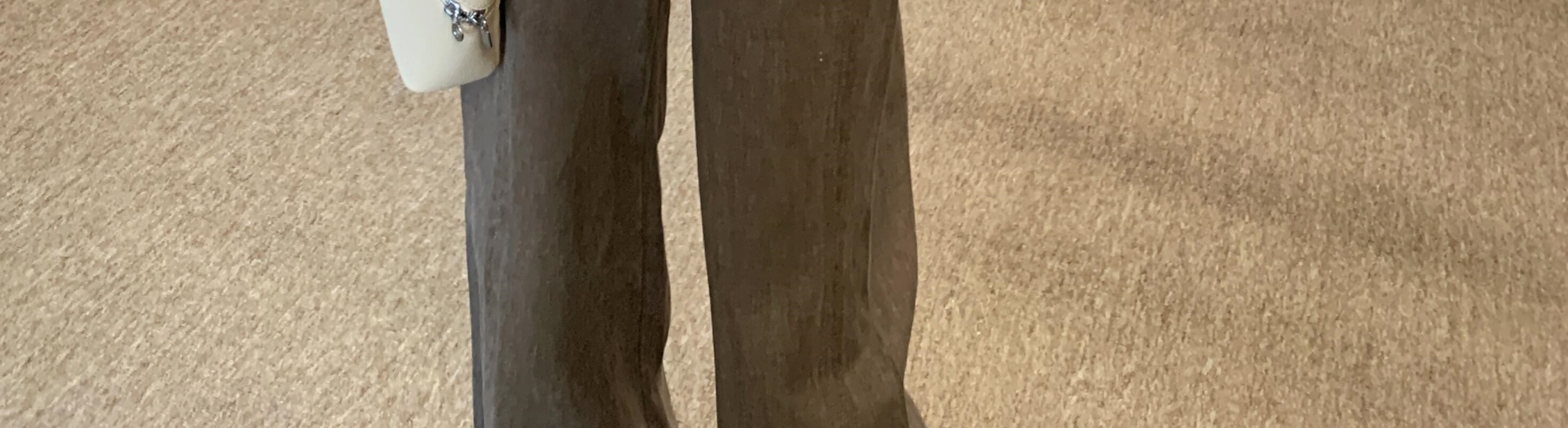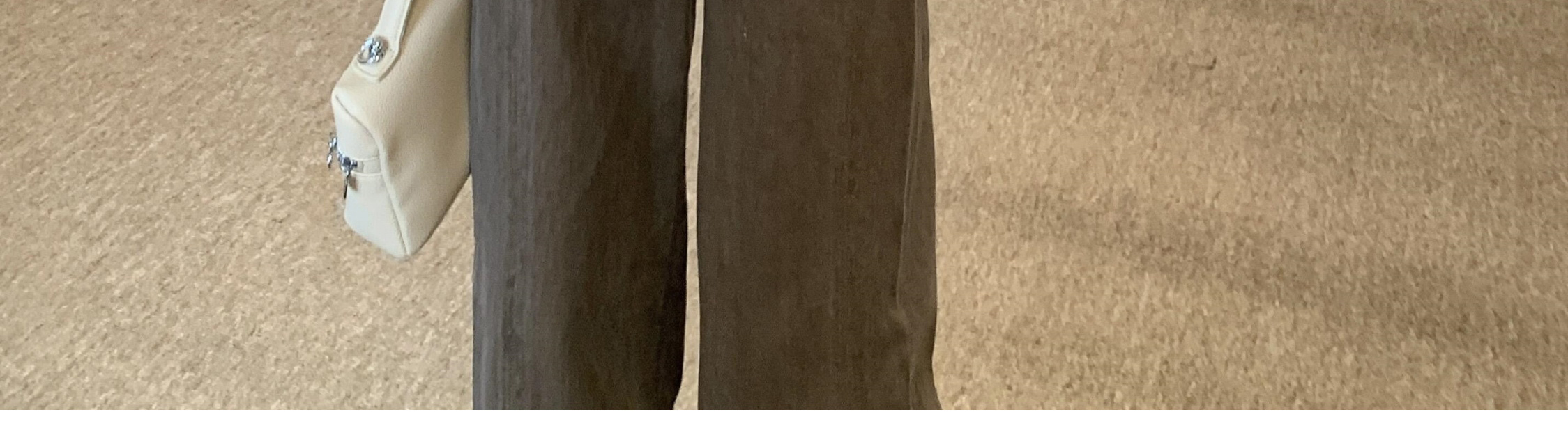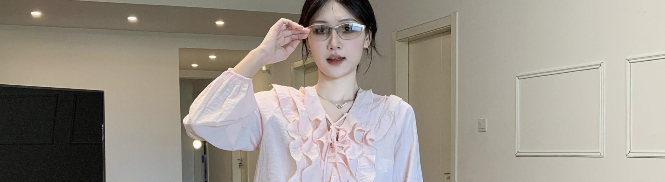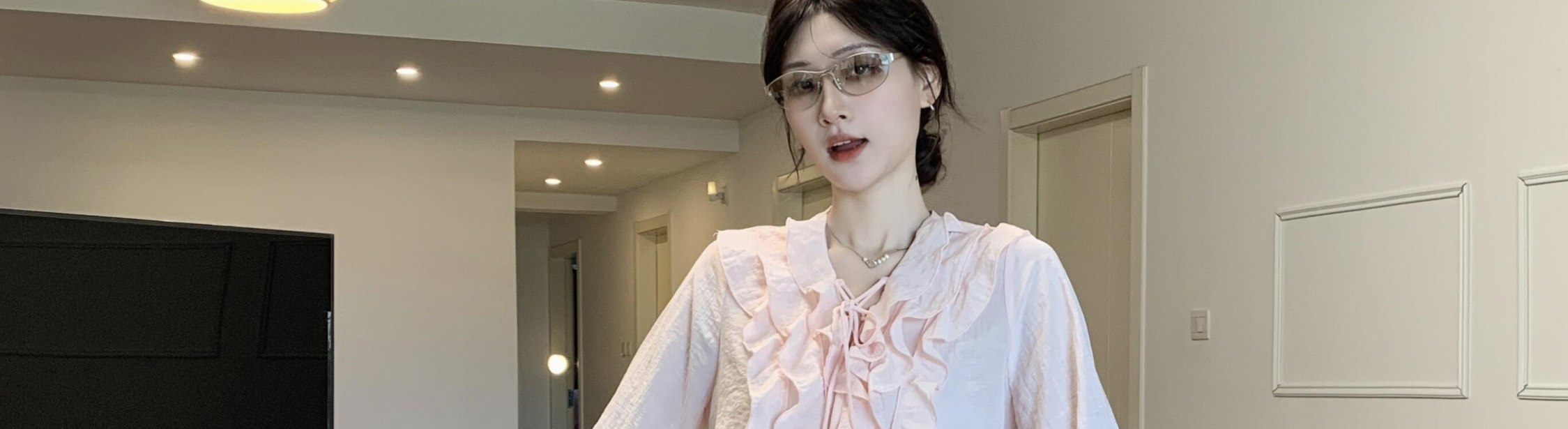 - Top: Loose-fit V-neck blouse with lotus edge detailing, soft autumn fabric, elegant and breathable long sleeves.