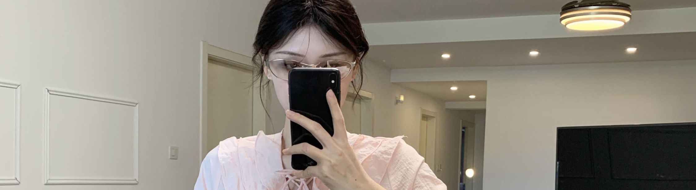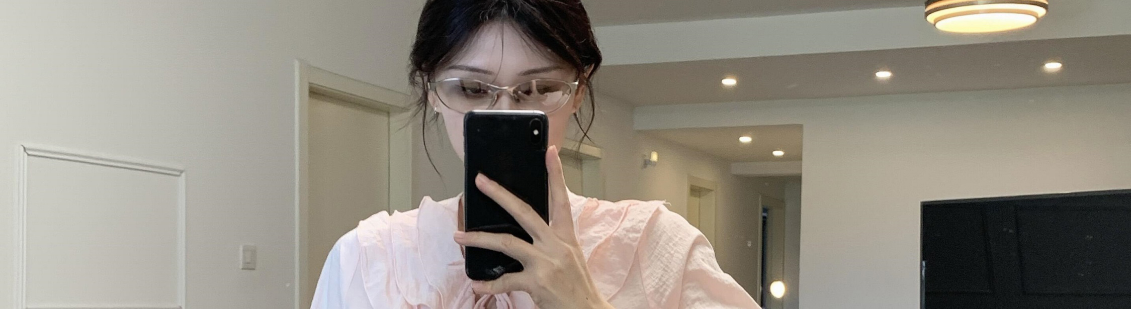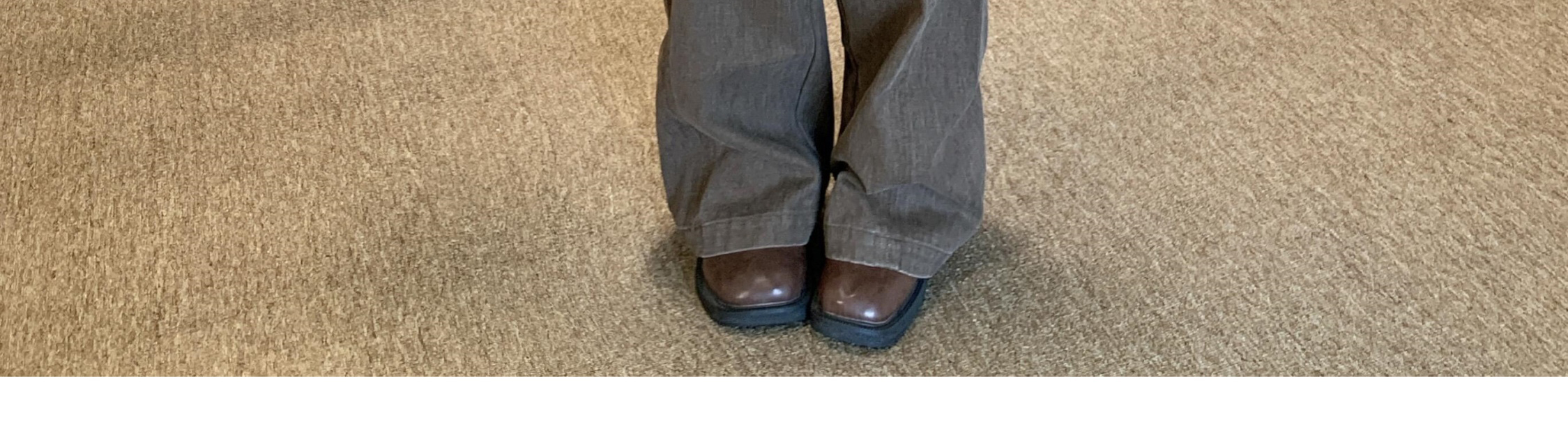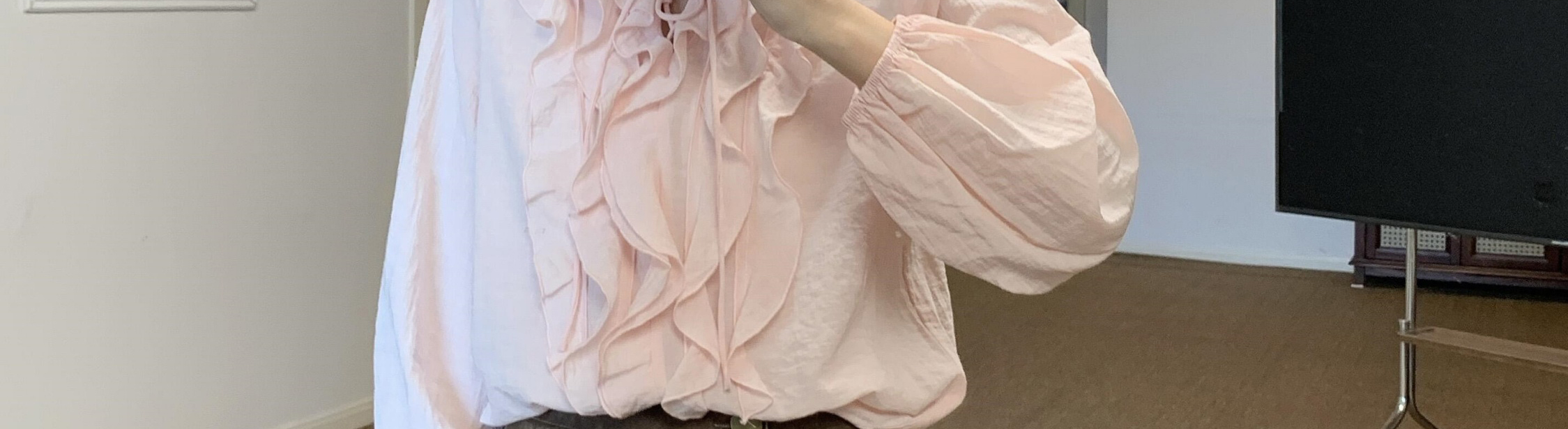 - Top: Loose-fit V-neck blouse with lotus edge detailing, soft autumn fabric, elegant and breathable long sleeves.