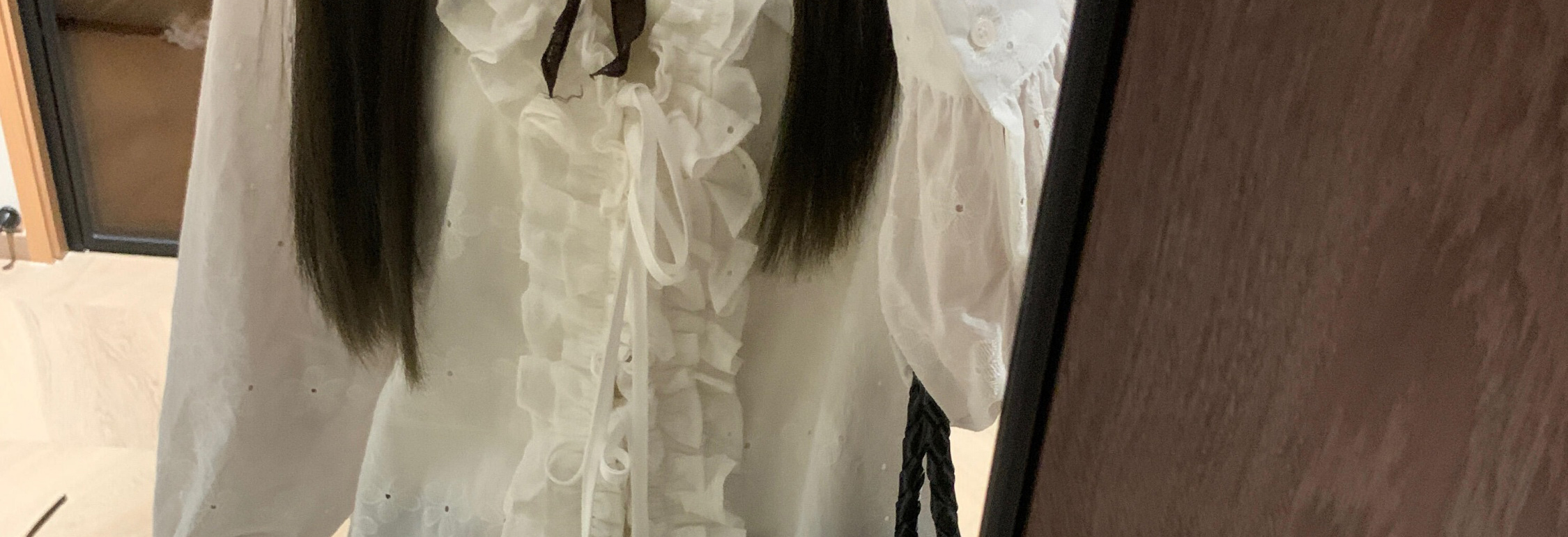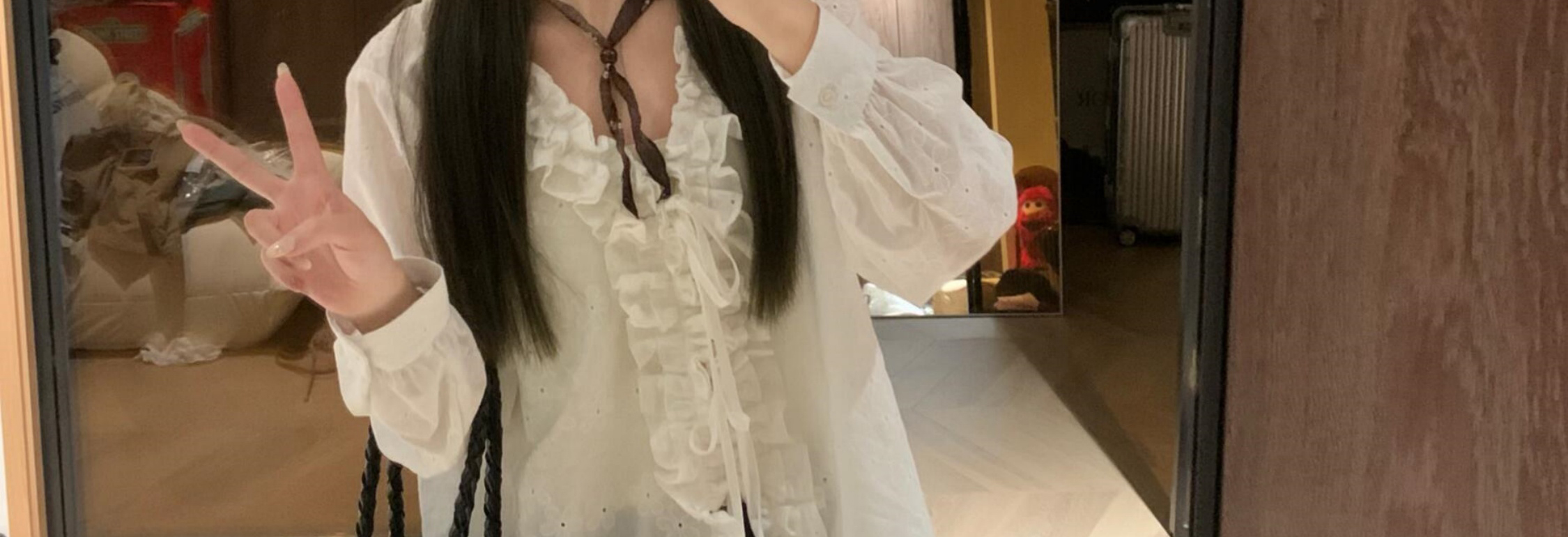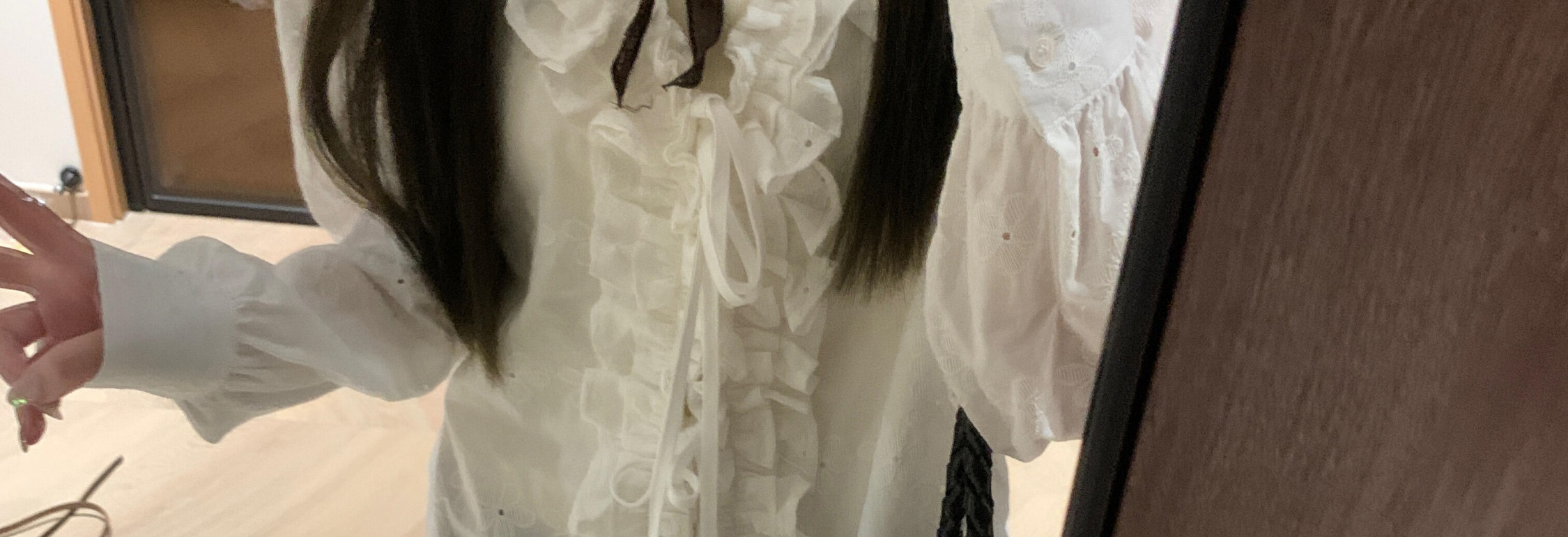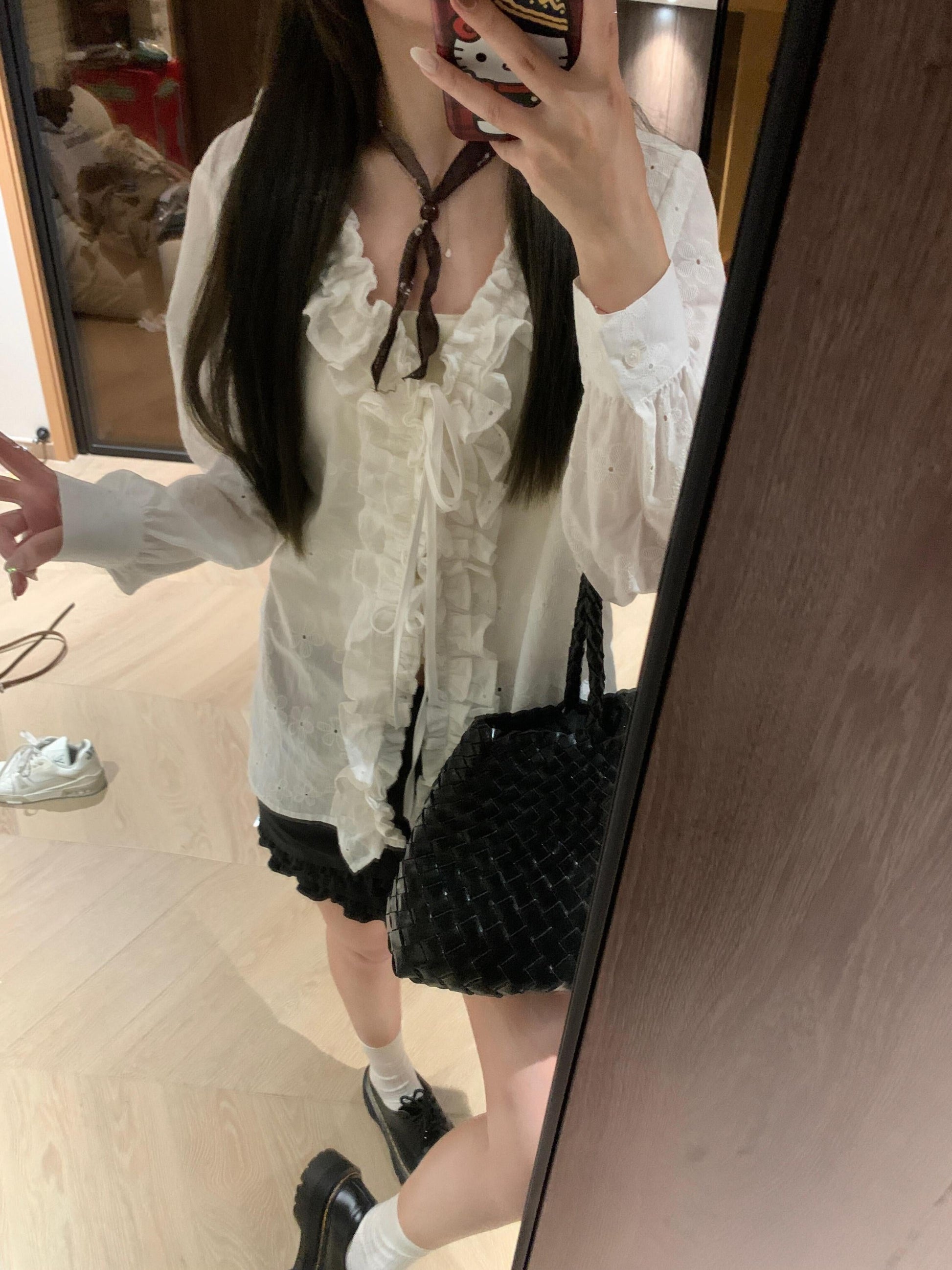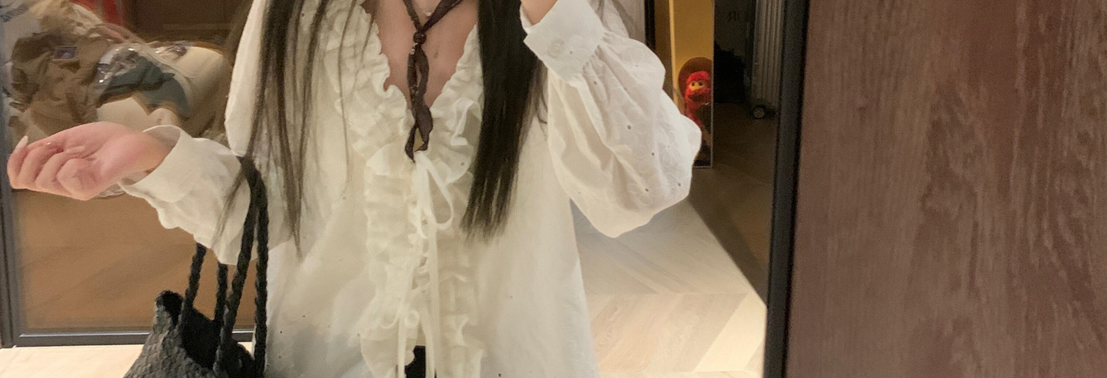 Elegant French-style white blouse with ruffle edges. Loose fit and romantic design for timeless sophistication.