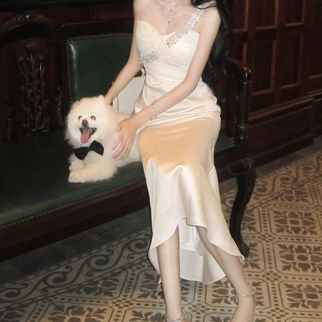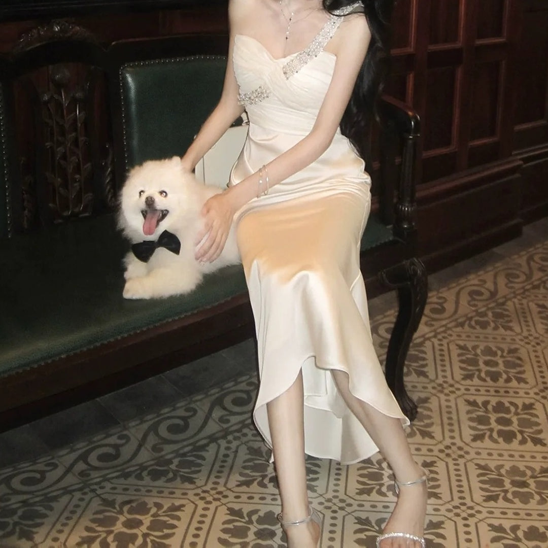 French Small Luxury Satin Asymmetrical Gown Dress – Mermaid Party Dress