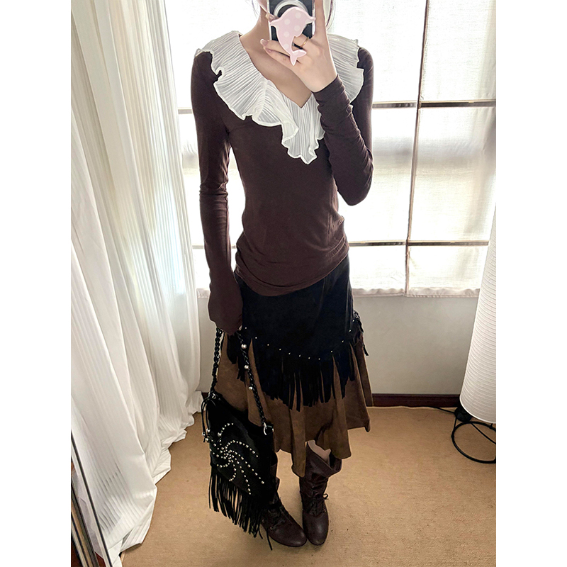 - Top: Long sleeve tee with lace V-neck, color-blocked design, slim fit and soft fabric.