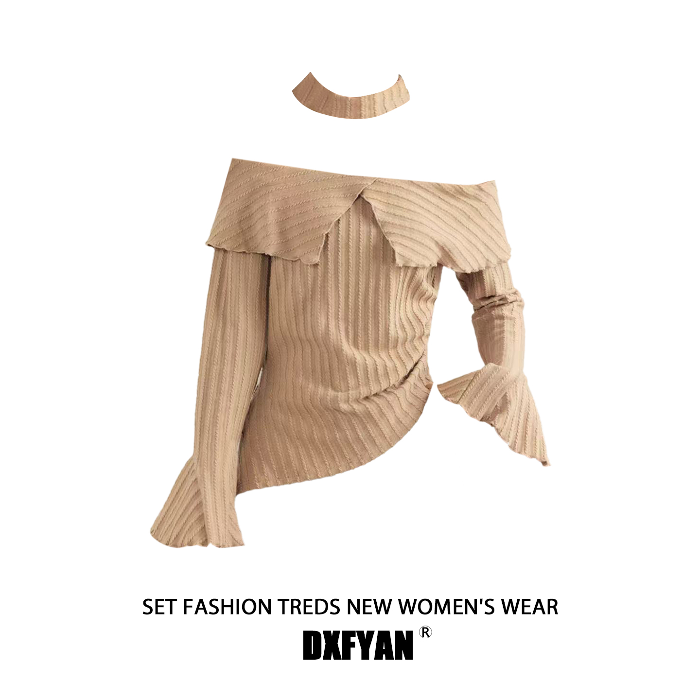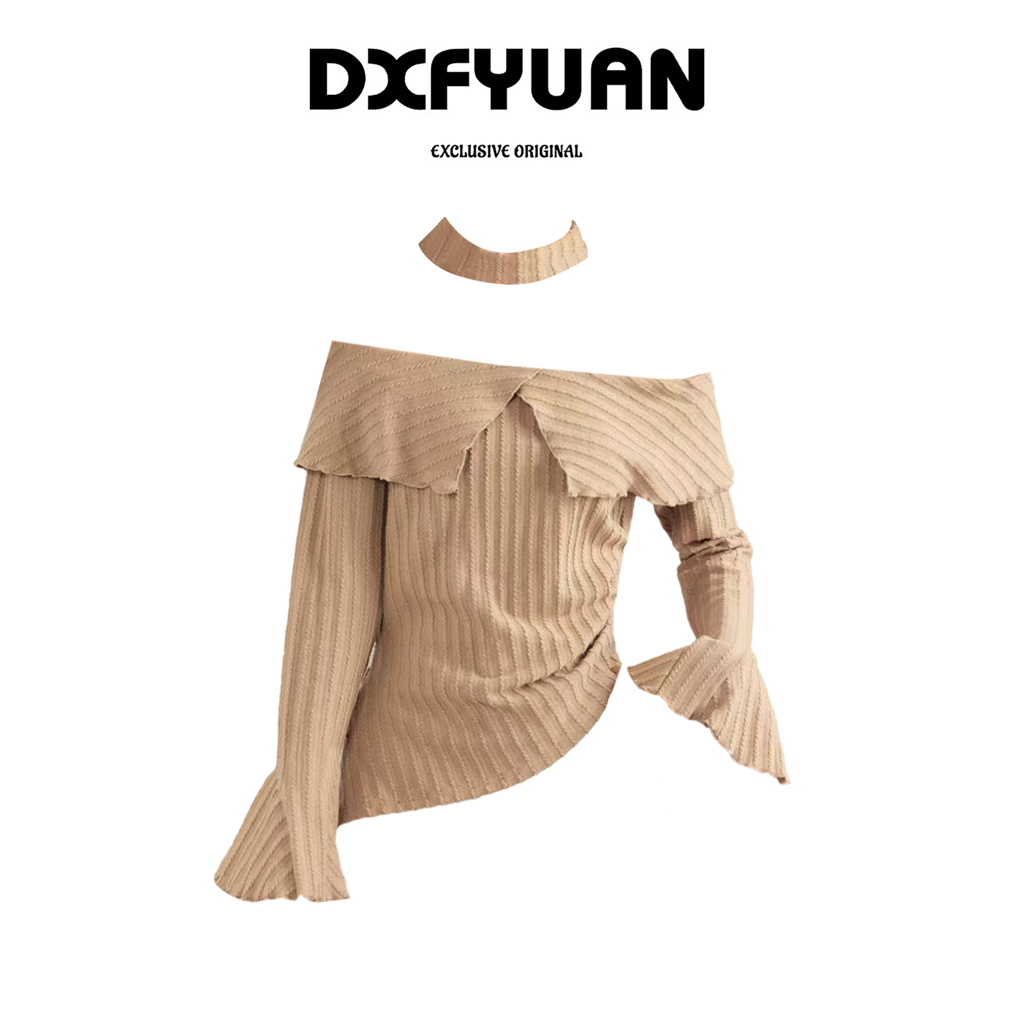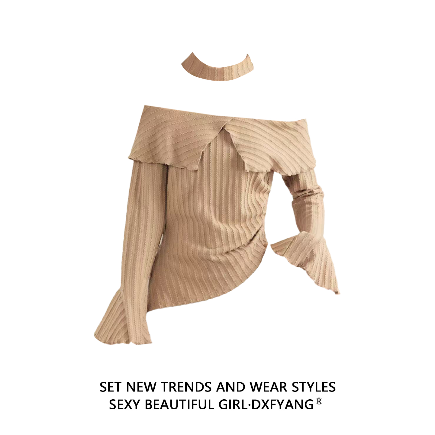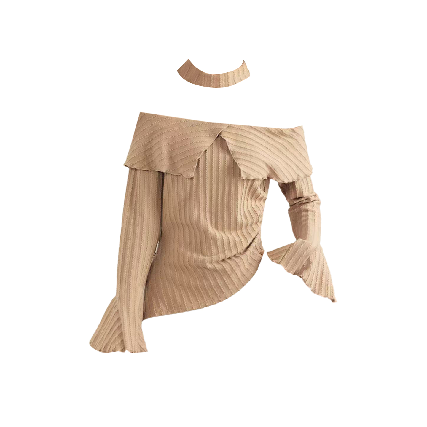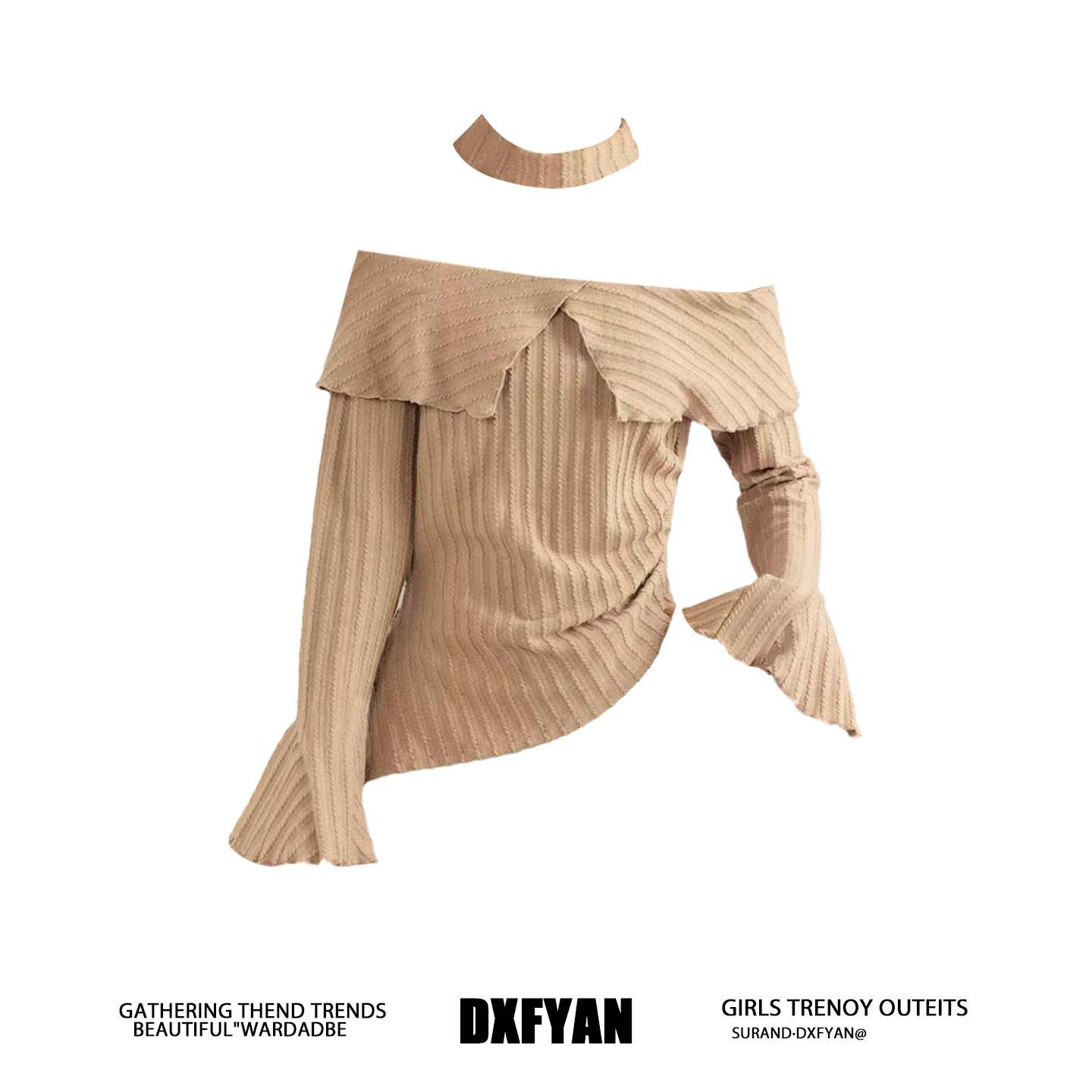 - Top: Slim-fit long-sleeve tee with off-shoulder ruffle detail and halter design, soft autumn-winter fabric.