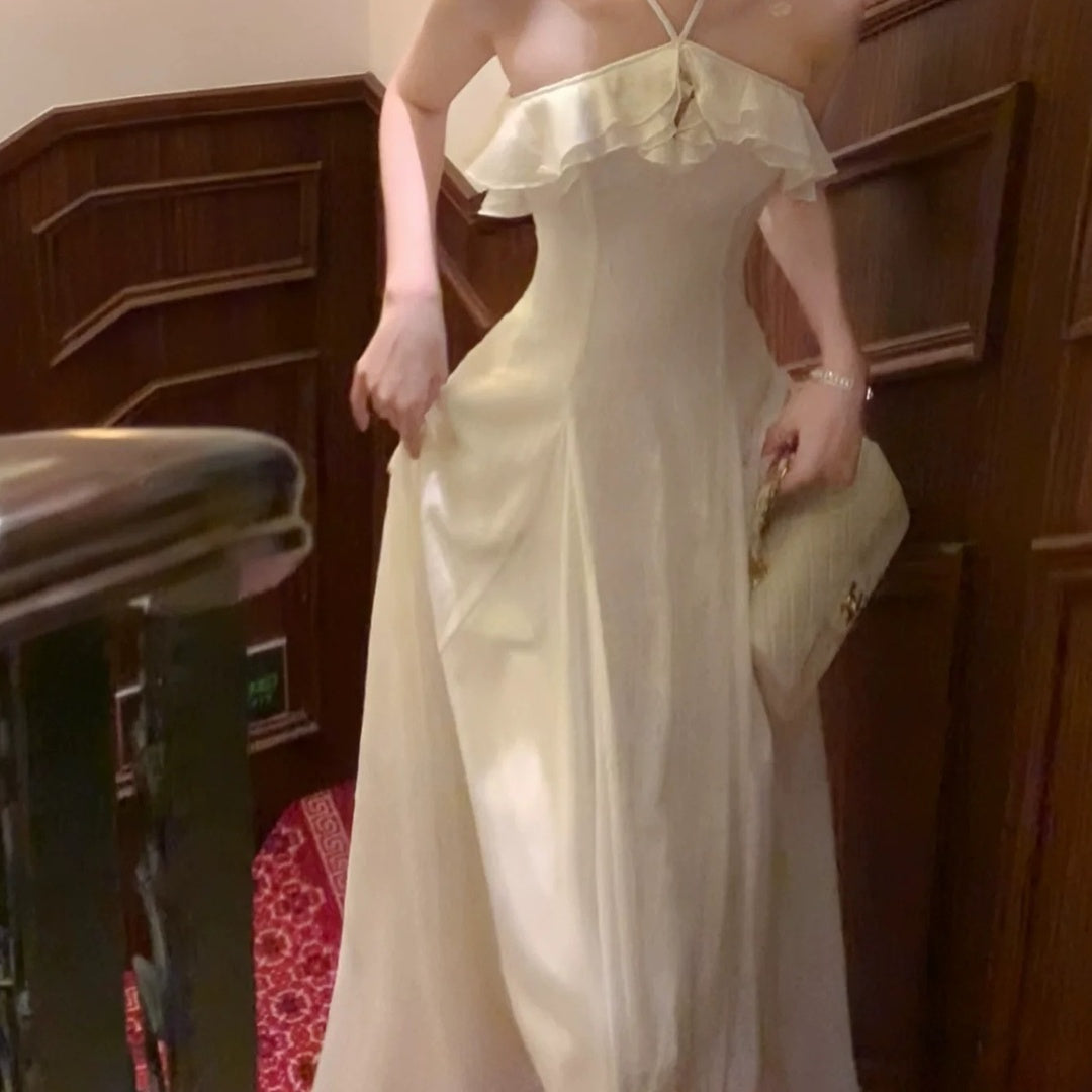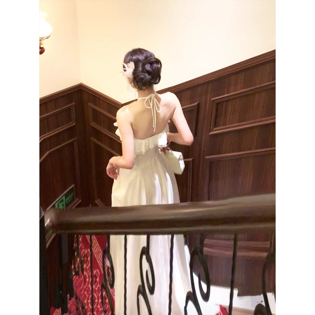 French White Halter Neck Pleated Gown Dress – Ruffled Waist Evening Dress