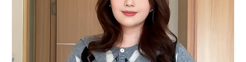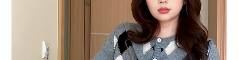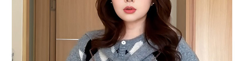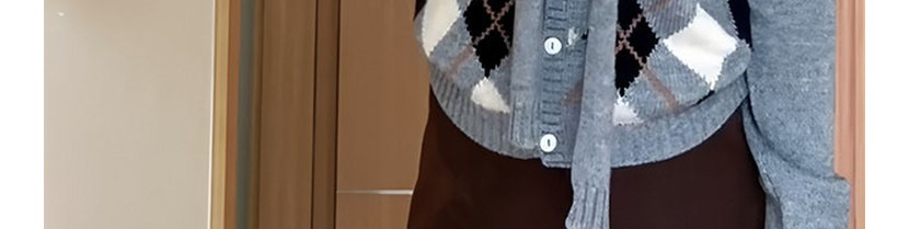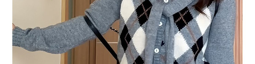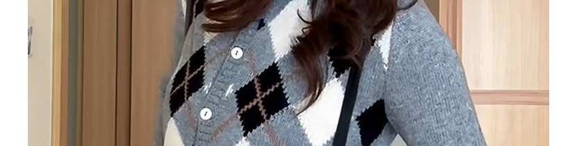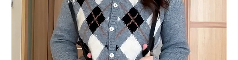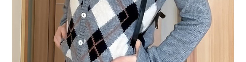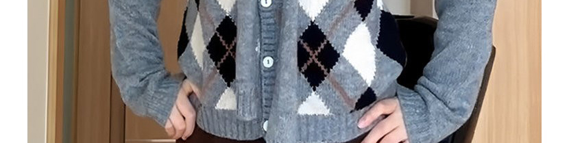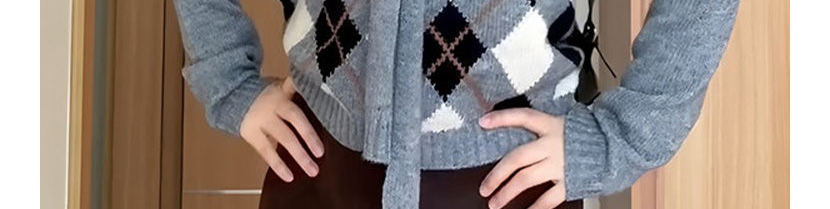Korean-style gray diamond knit cardigan. Shoulder design, slim fit, perfect for autumn casual or school outfits.