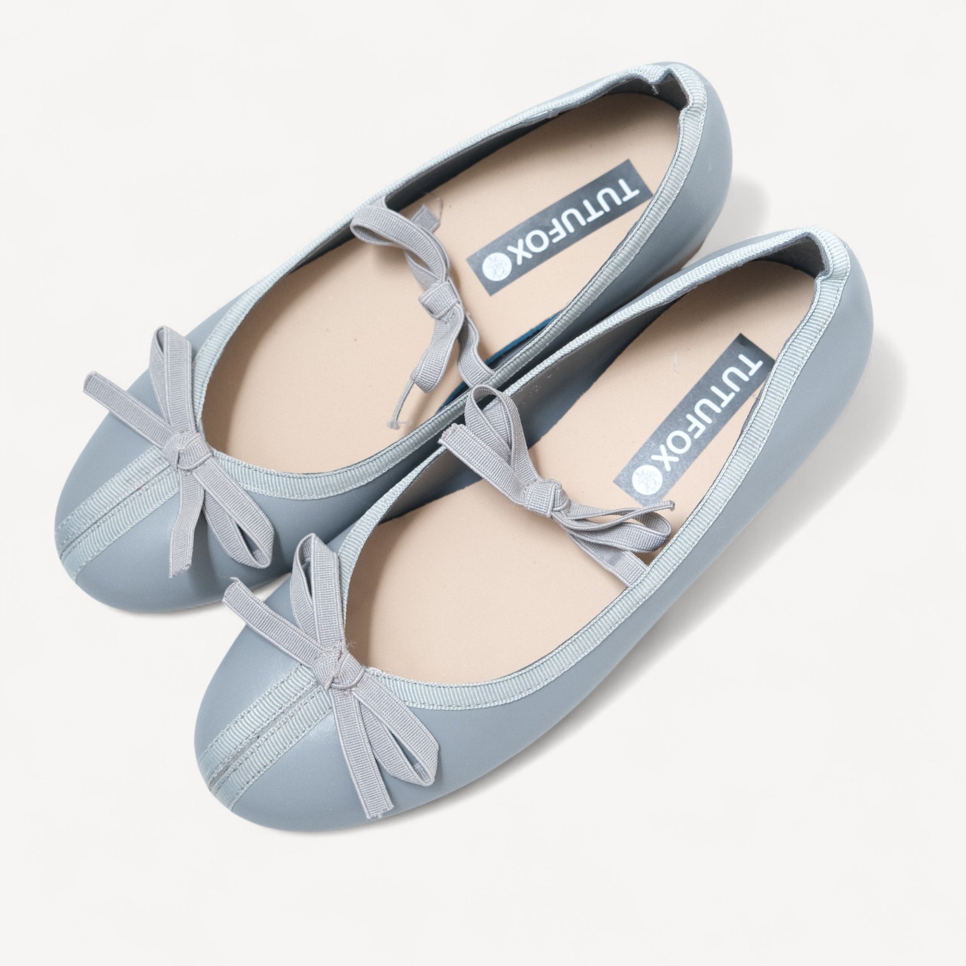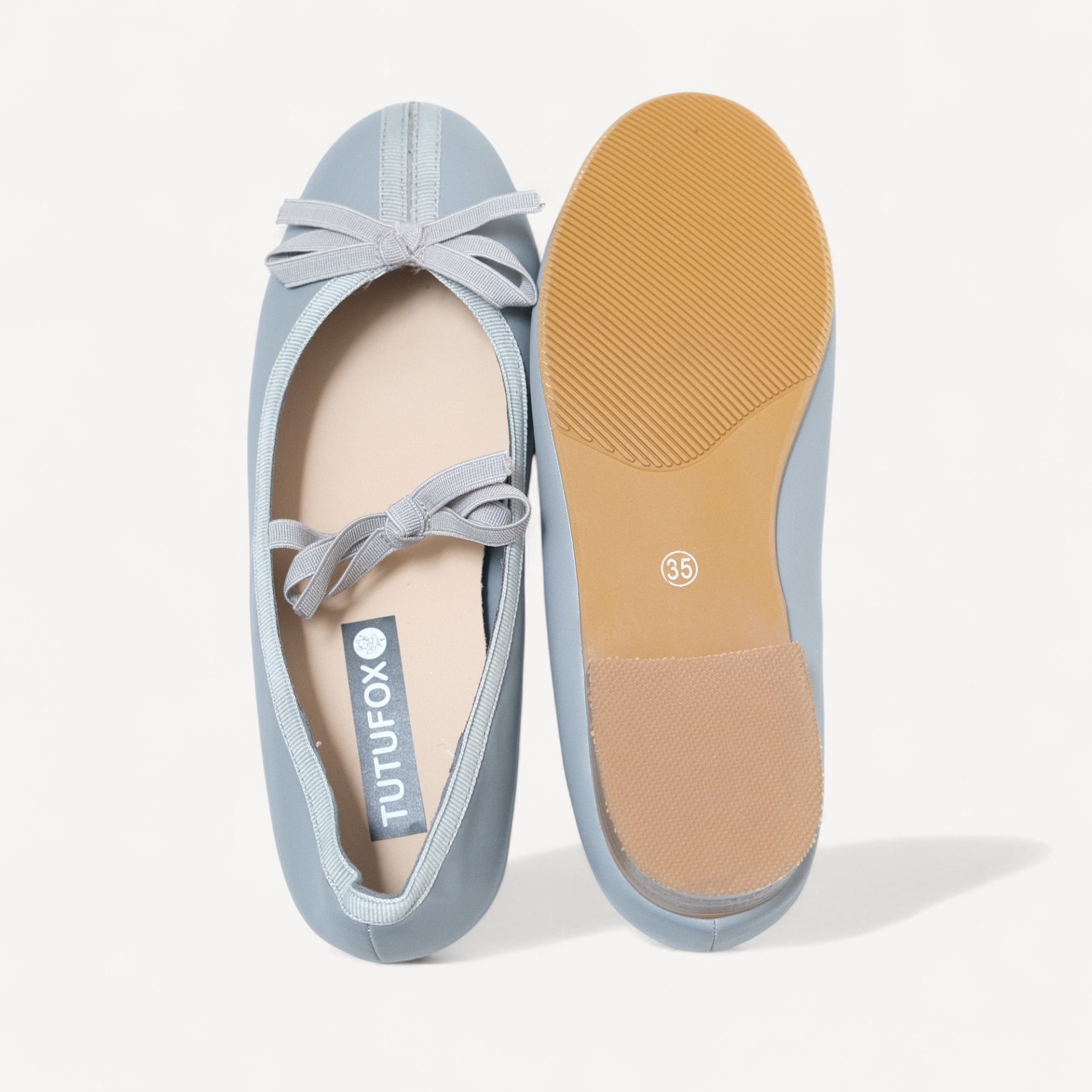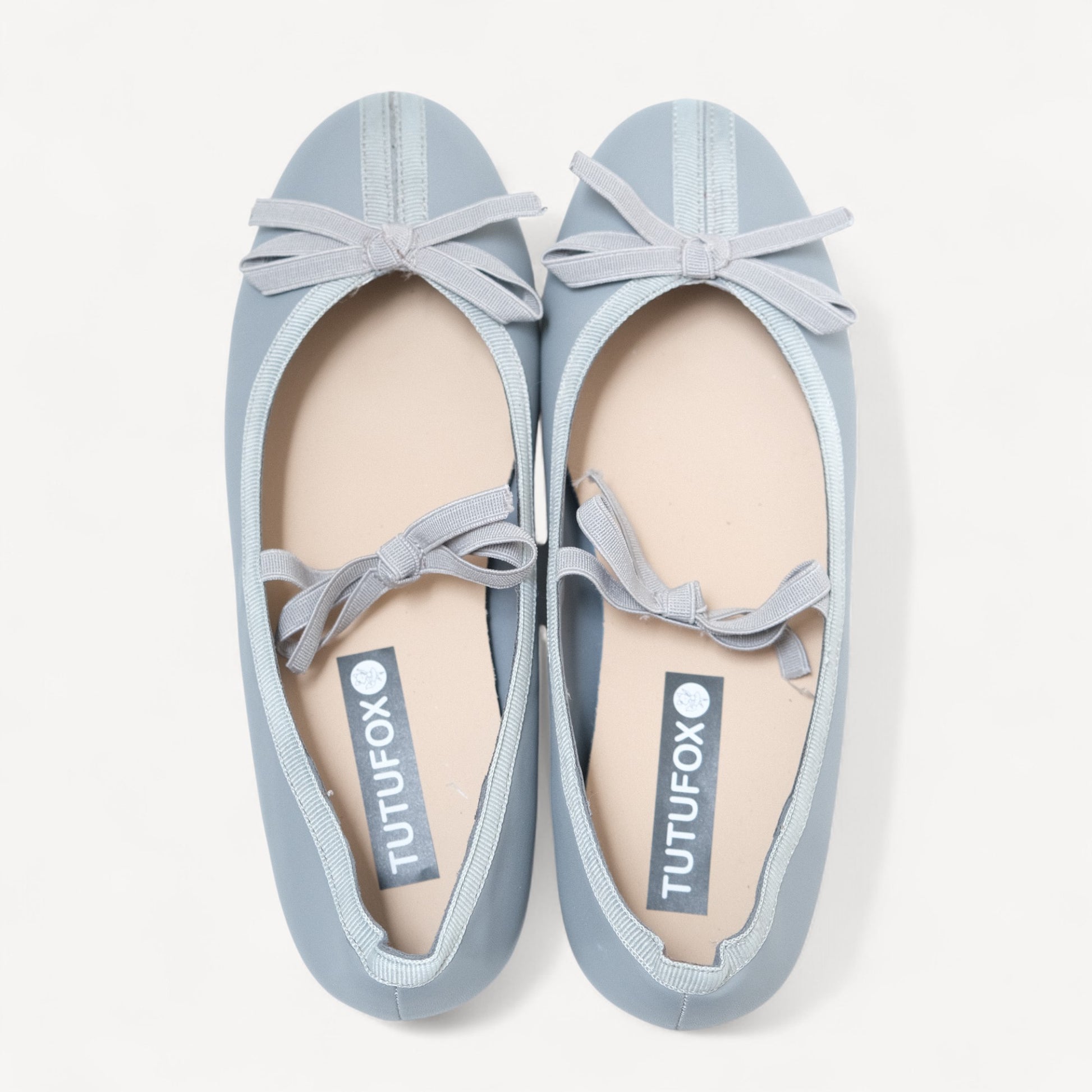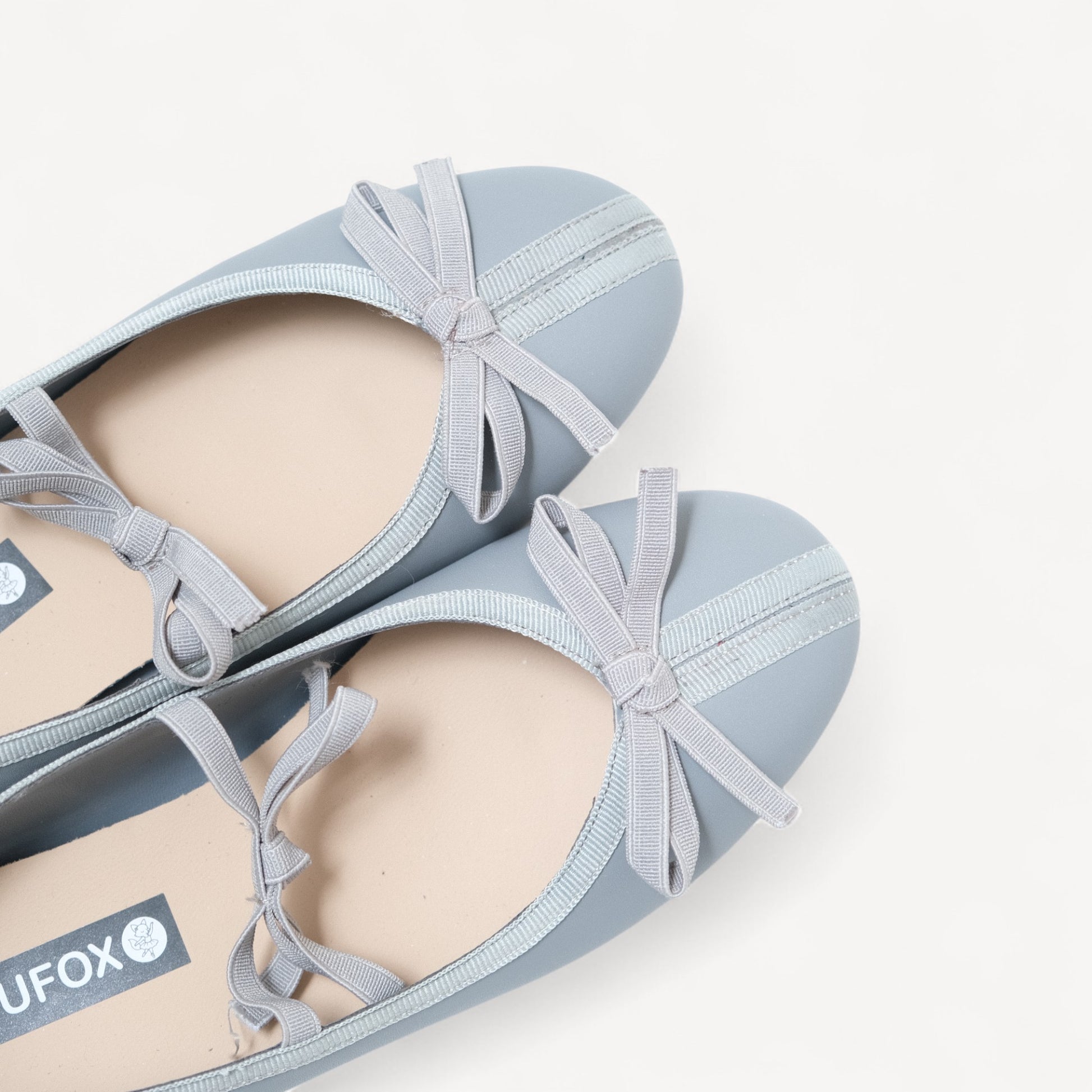 Chic and versatile, these gray matte ballet flats feature almond toes with delicate bow details for a timeless feminine touch. The elastic strap ensures comfort and a secure fit, making them perfect for everyday wear.