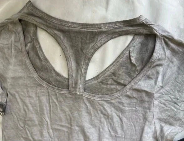 - Top: Gray short sleeve top with American retro prints, strategic cutouts, and open-back design, blending punk edge and Y2K "Abi" subculture vibes. Playful yet edgy.