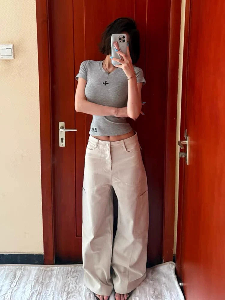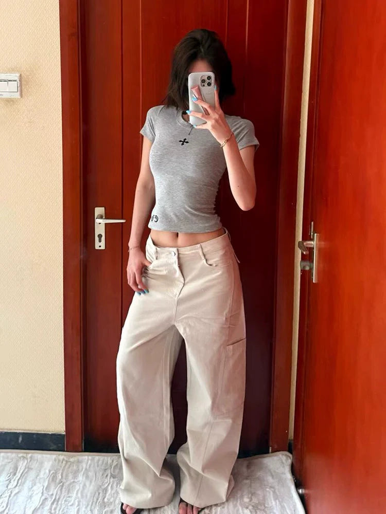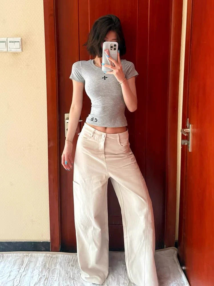 - Top: Gray short sleeve top with American retro cross prints, blending Y2K "Abi" light subculture and retro charm. Soft tone for versatile summer wear.