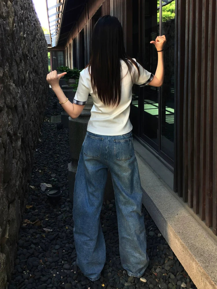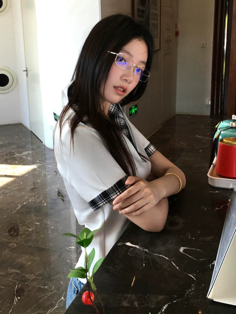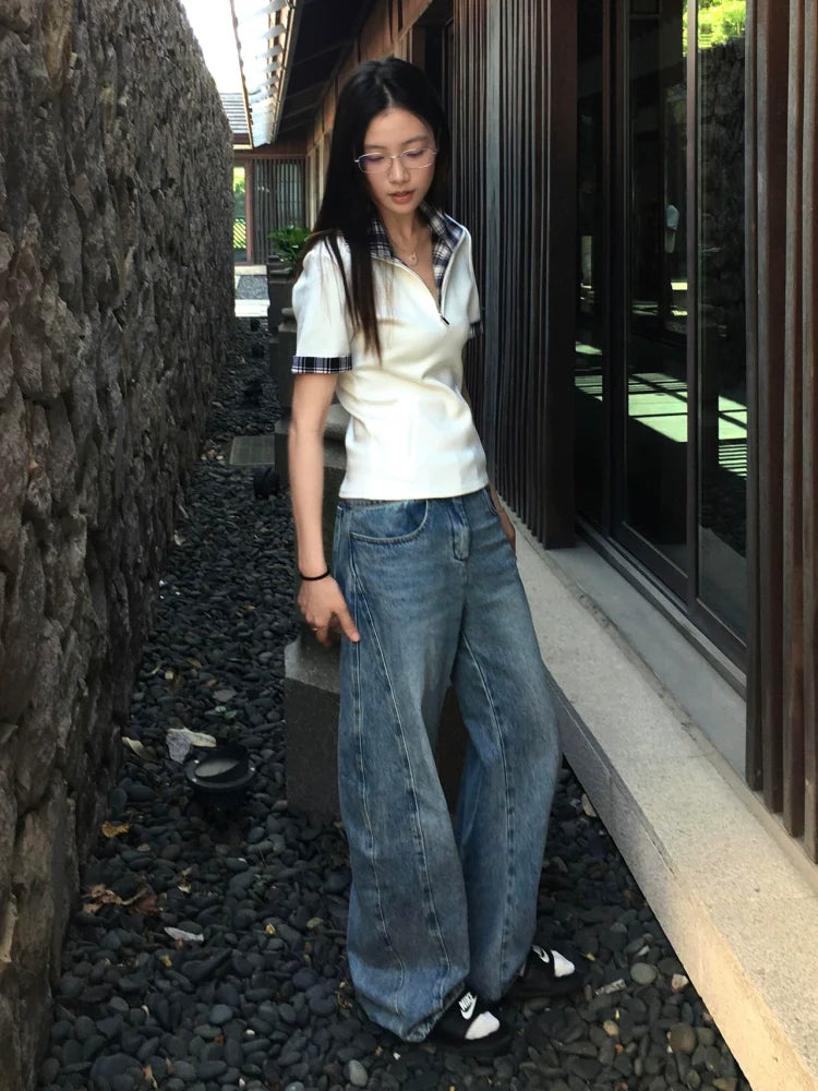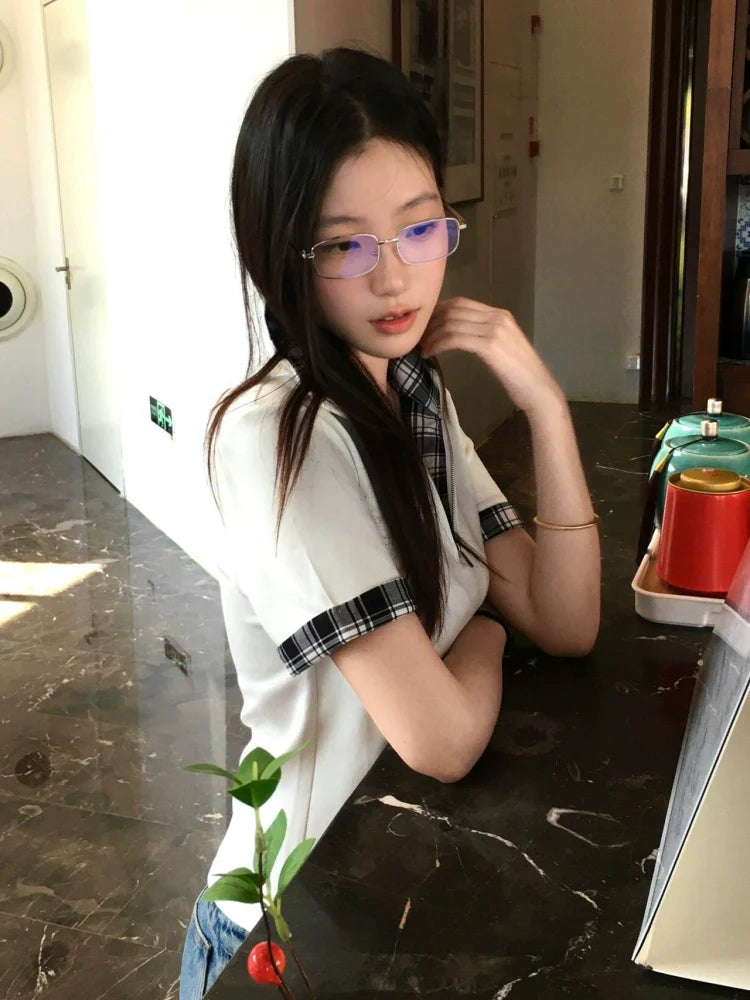- Top: Summer short sleeve half-zip polo tee with plaid patchwork, fitted cut, white fabric, layered Y2K aesthetic, unique design.