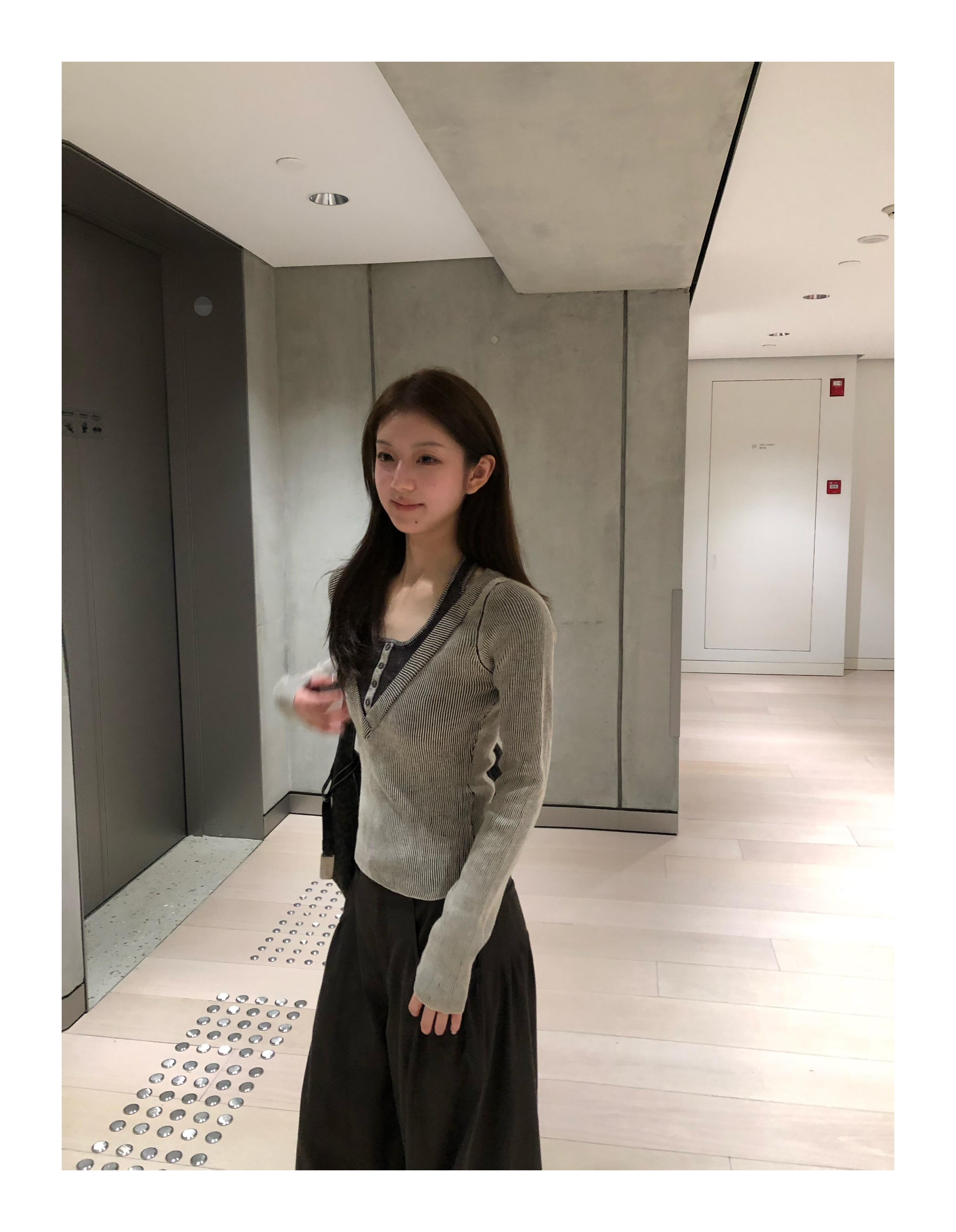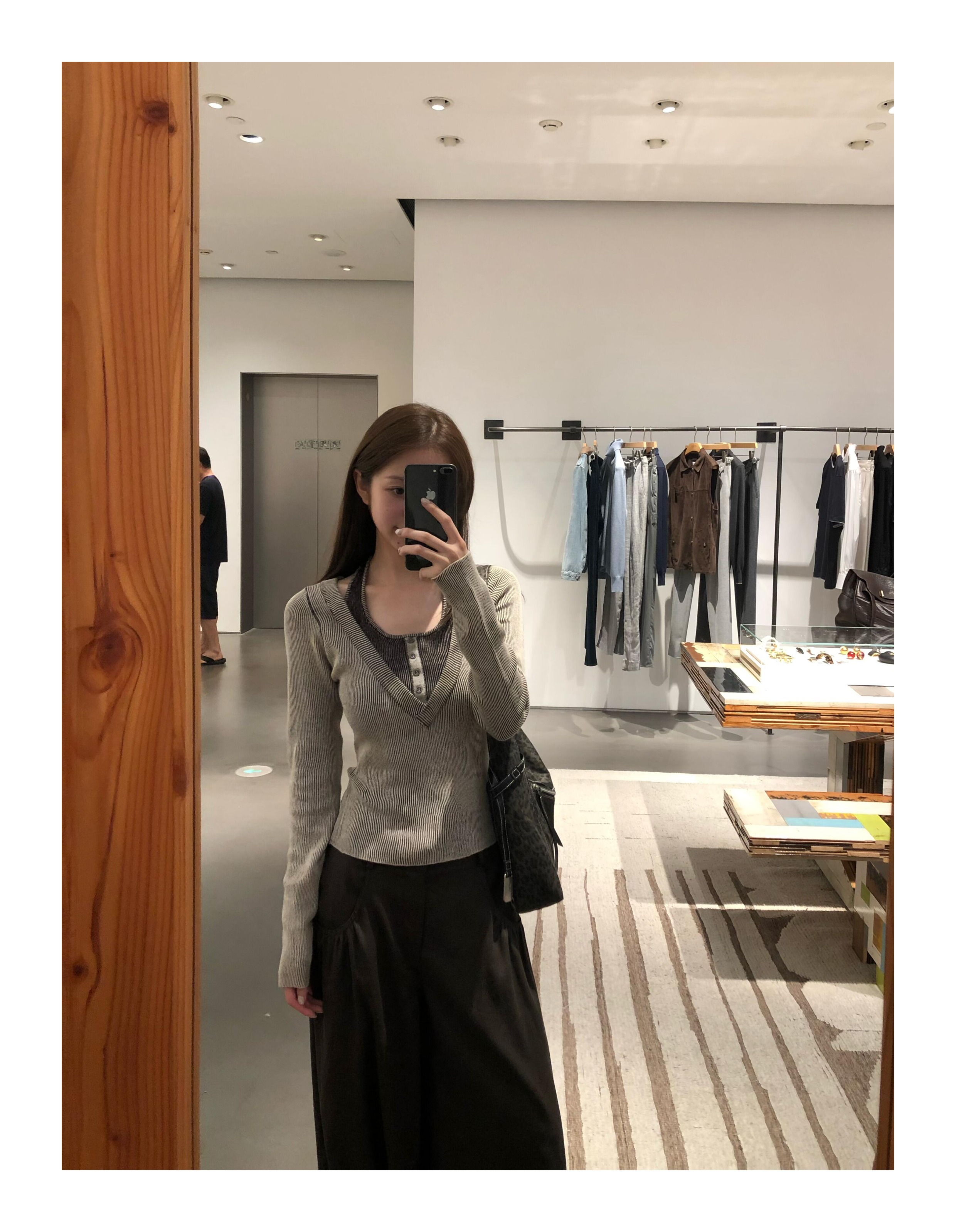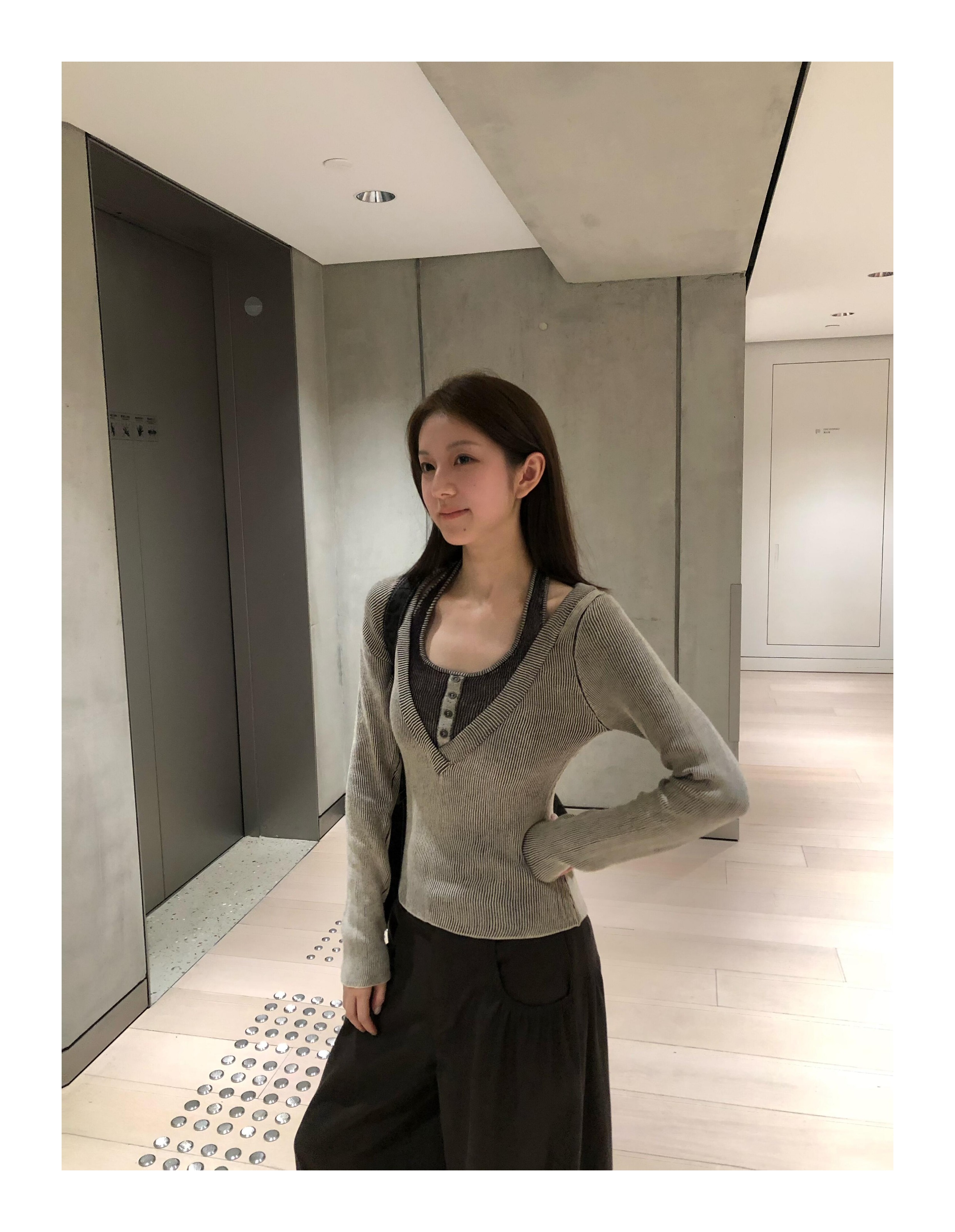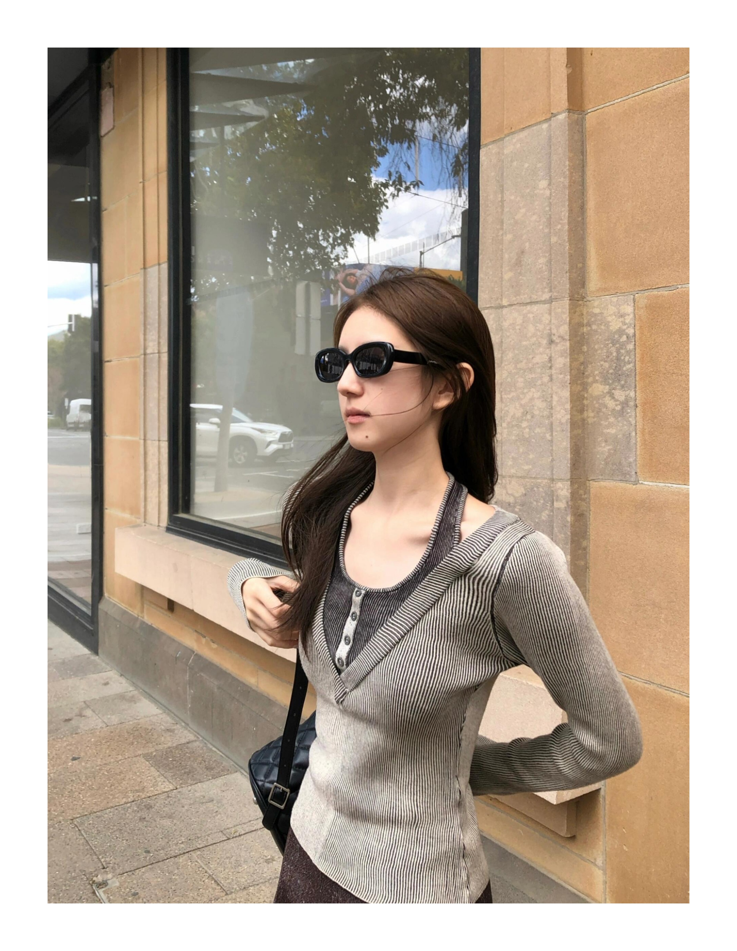 Halter V-neck knit top with layered look. Slim fit, spicy girl style for early autumn.