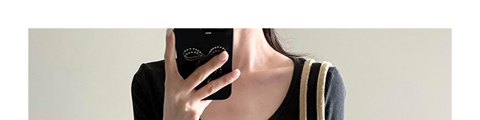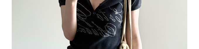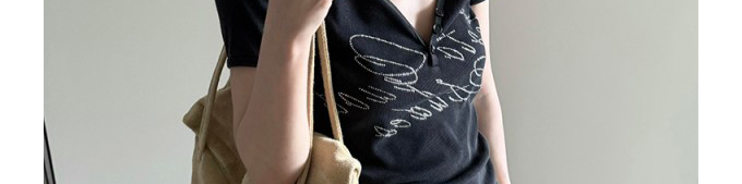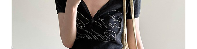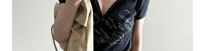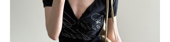 - Top: Slim-fit short sleeve T-shirt with heart neckline and rhinestone lettering design.