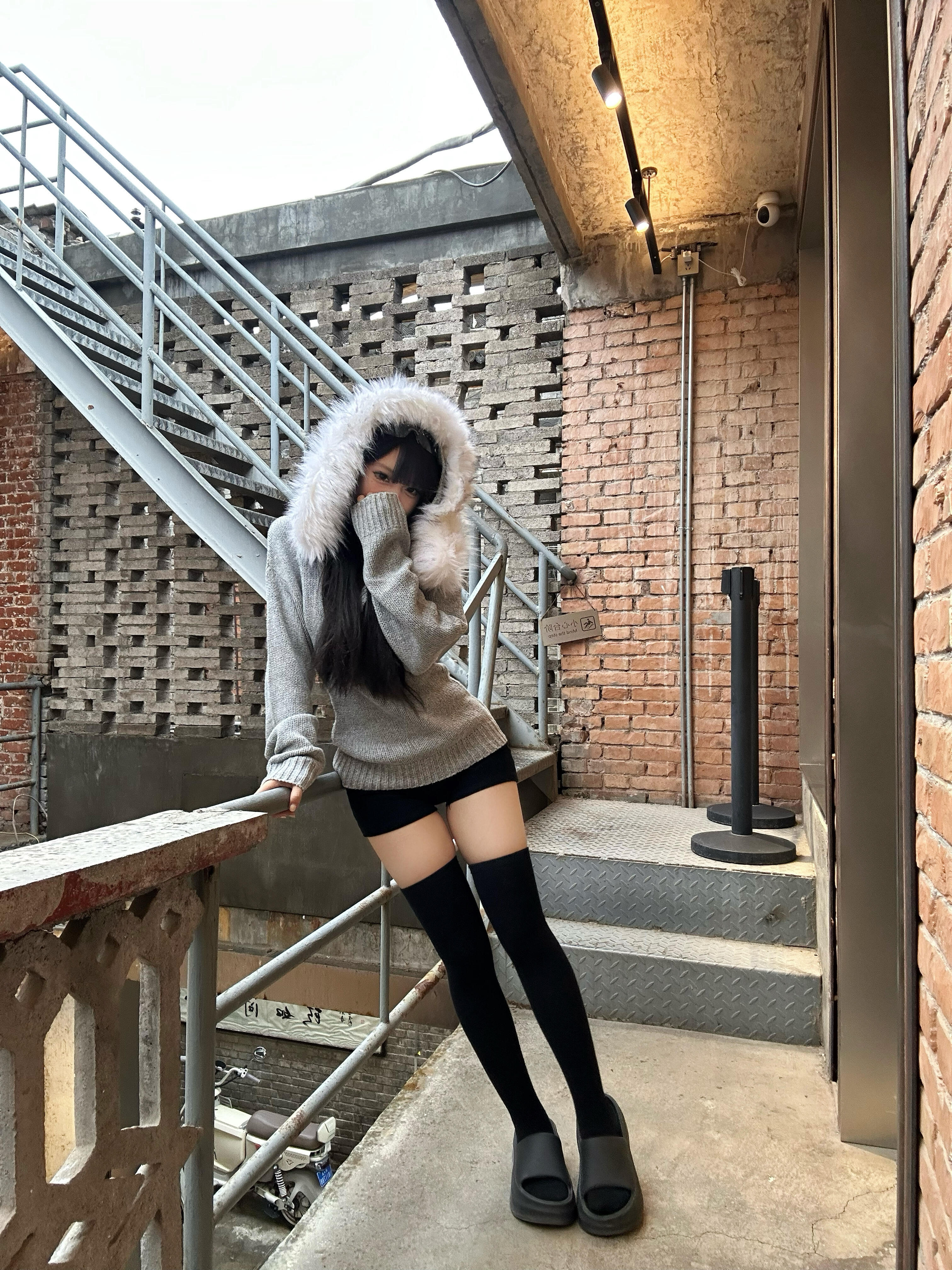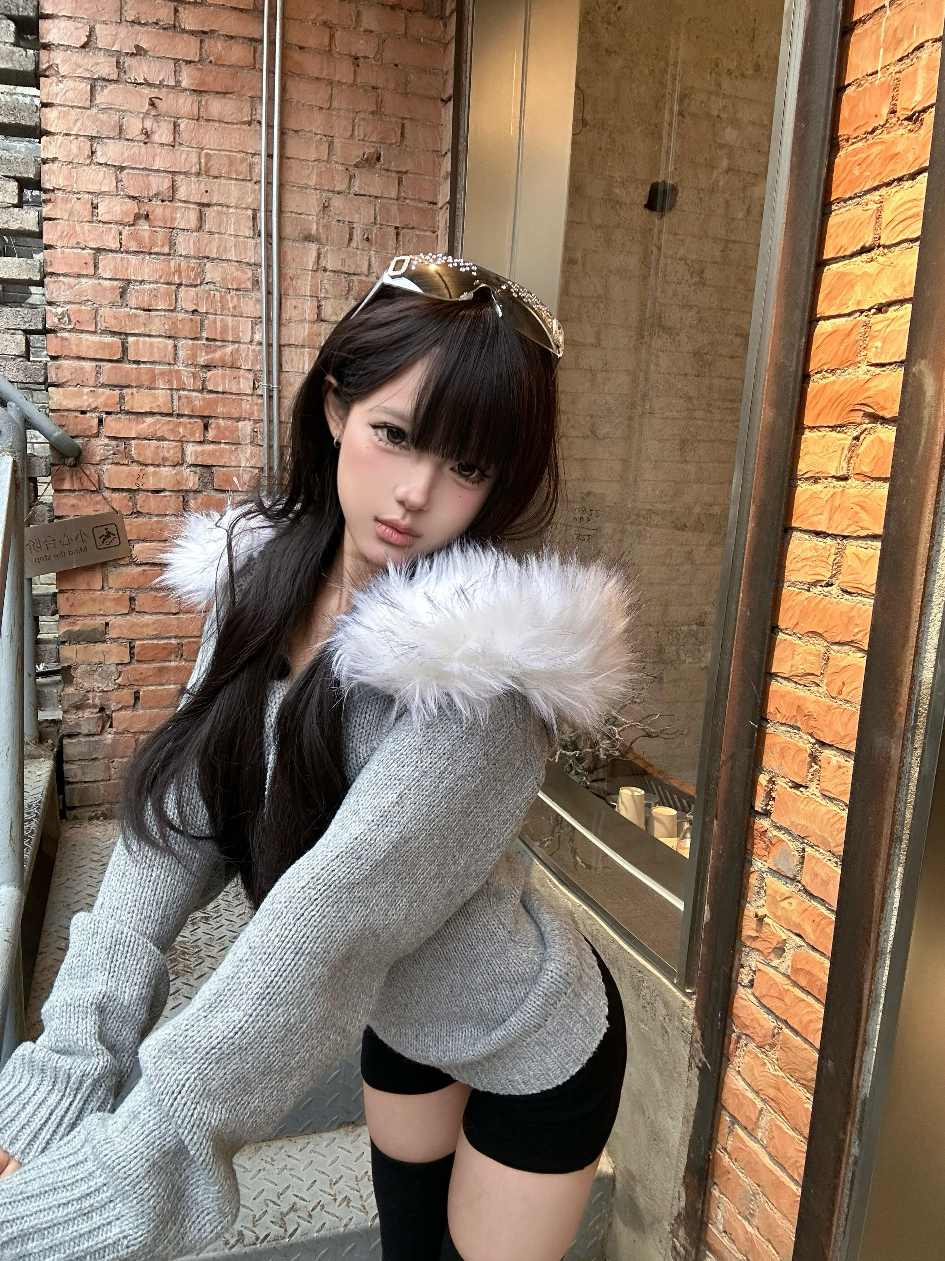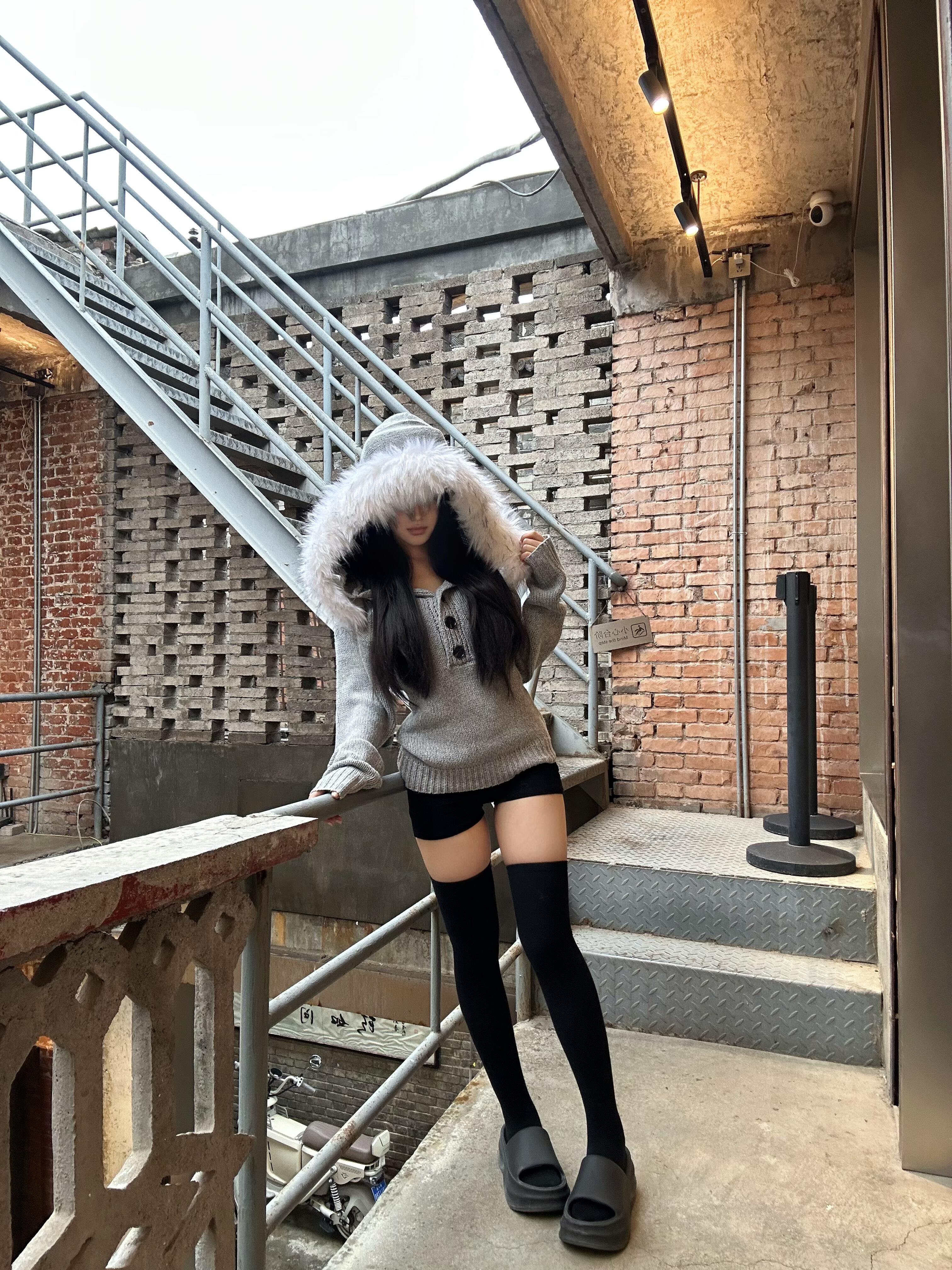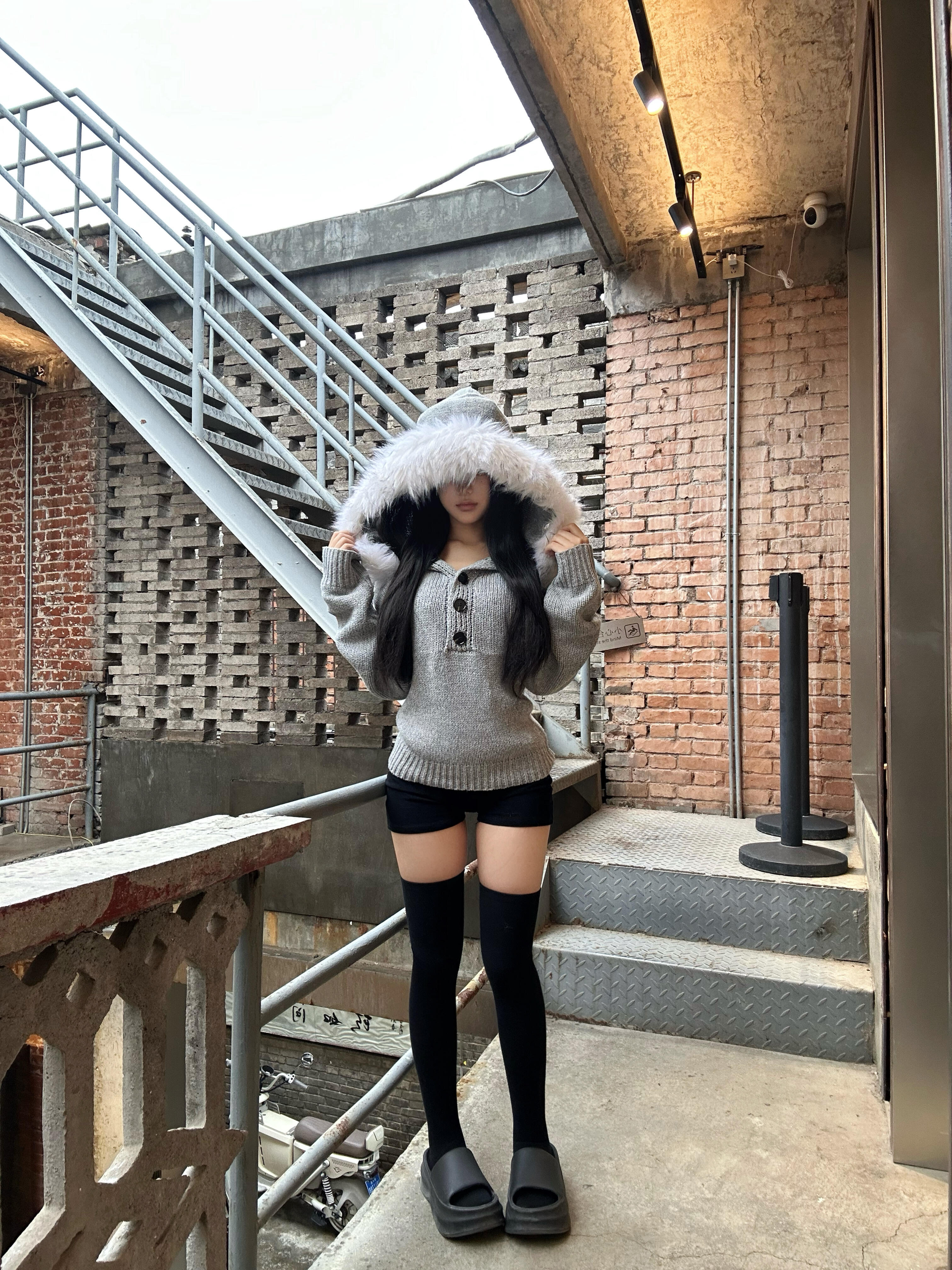 Retro Henley knit hoodie with detachable fur collar. Soft and cozy, offering flexible autumn styling.