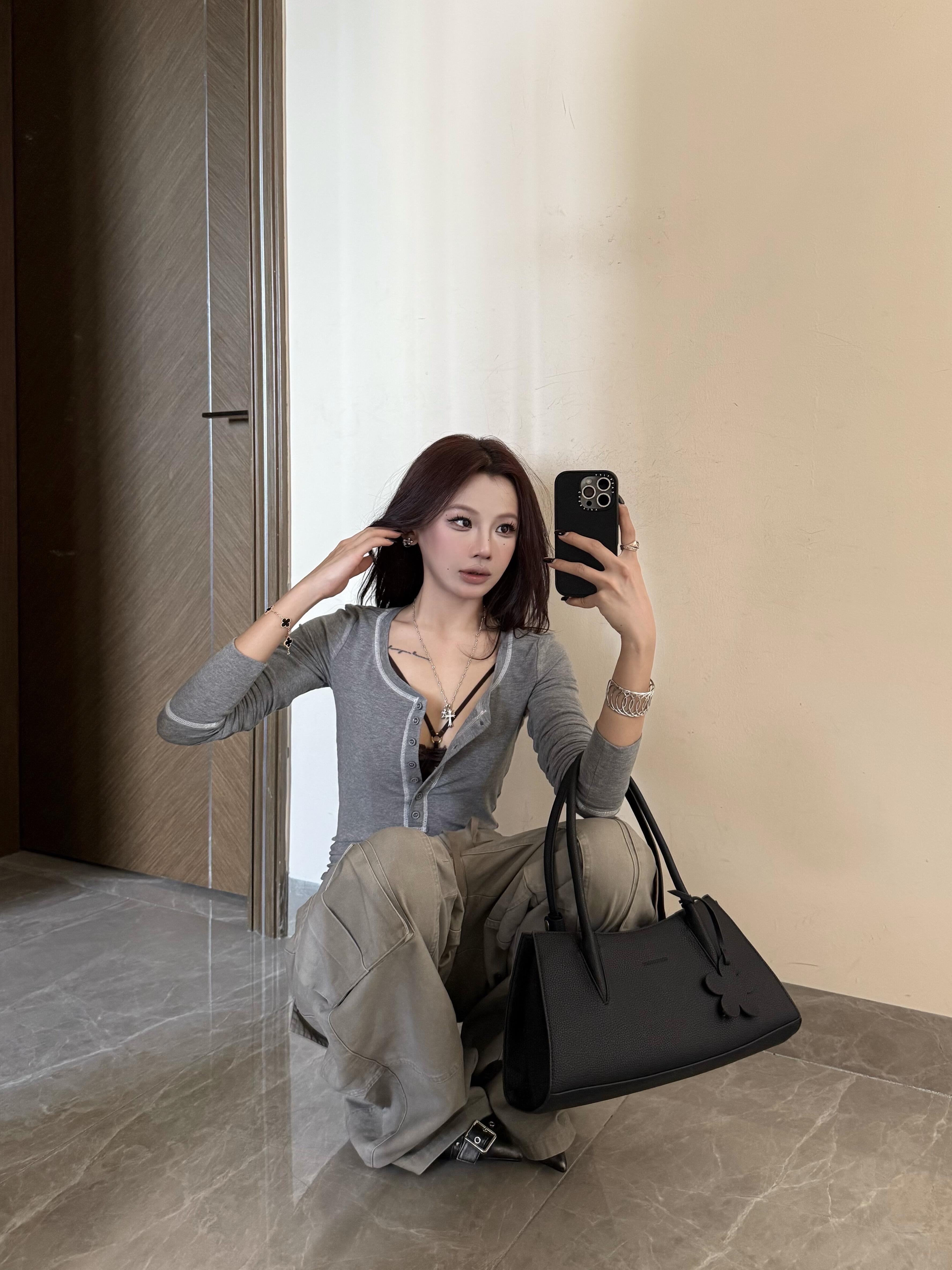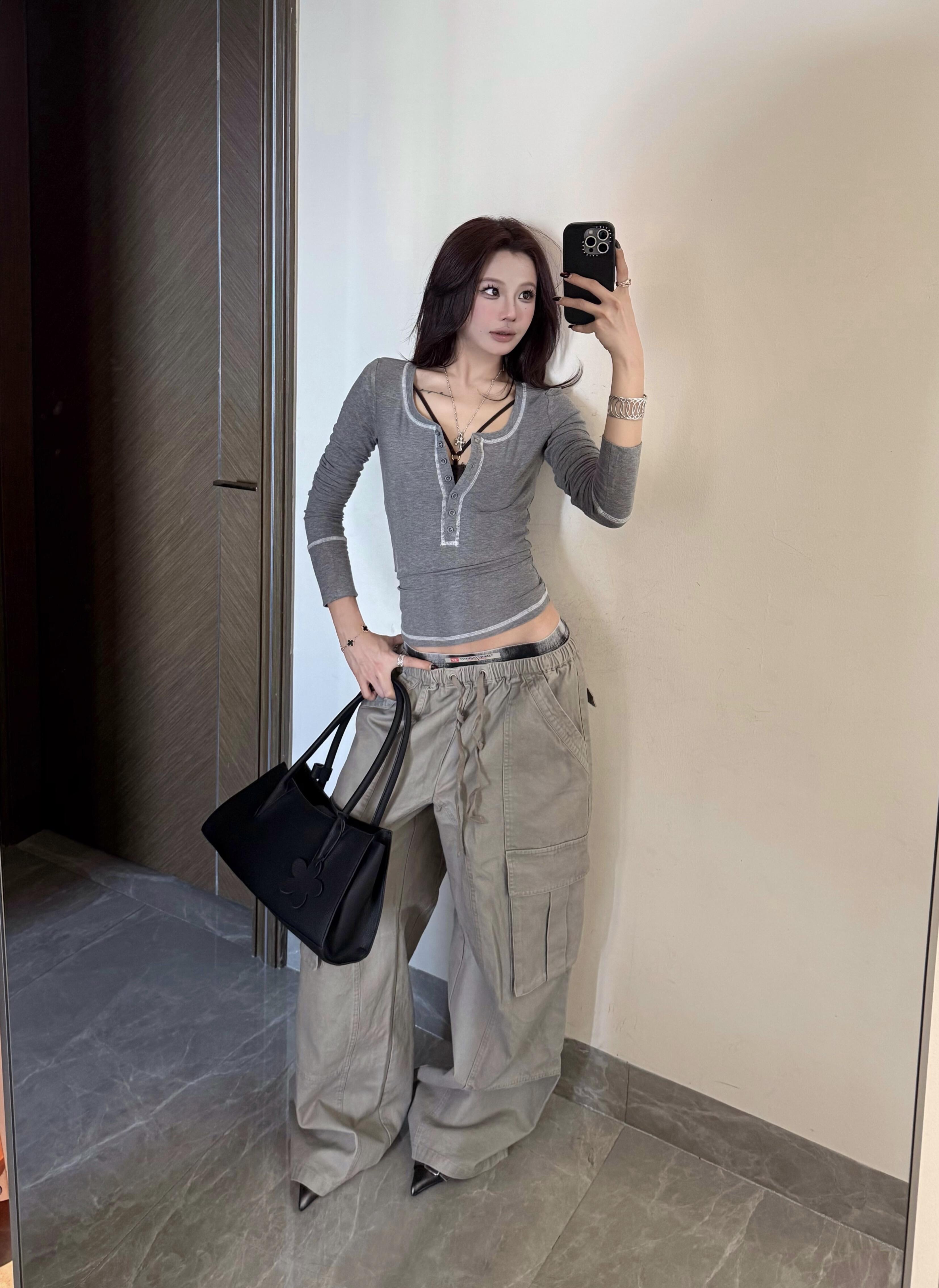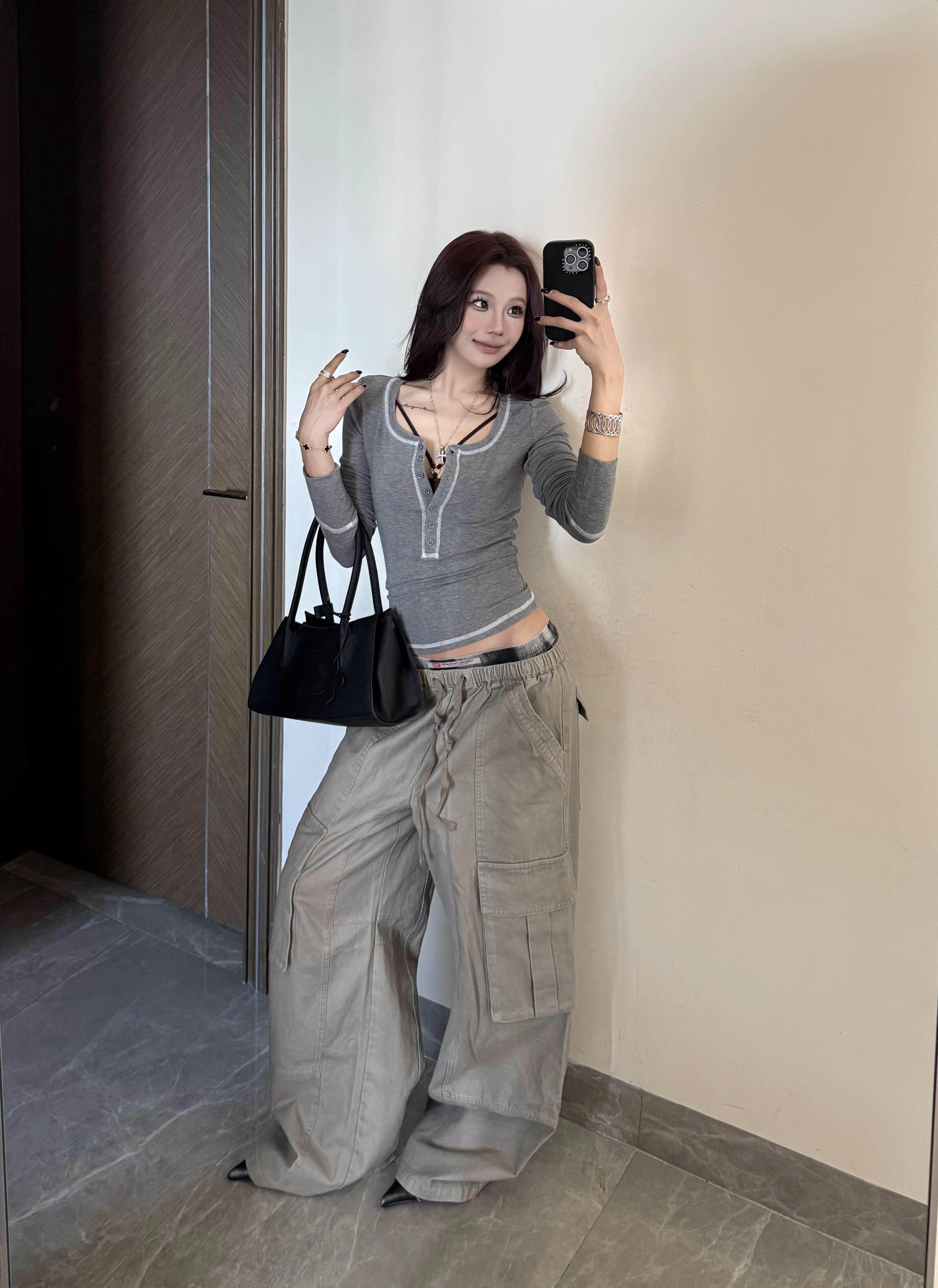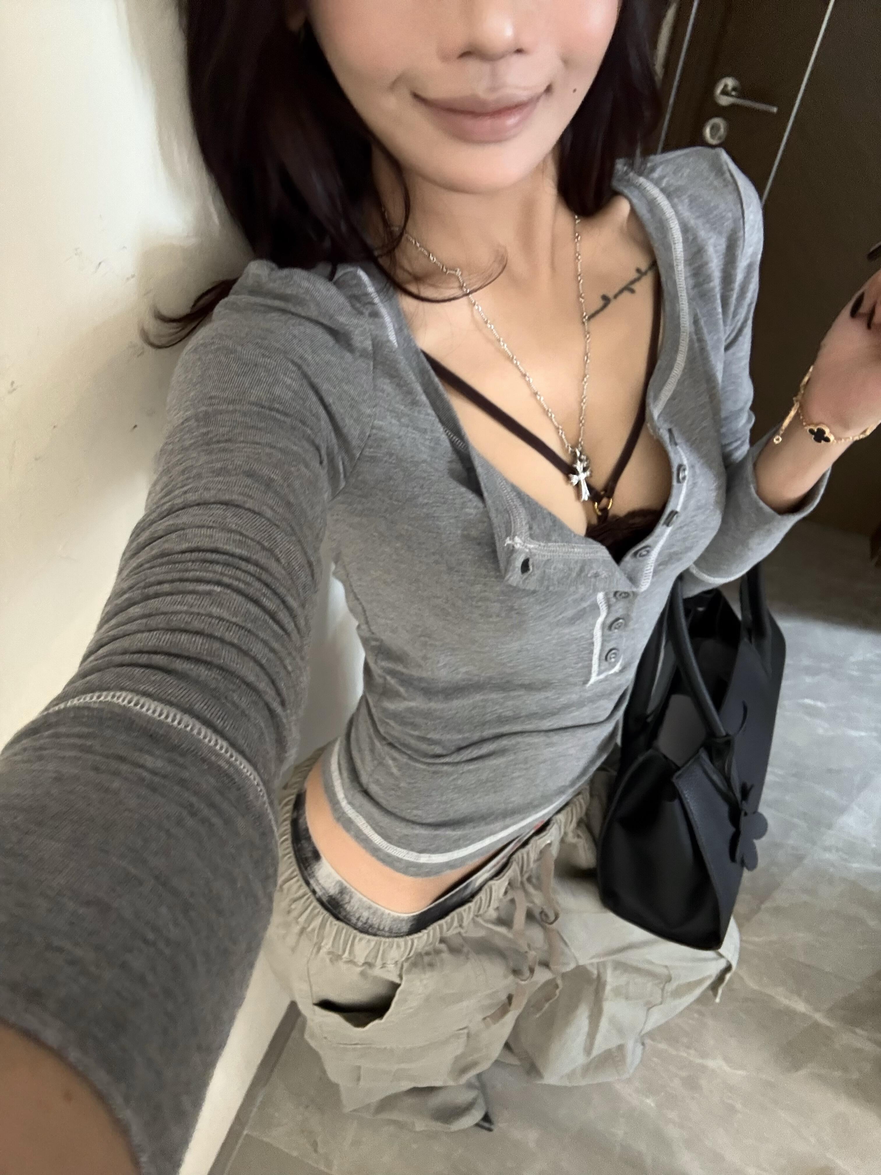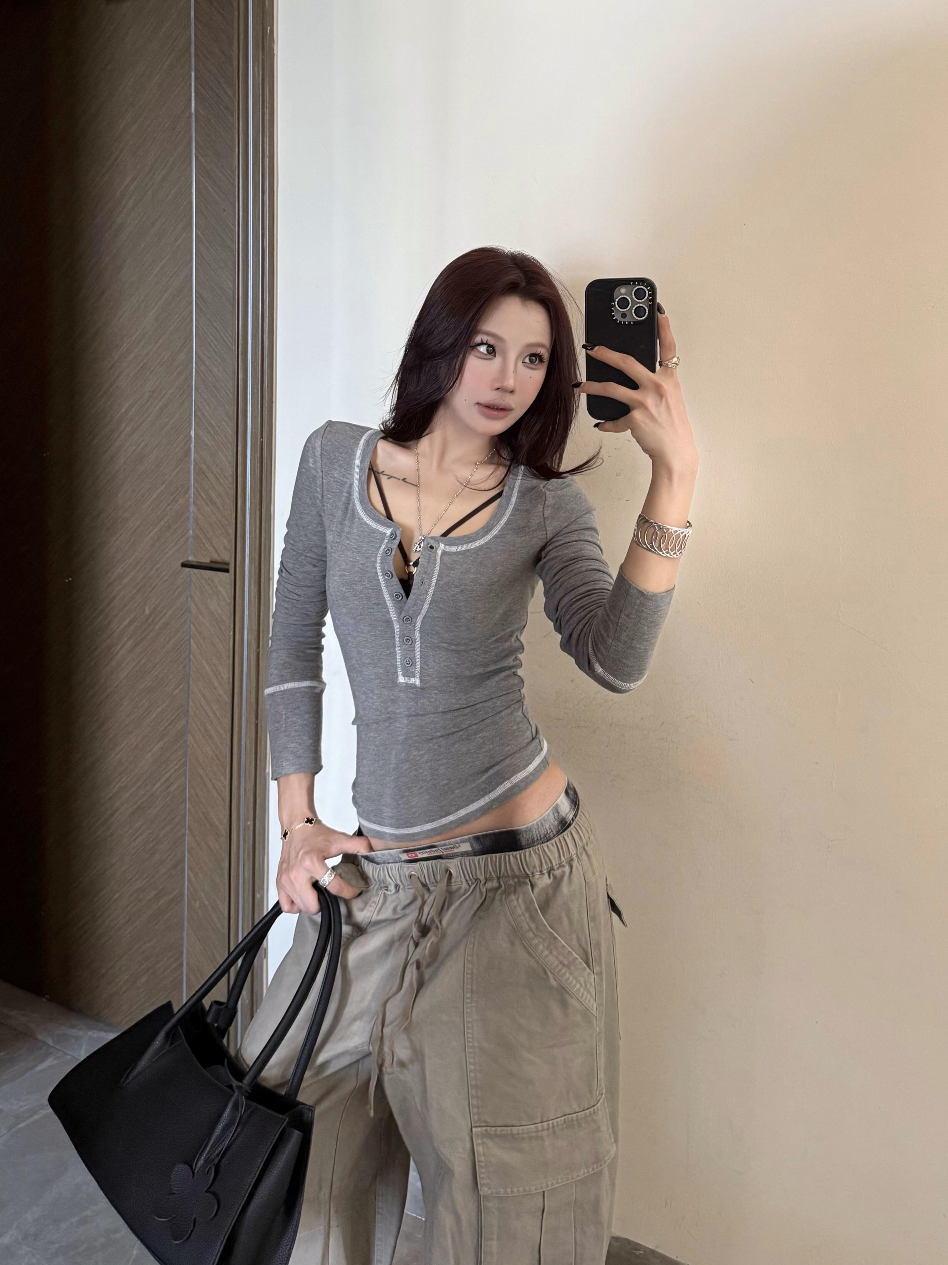 - Top: Grey long-sleeve Henley T-shirt with slim fit and vintage-inspired design.
