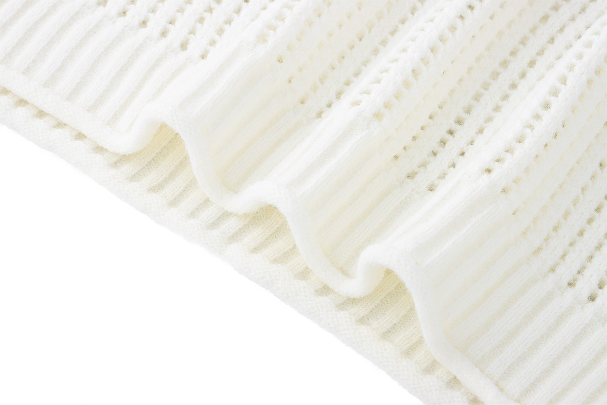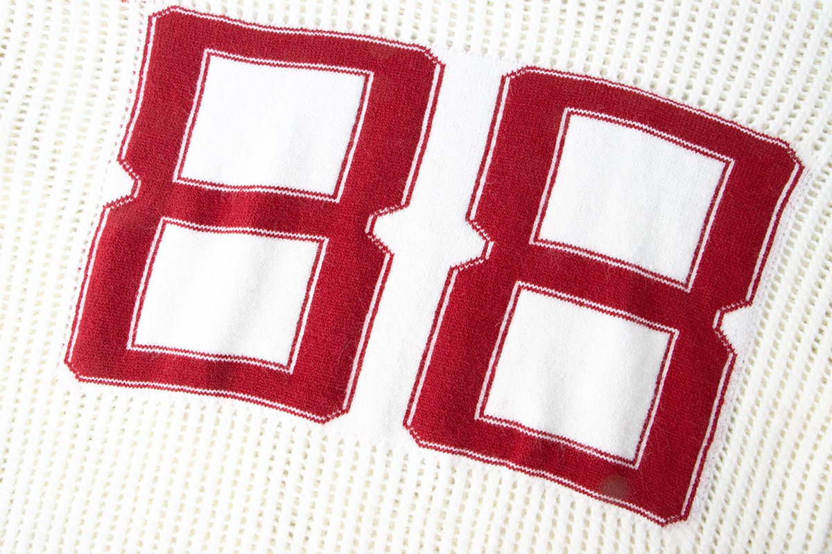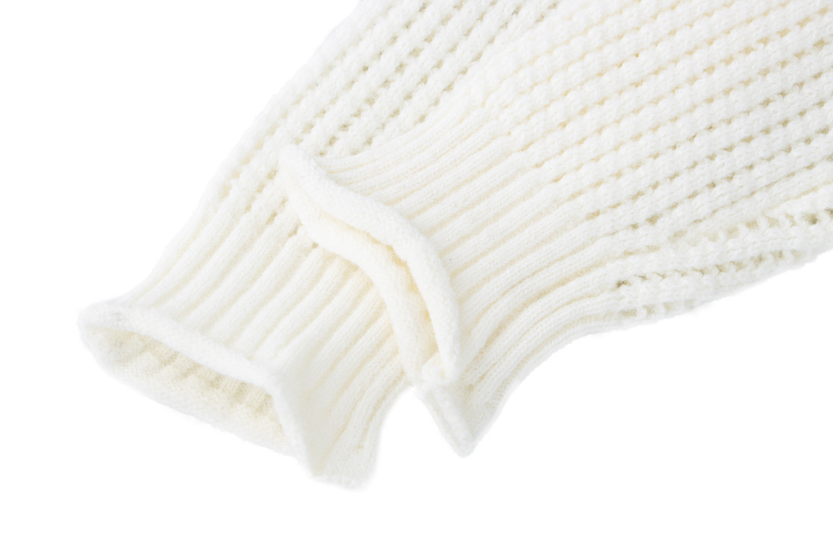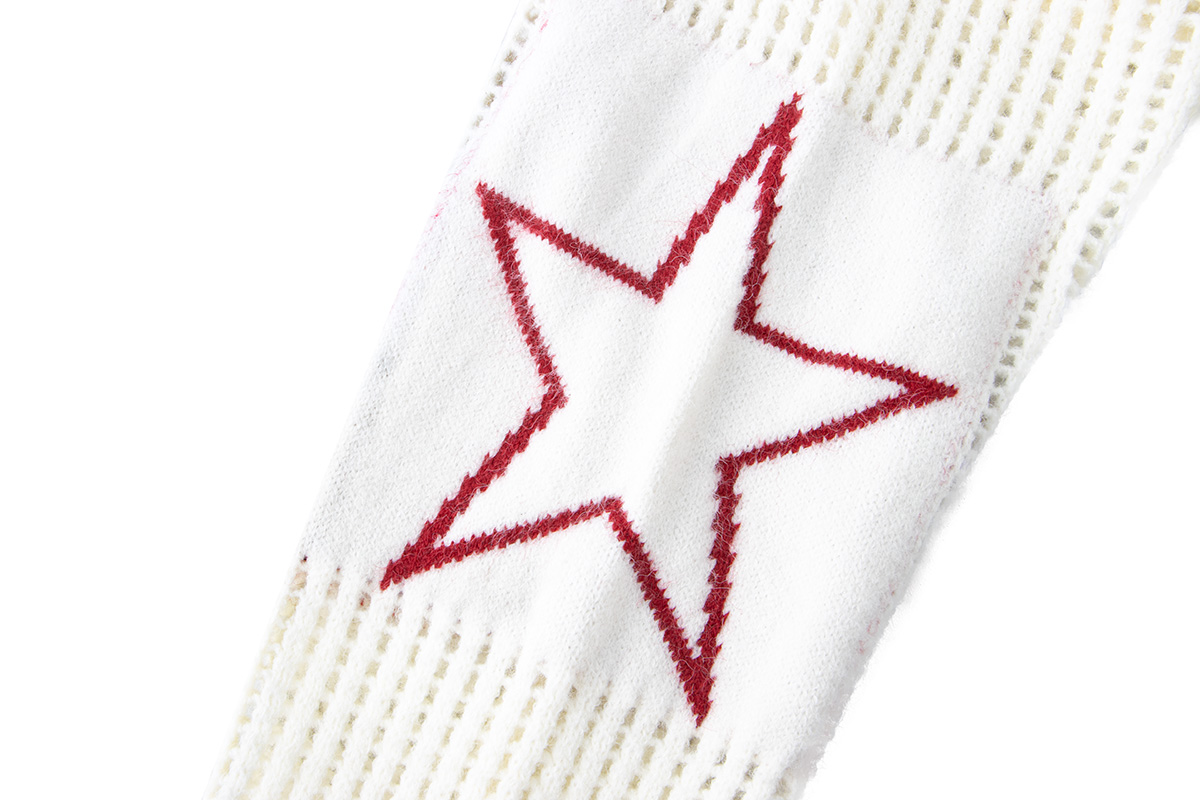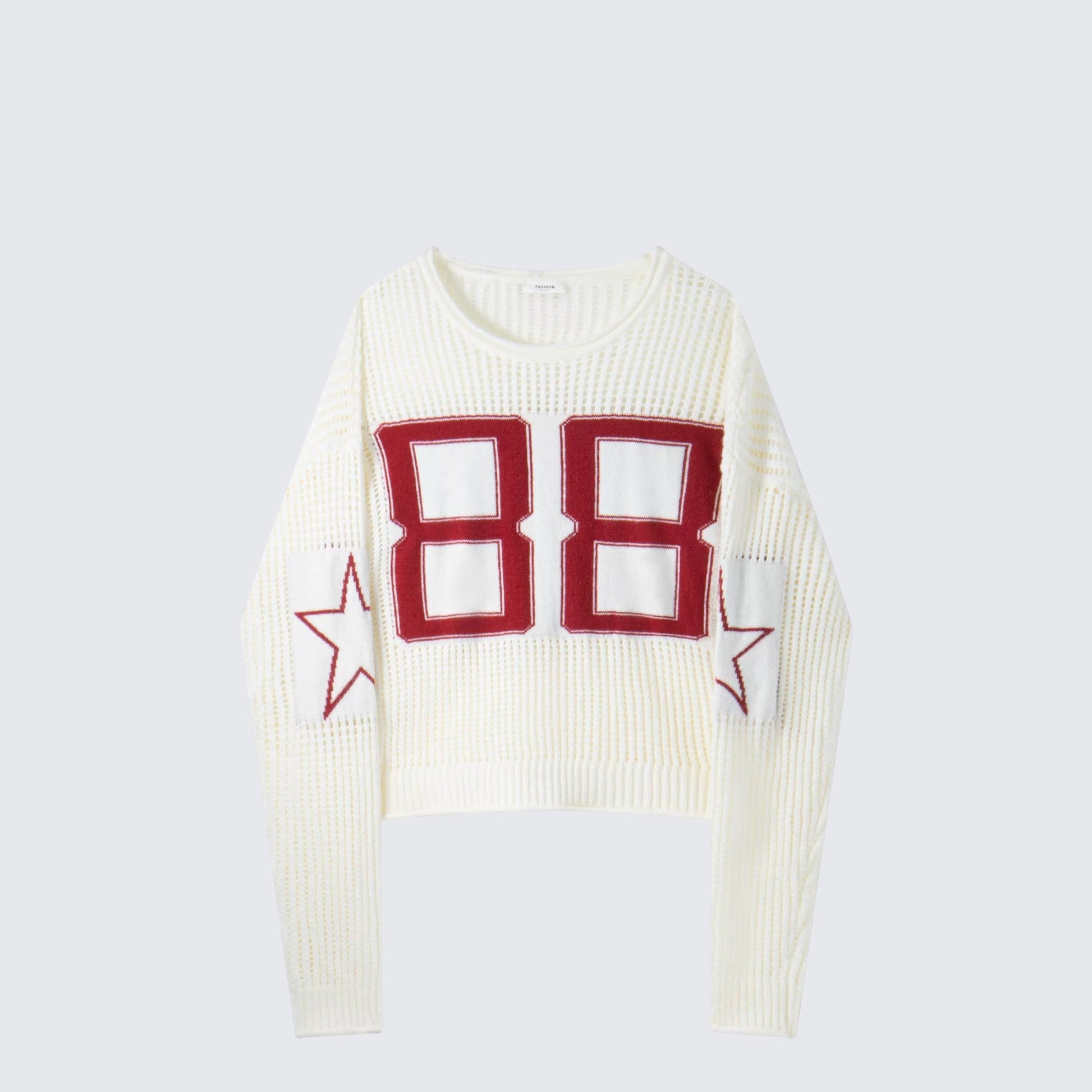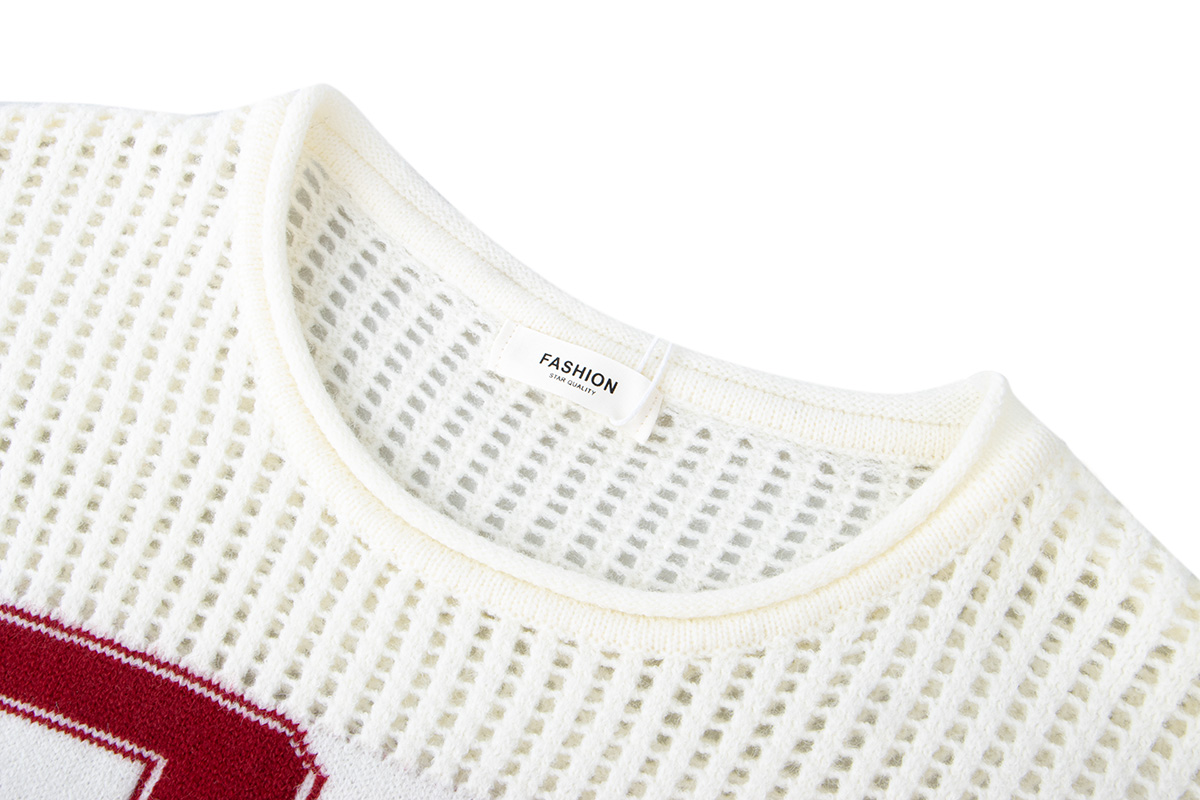 - Top: White long sleeve knit sweater with hollow detailing and football-inspired number design for a sporty autumn-winter look.