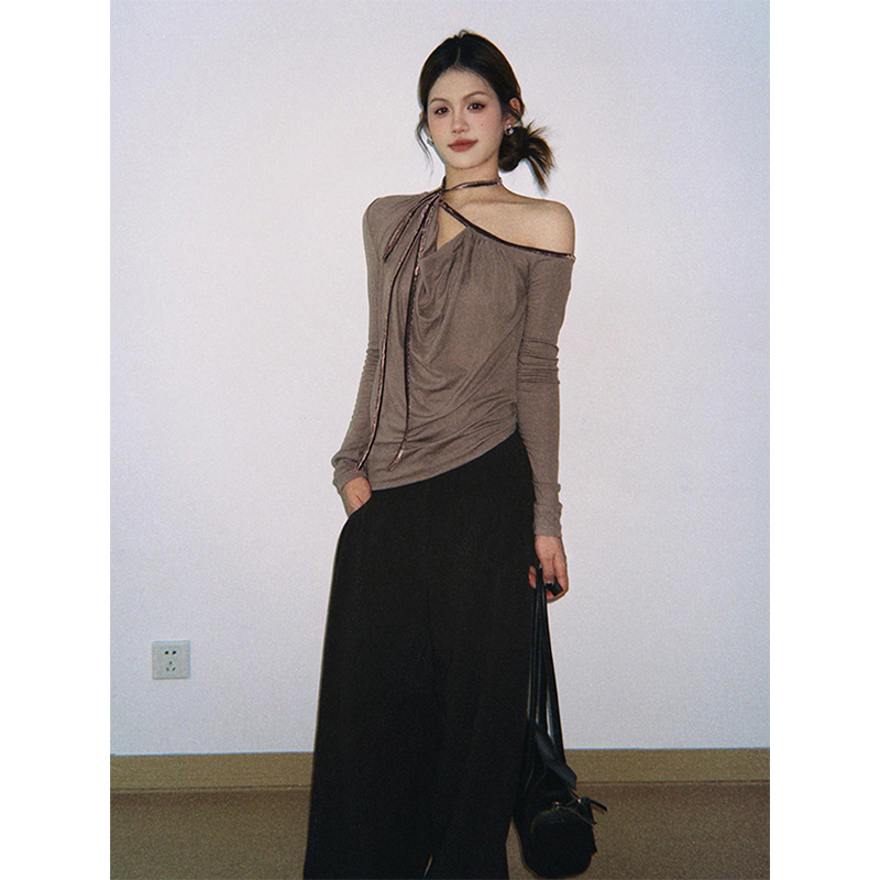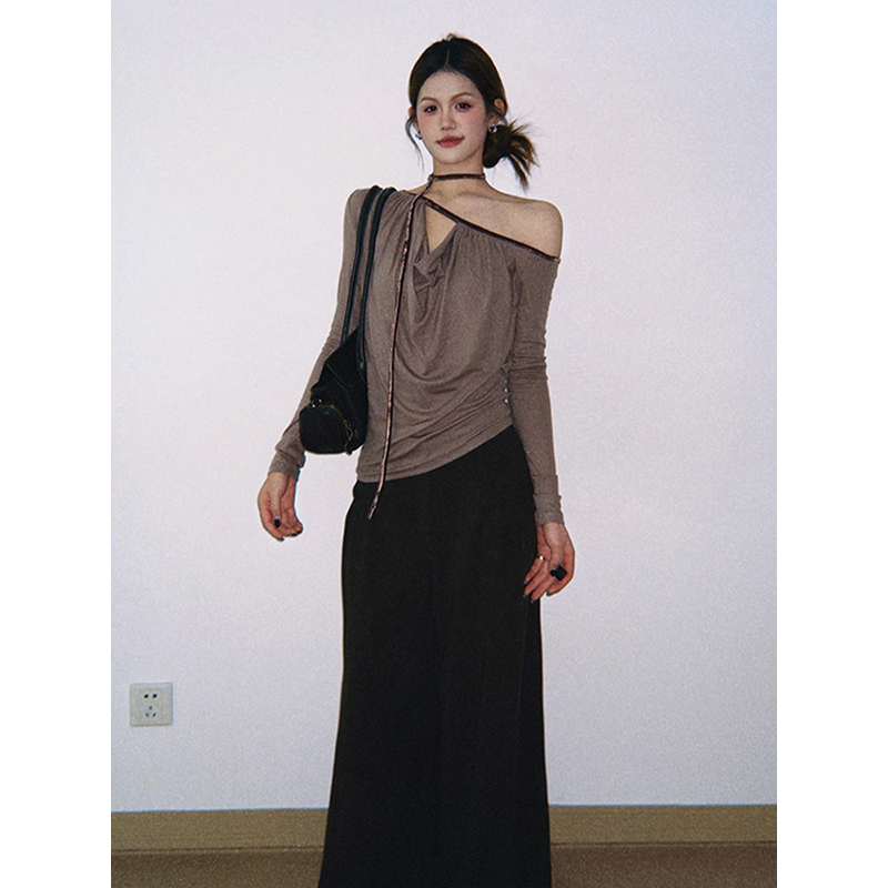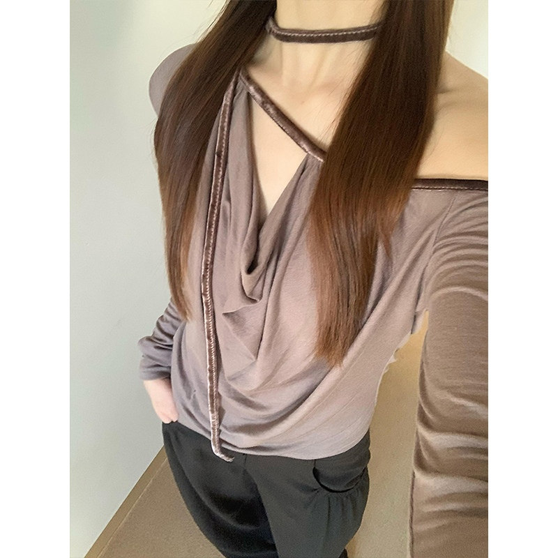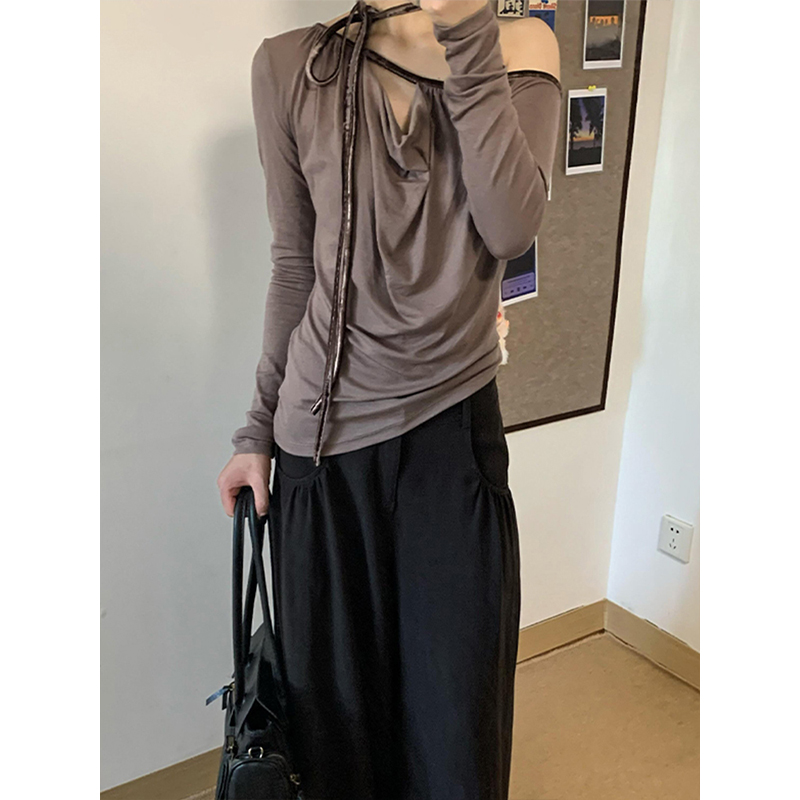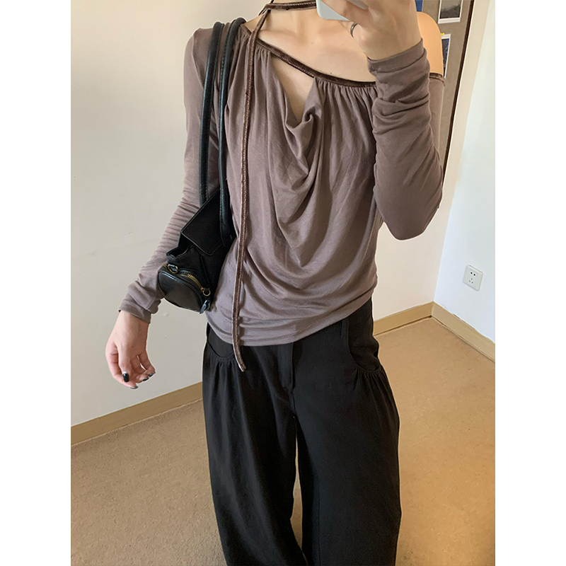 Hollowout draped knit top with long sleeves. Slim fit, off-shoulder, chic early autumn style.