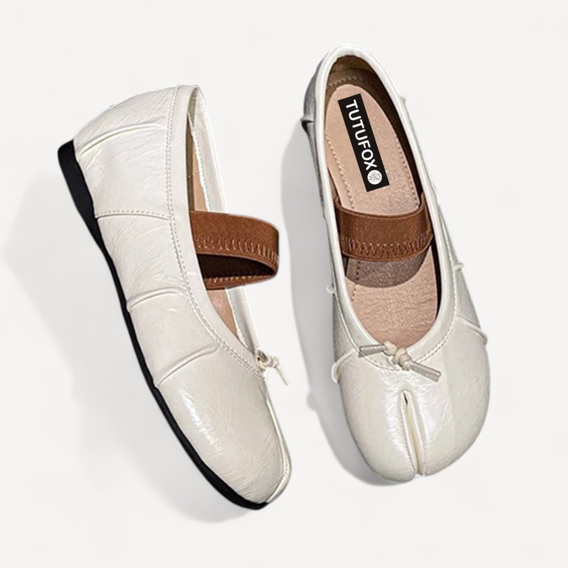 Soft ivory leather meets subtle elegance. These hidden-wedge split-toe shoes feature a central elastic strap for secure fit and gentle lift, perfect for all-day wear.