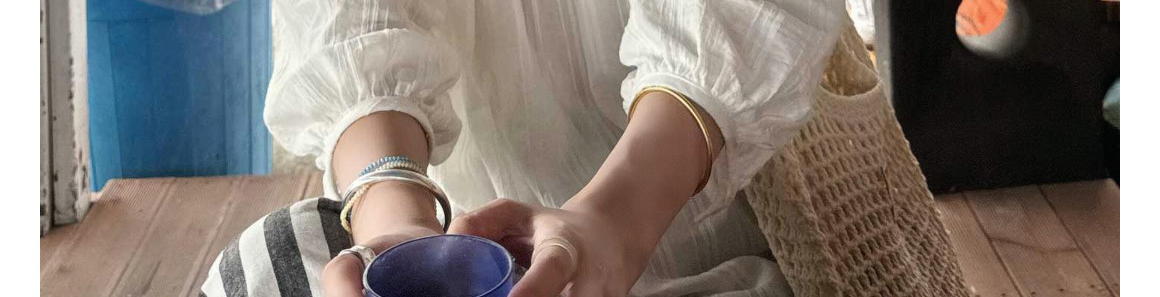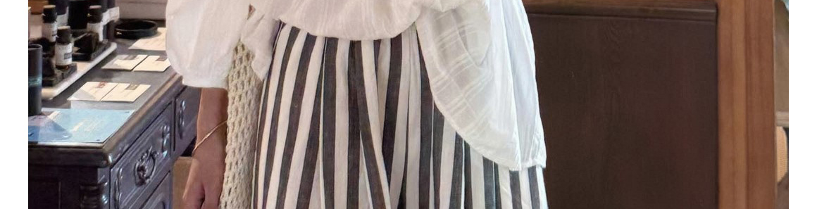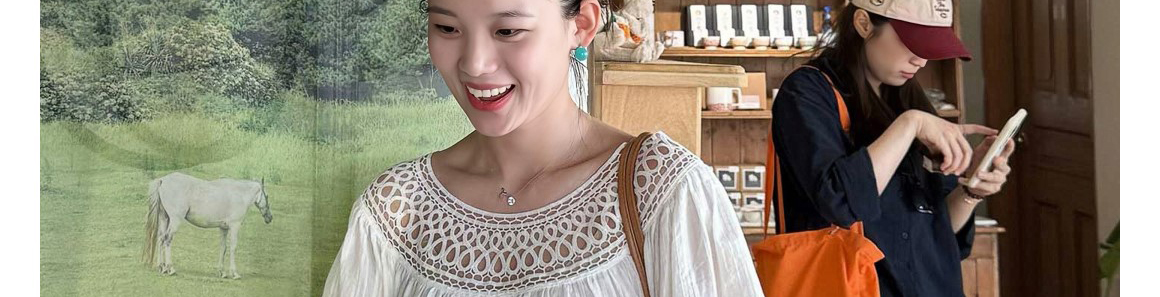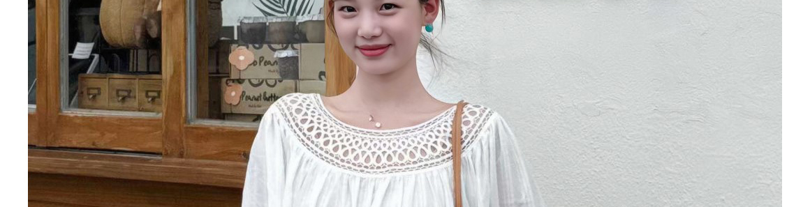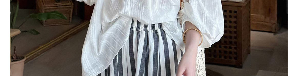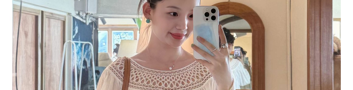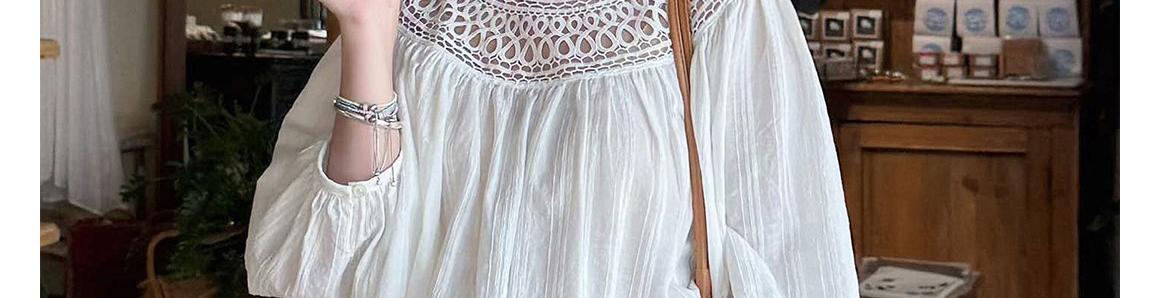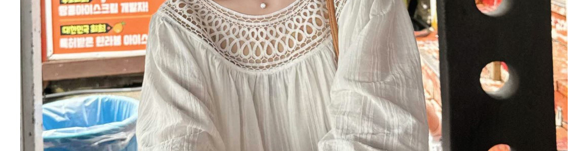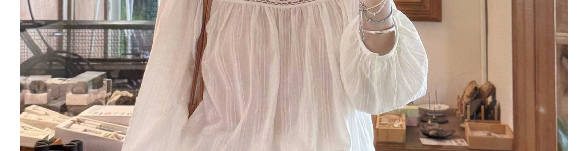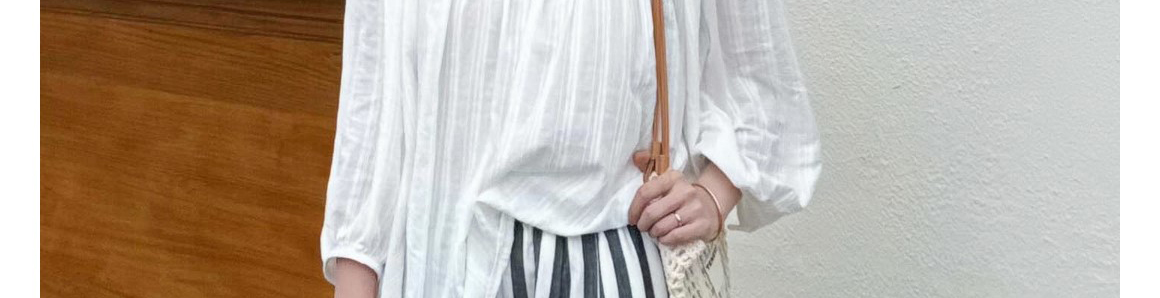 Ivory round neck knit top with hollow-out pleats. Loose fit, elegant seven-sleeve style for early autumn wear.