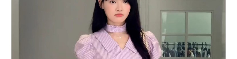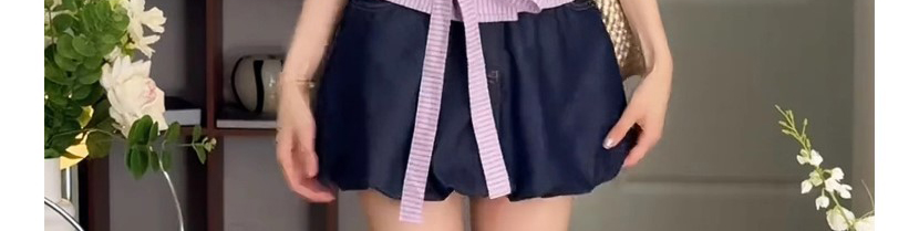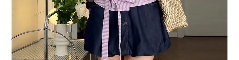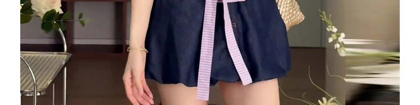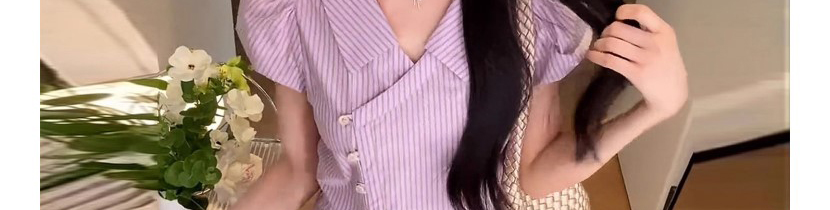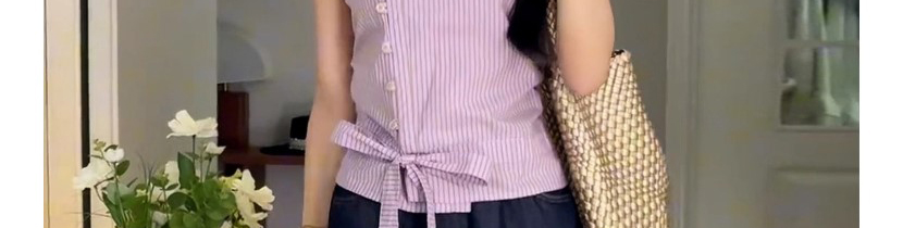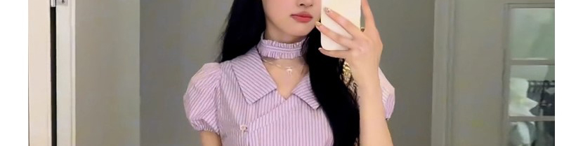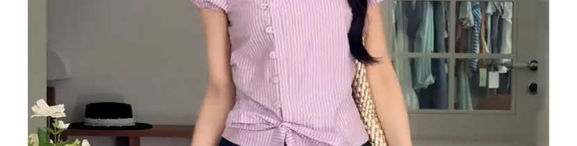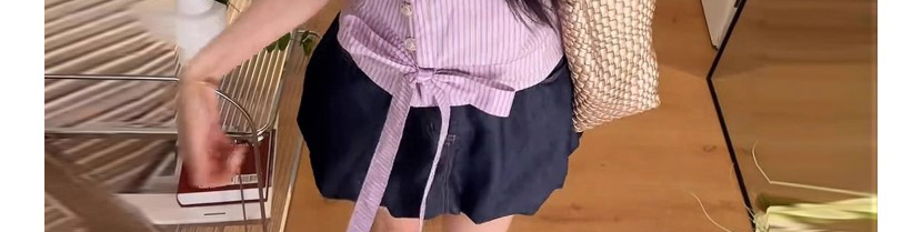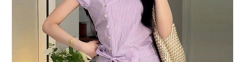 - Top: Short sleeve striped shirt with pink tie detail, slim fit, Japanese literary style.