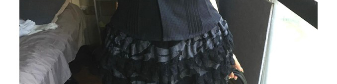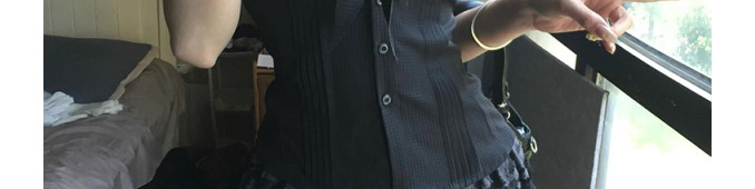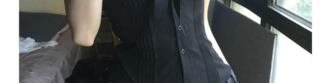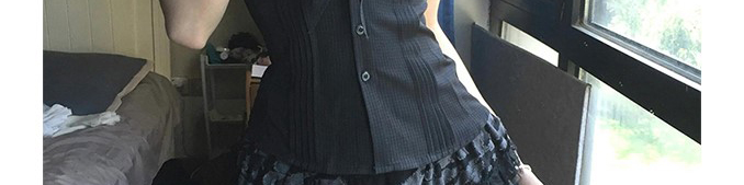 - Top: Slim-fit short sleeve shirt with bow tie and cinched waist, lightweight summer fabric.