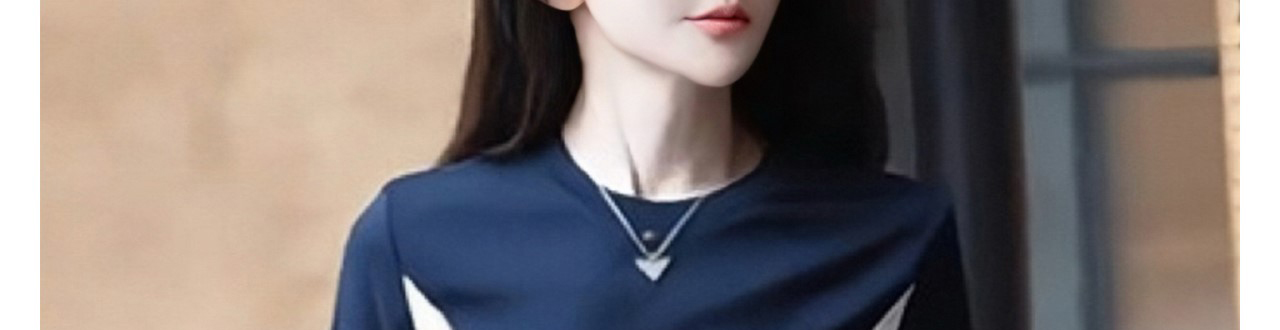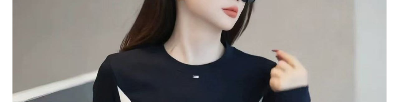 - Top: Slim-fit long sleeve tee with contrast patchwork design, soft autumn fabric, round neckline.