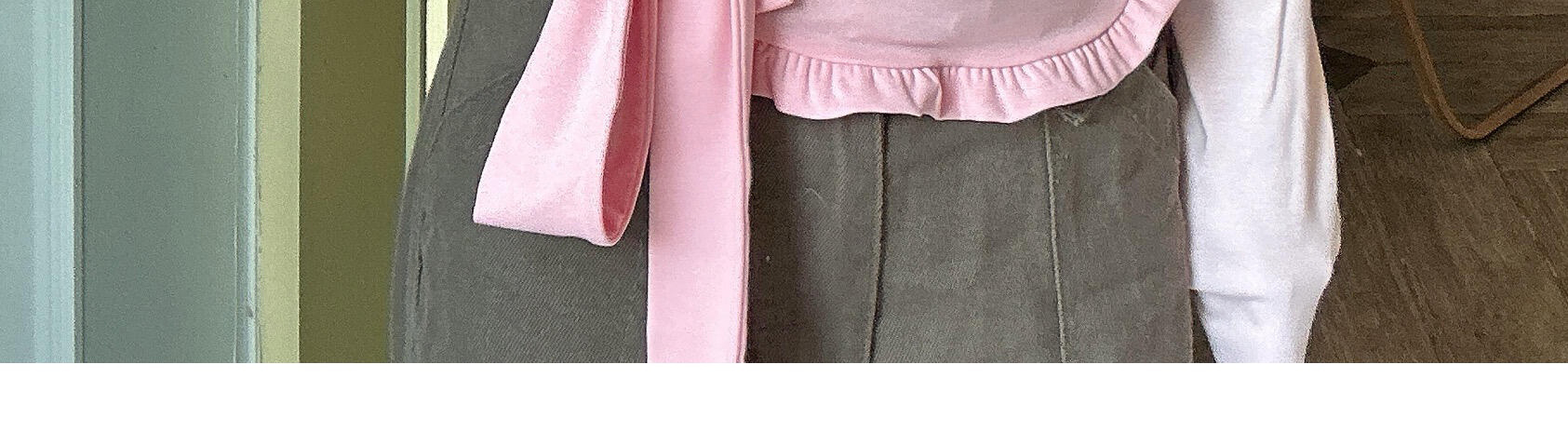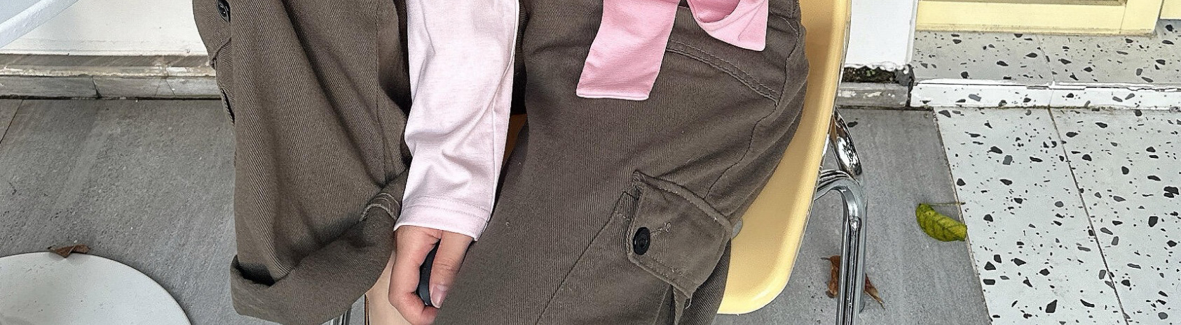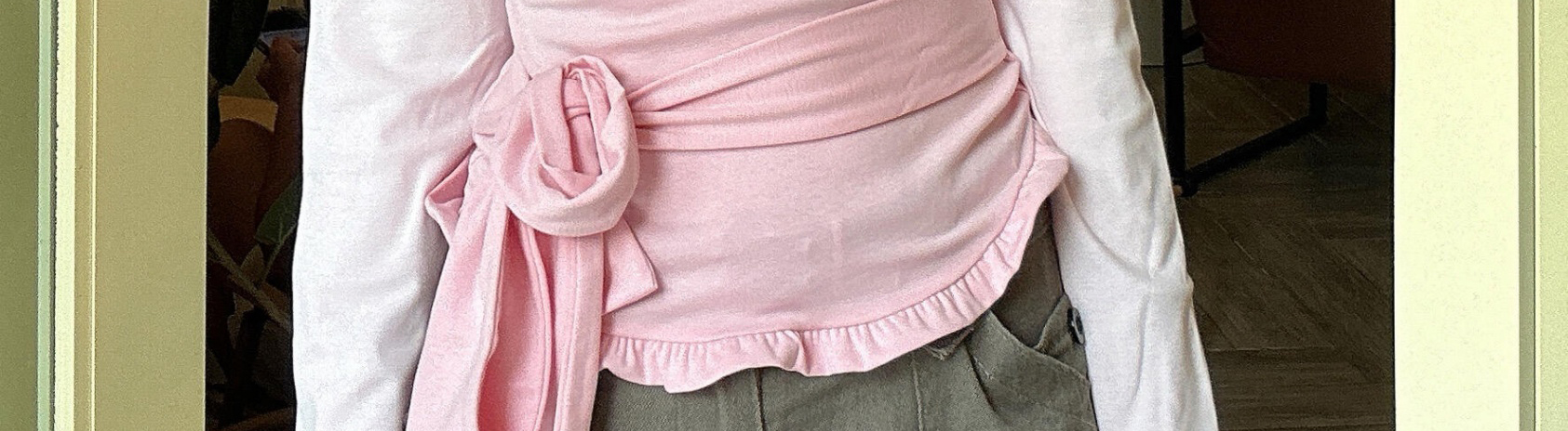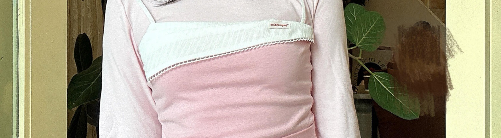 - Top: Lightweight long-sleeve tee with layered patchwork design, pastel pink color, breathable soft cotton blend.