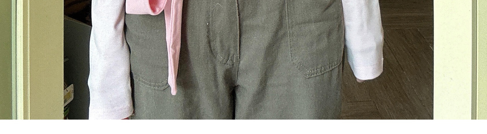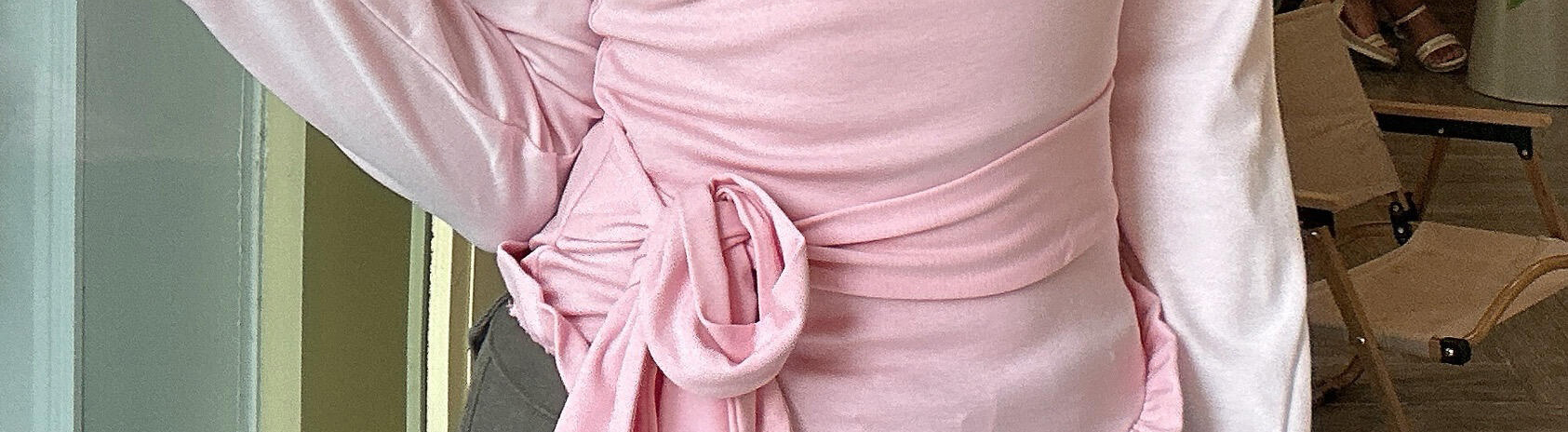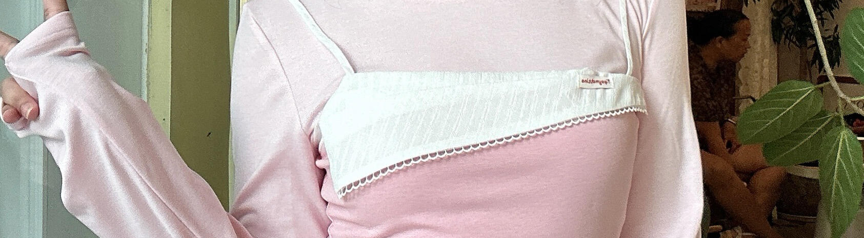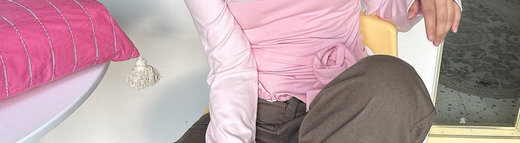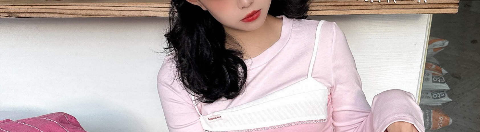 - Top: Lightweight long-sleeve tee with layered patchwork design, pastel pink color, breathable soft cotton blend.