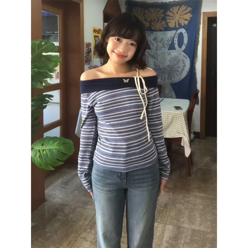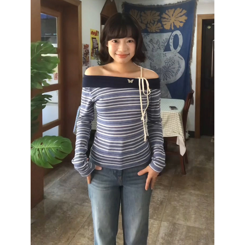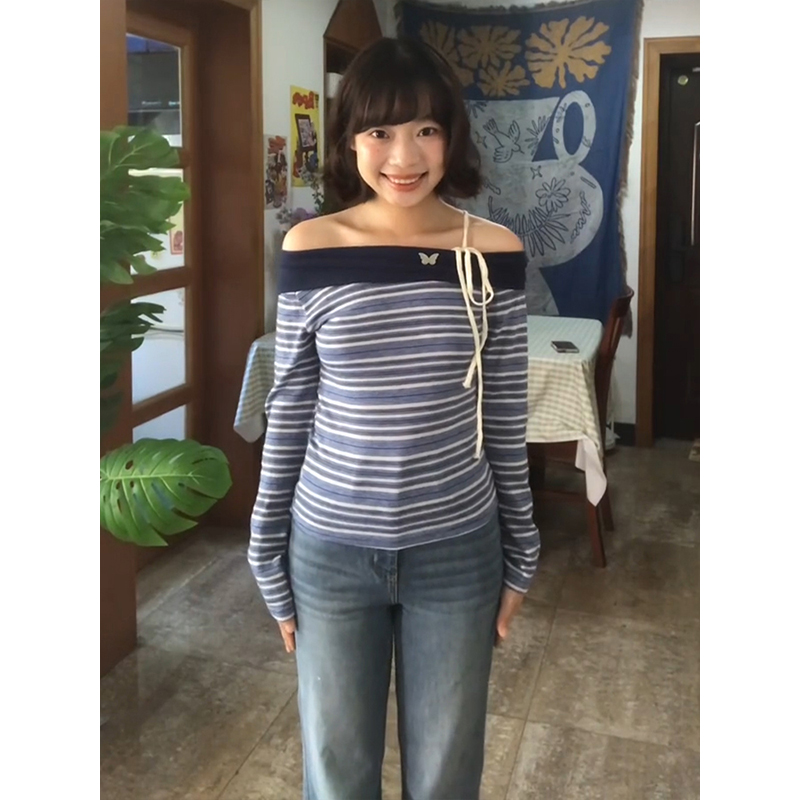 - Top: Slim-fit long sleeve off-shoulder tee with stripe pattern and tie details, soft early autumn fabric.