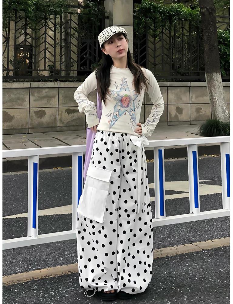 - Bottom: Polka dot cargo pants with elastic waist and relaxed fit.