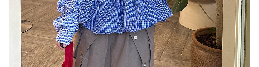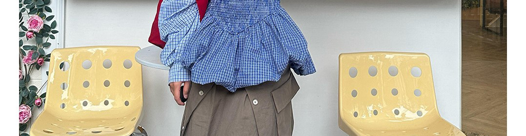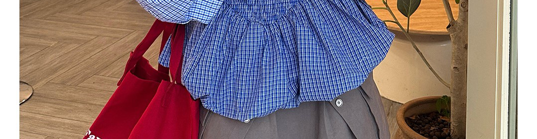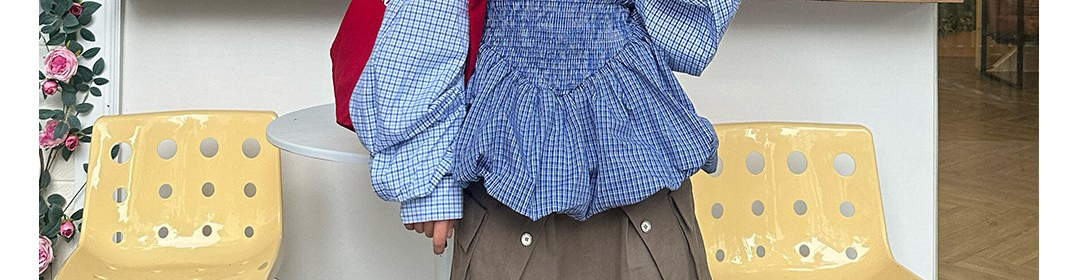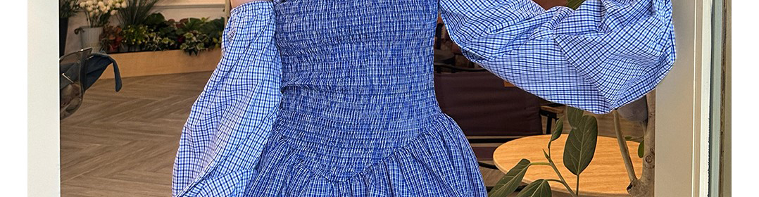 - Dress: Striped bust smocked design with puffed skirt and contrast sleeves.