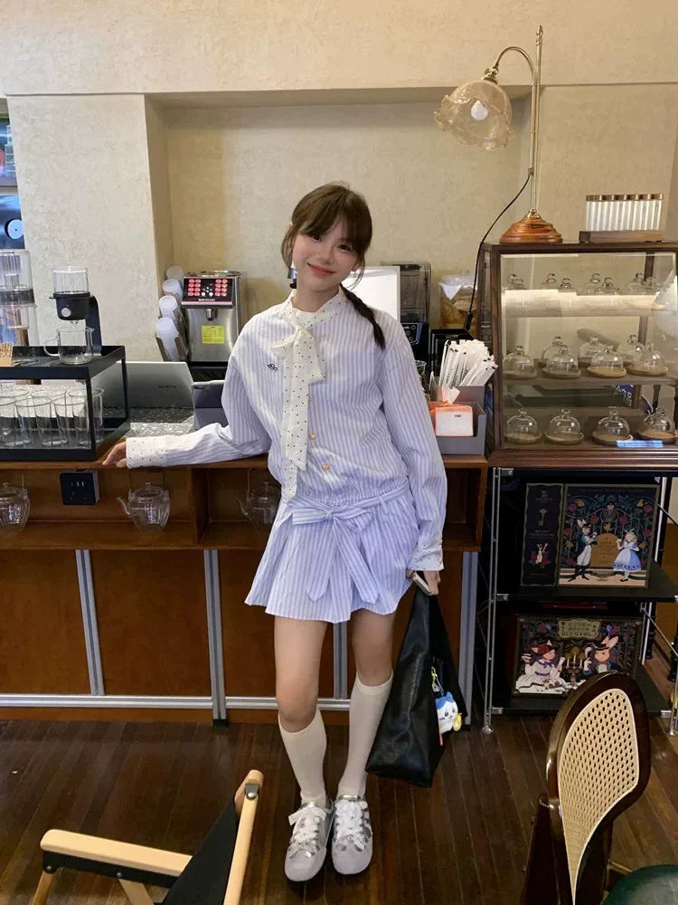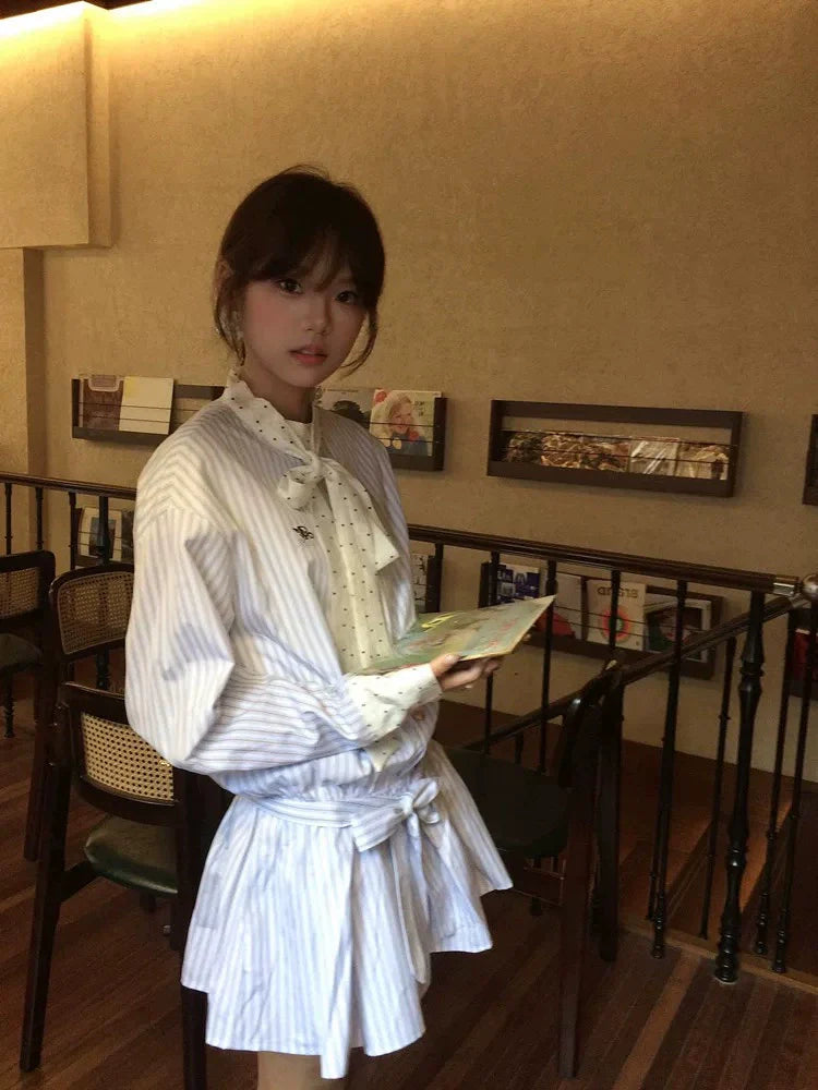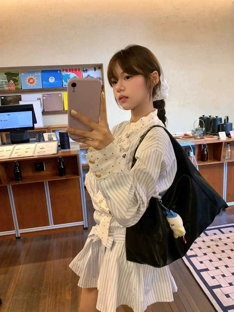 Korean-Style Polka Dot Cardigan + Stripe Dress Two-Piece Set