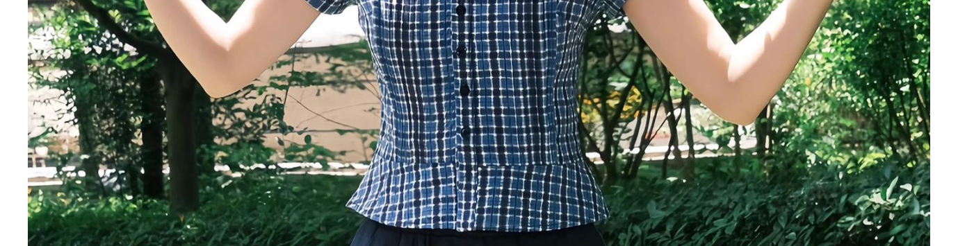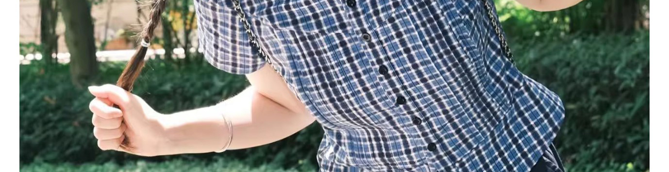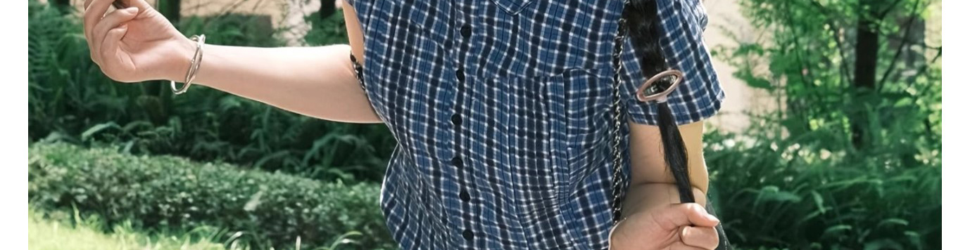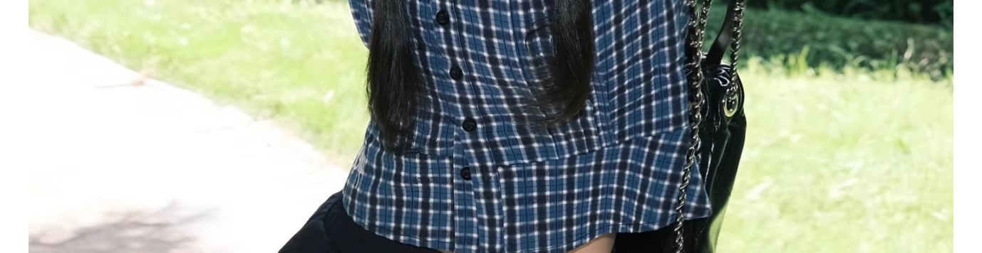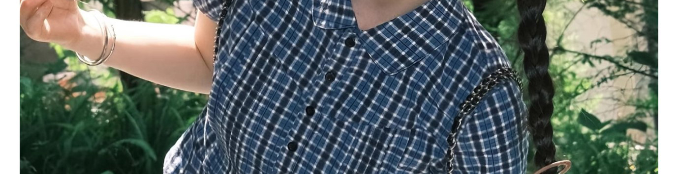 - Top: Blue checkered short sleeve shirt with classic collar, slim fit and lightweight cotton fabric.