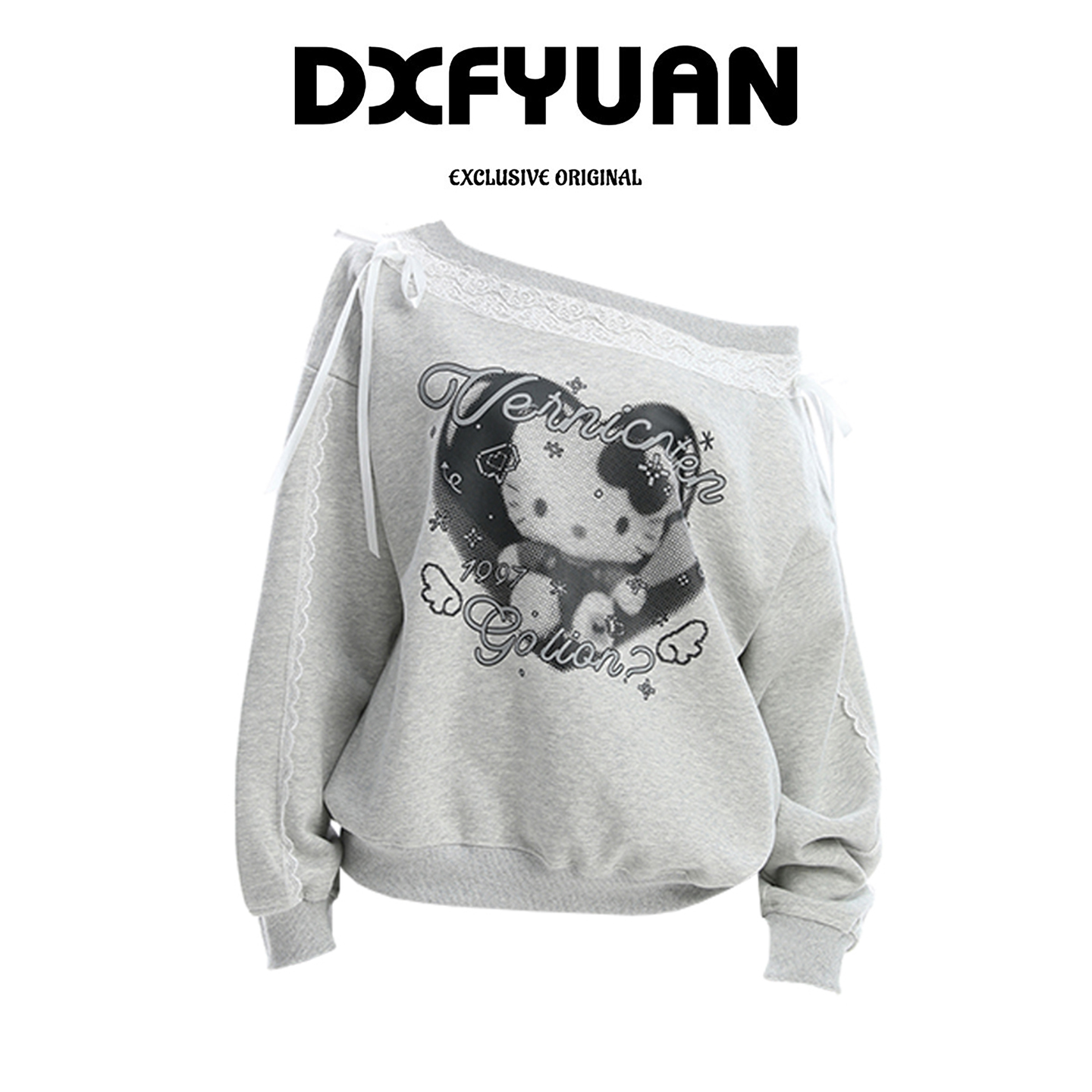American vintage sweatshirt with lace splice and off-shoulder design. Loose and feminine, blending sporty with sexy.