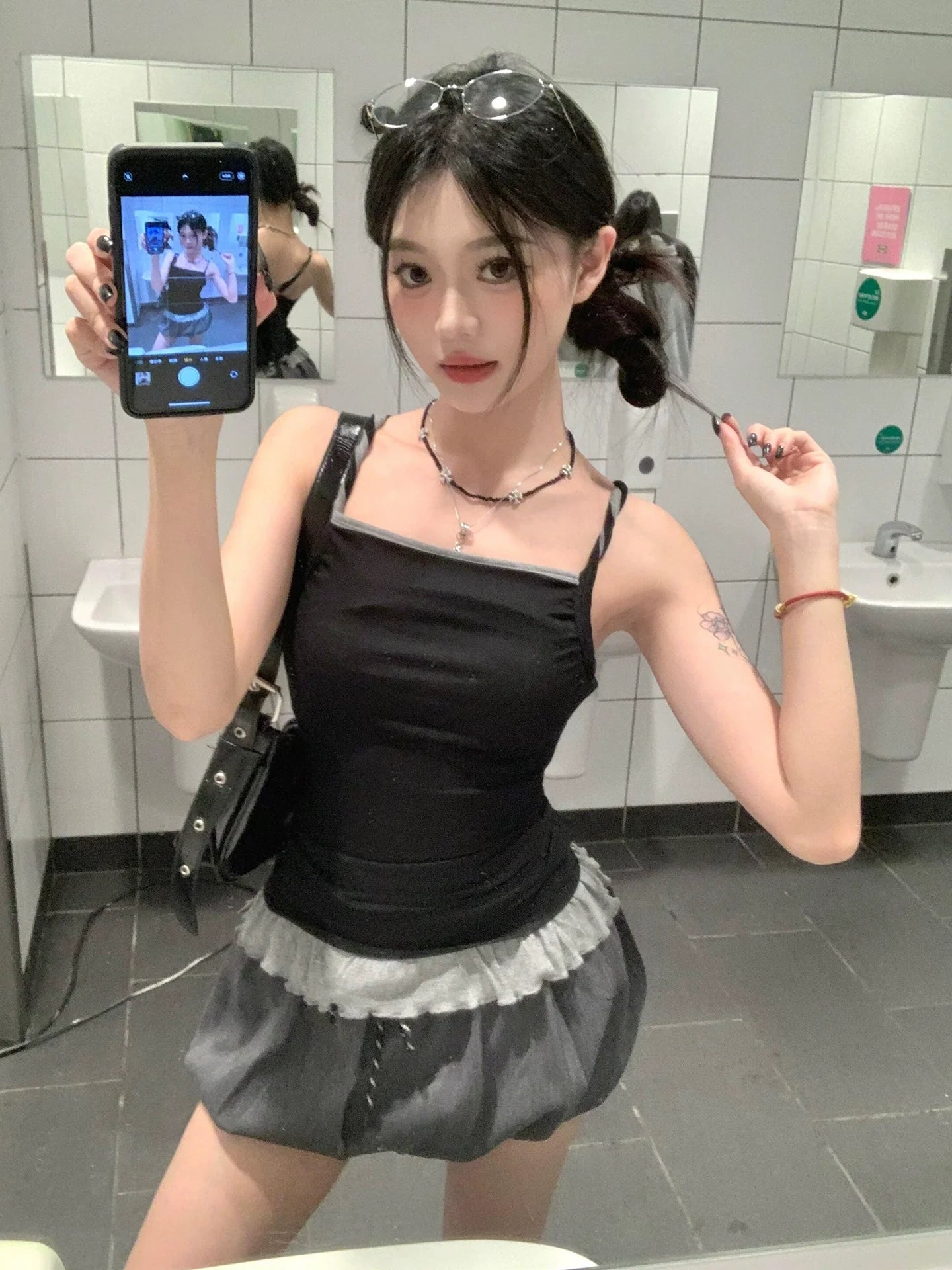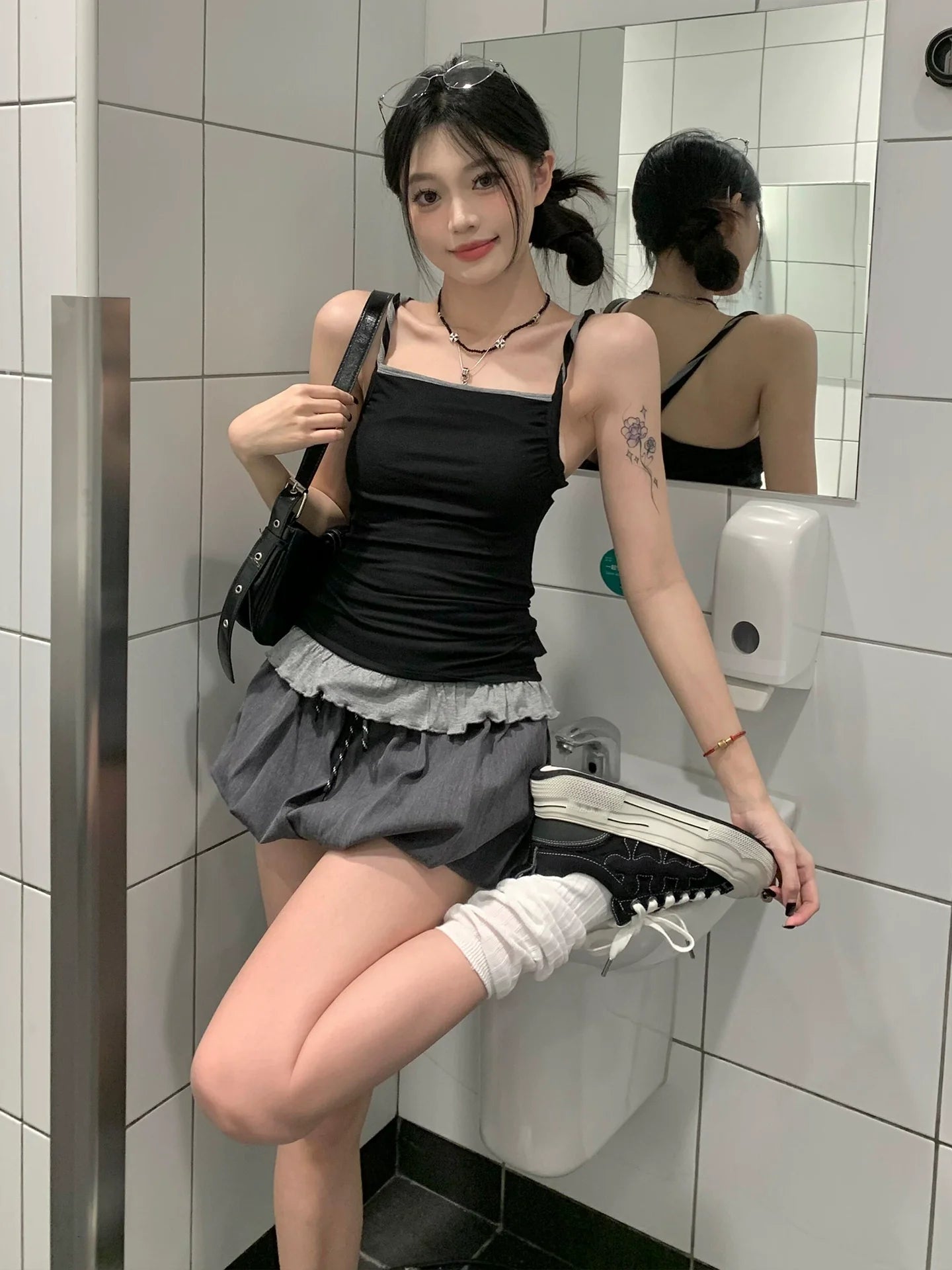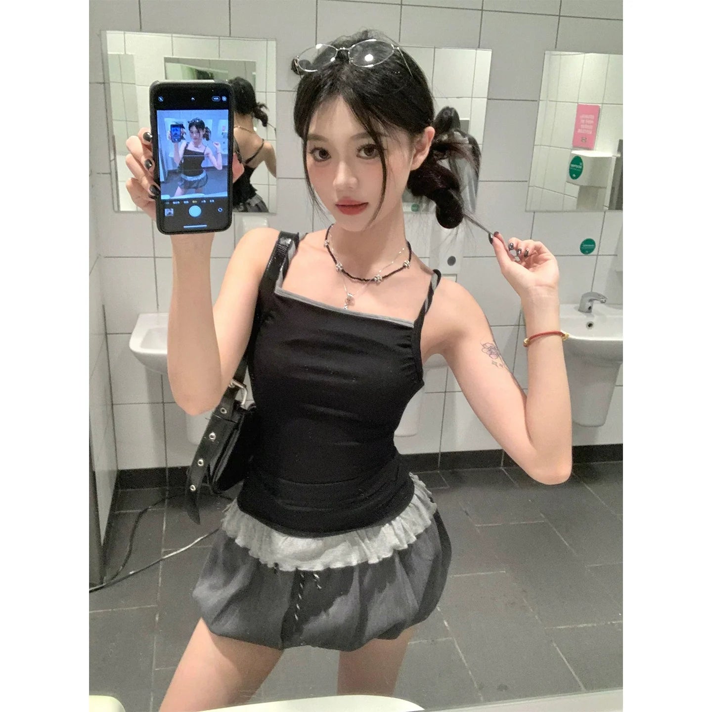 - Top: Summer faux layered camisole with pleated hem, lace edges, backless design, slim fit, soft cotton fabric, Y2K playful girly style.