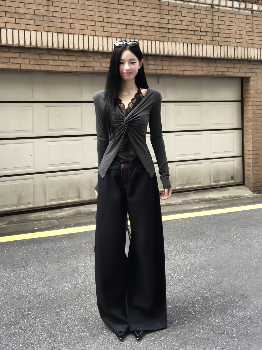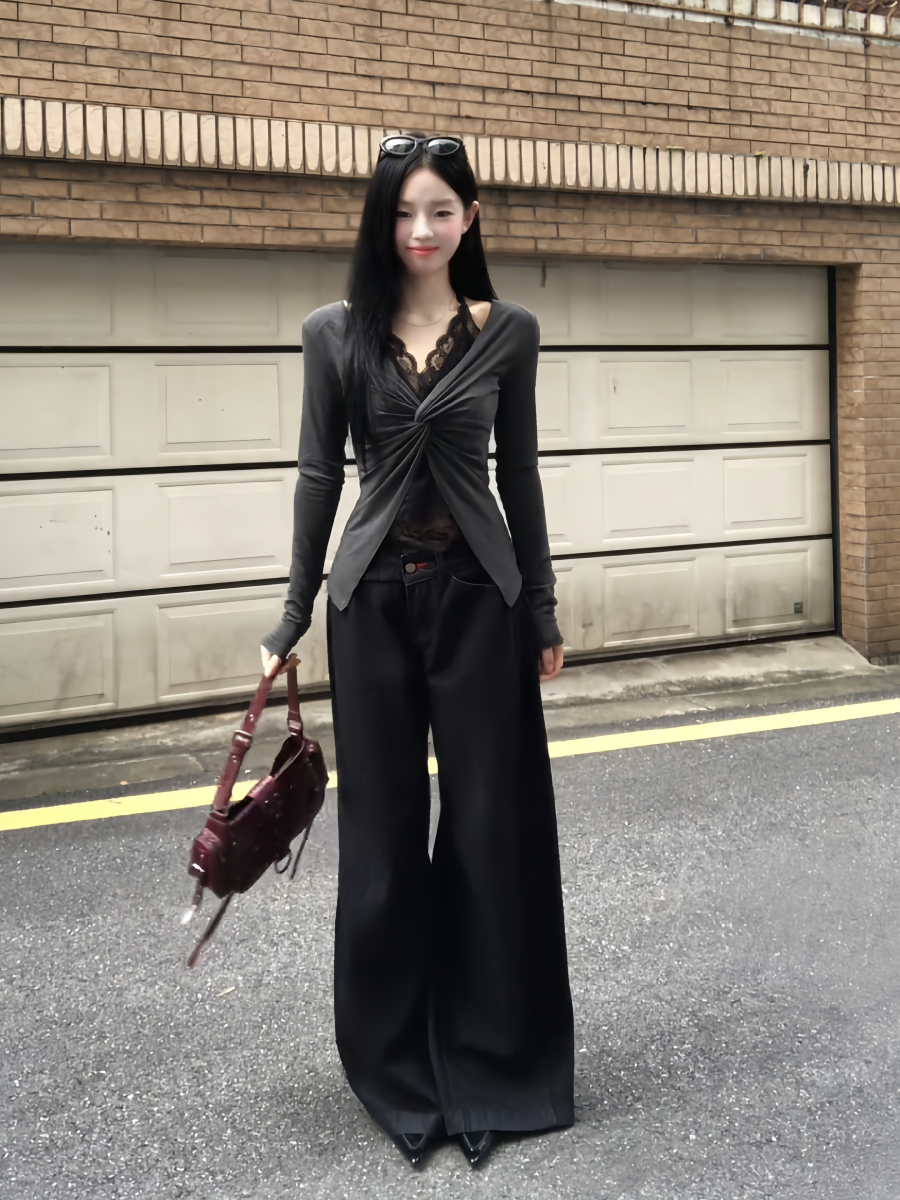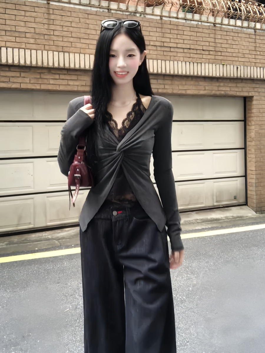 - Top: Layered long sleeve top with lace halter detail, slim-fit design, comfortable early autumn fabric.