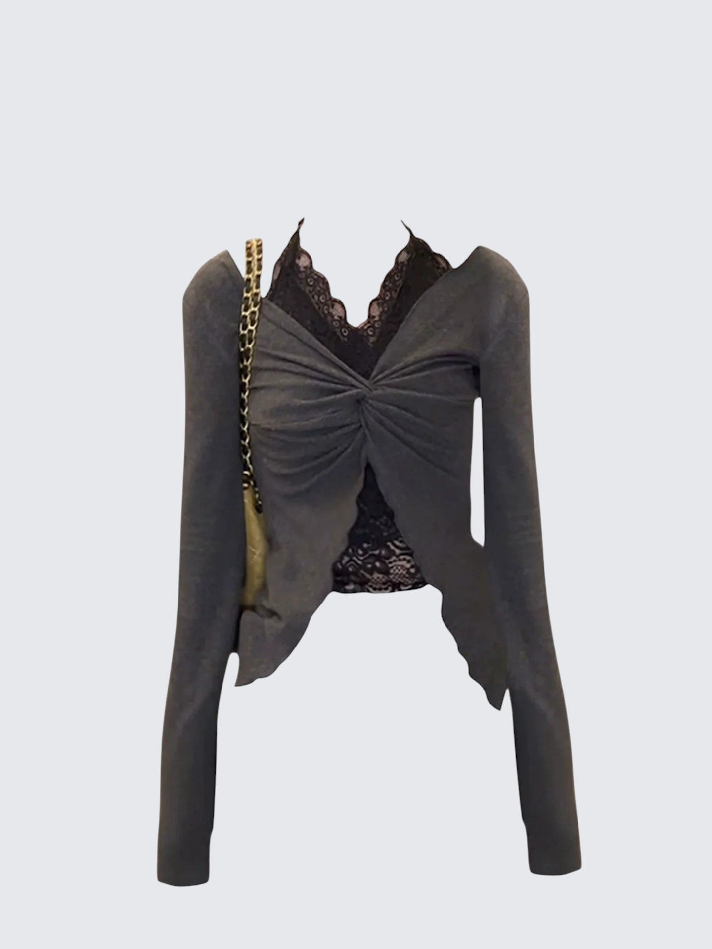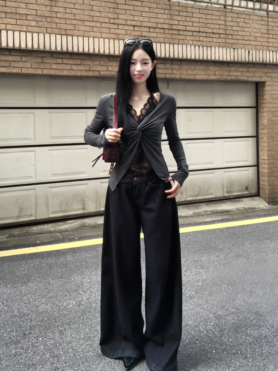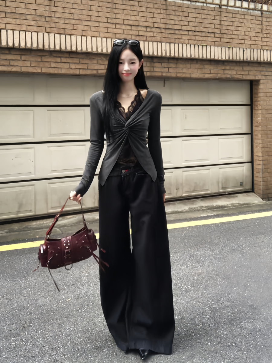 - Top: Layered long sleeve top with lace halter detail, slim-fit design, comfortable early autumn fabric.