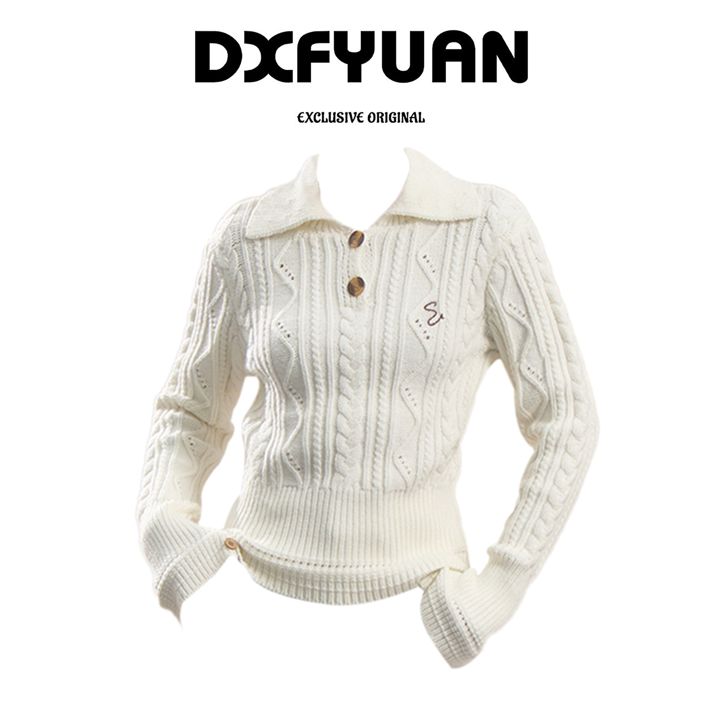 - Top: White cable knit sweater with embroidered collar and fitted silhouette for a chic autumn-winter look.