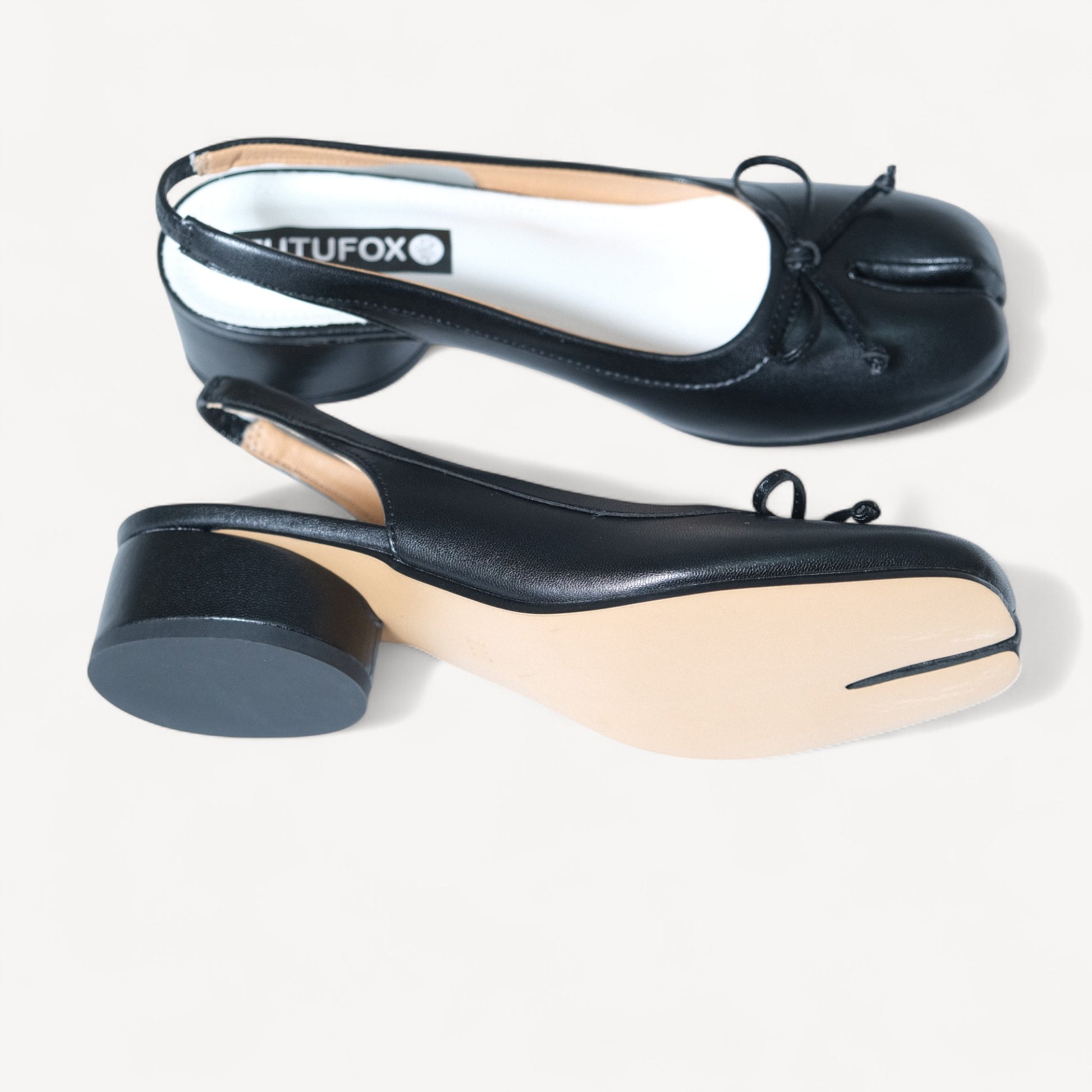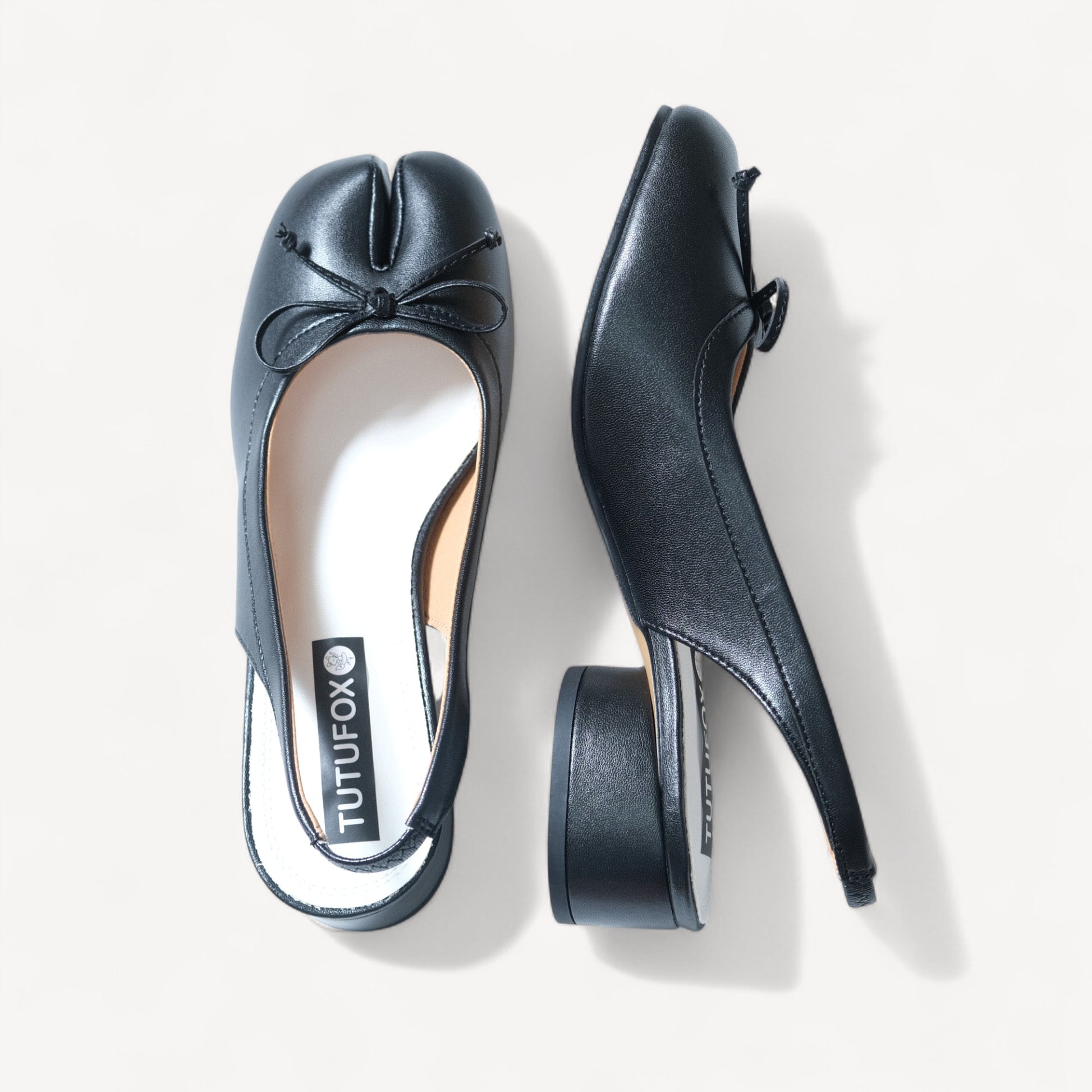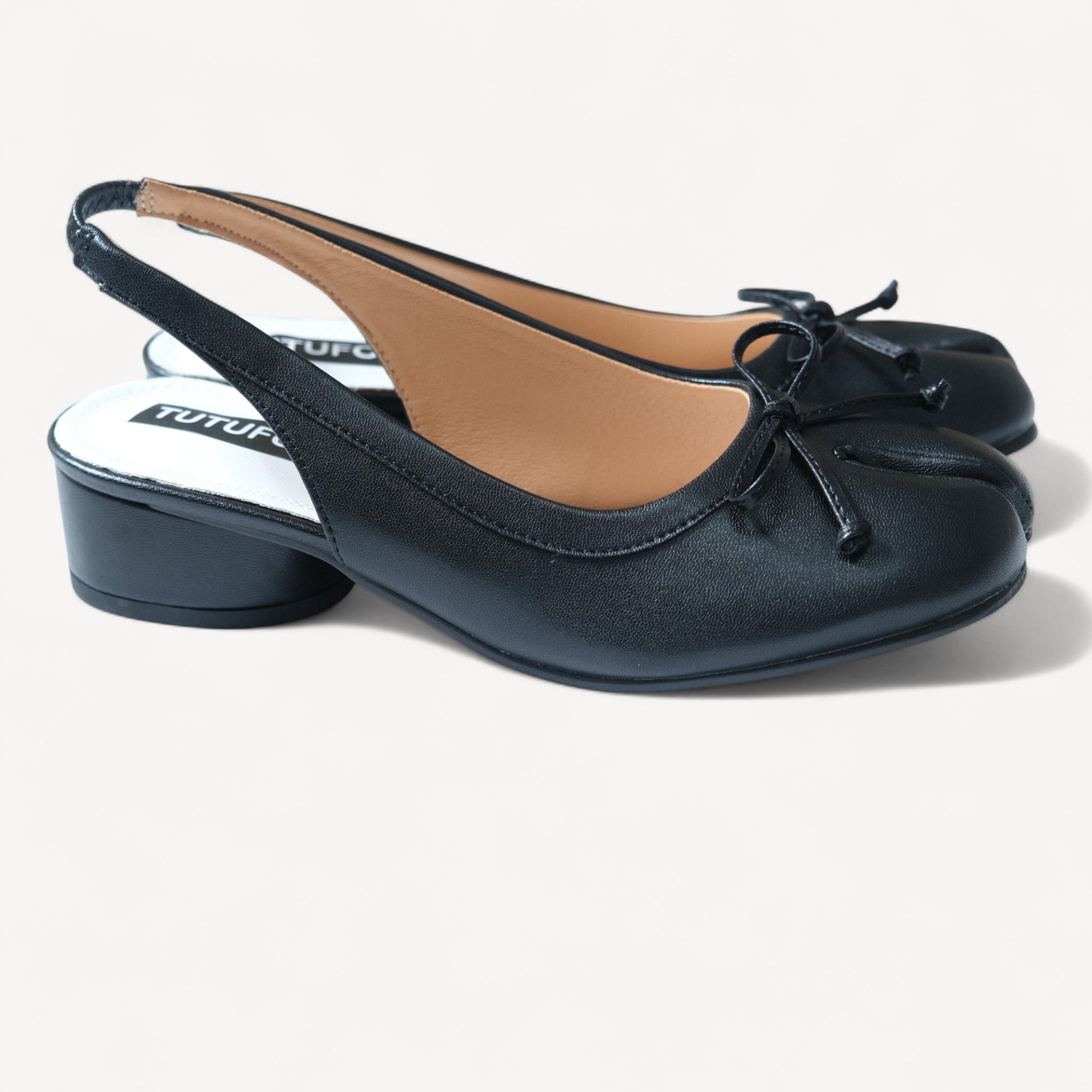 Delicate charm meets modern comfort. These leather split-toe shoes feature a playful bow at the toe, a rounded 3.5cm heel, and a secure ankle strap, balancing elegance with everyday ease.