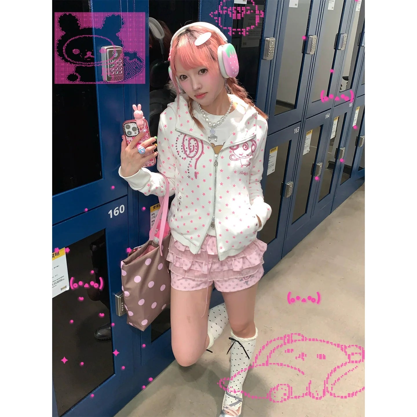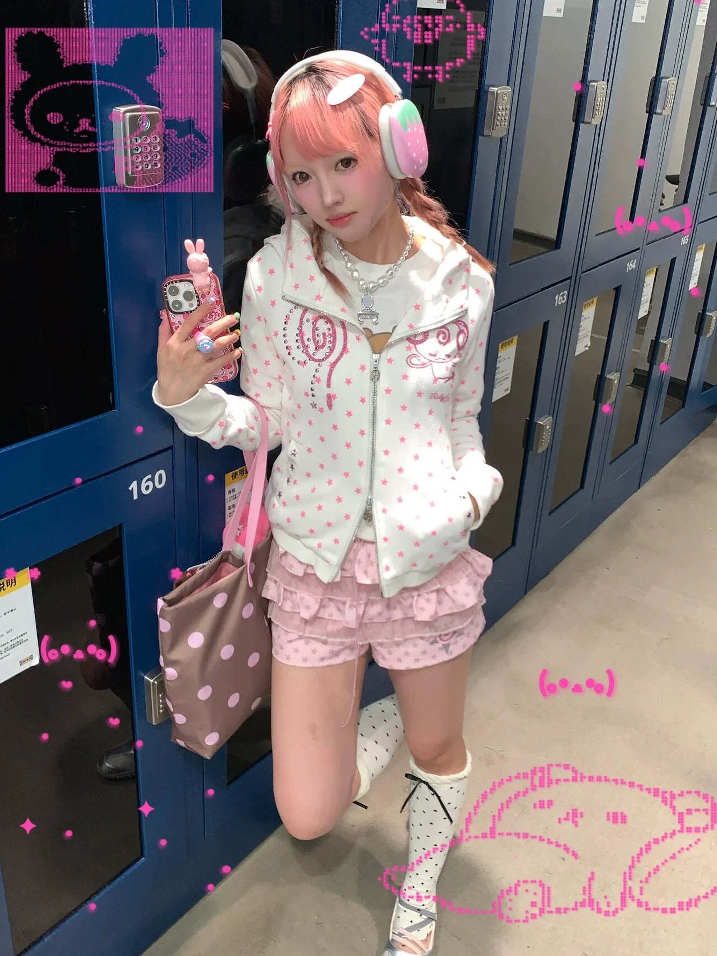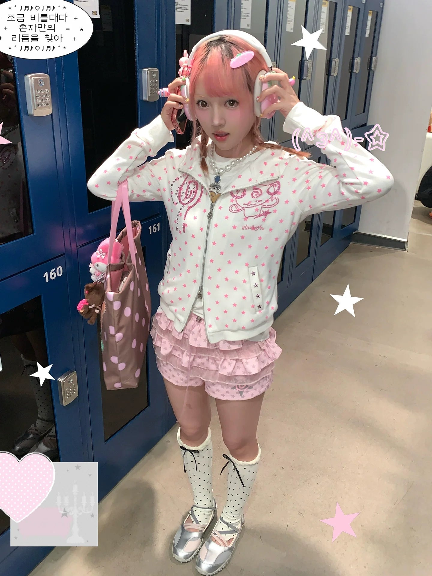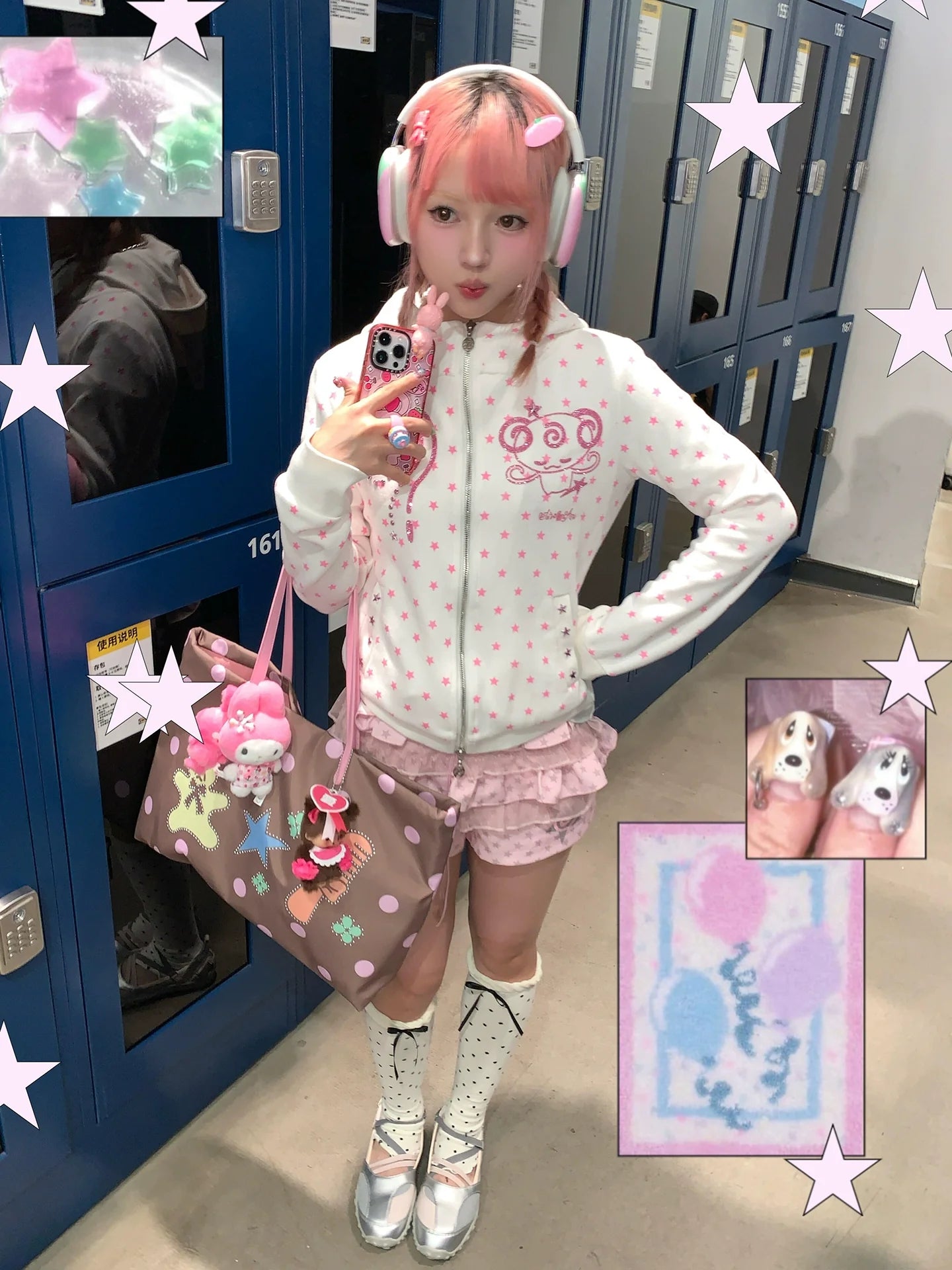 - Top: Autumn-winter fitted hoodie with star and polka dot print, zip-up front, soft cotton blend, Y2K light aesthetic, playful devil-inspired design.