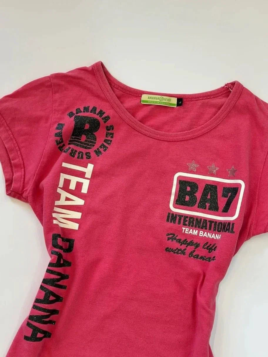 - Top: Magenta slim short sleeve top with American retro vintage prints, blending Y2K "Abi" subculture and vibrant summer vibes. Slim fit flatters for edgy looks.