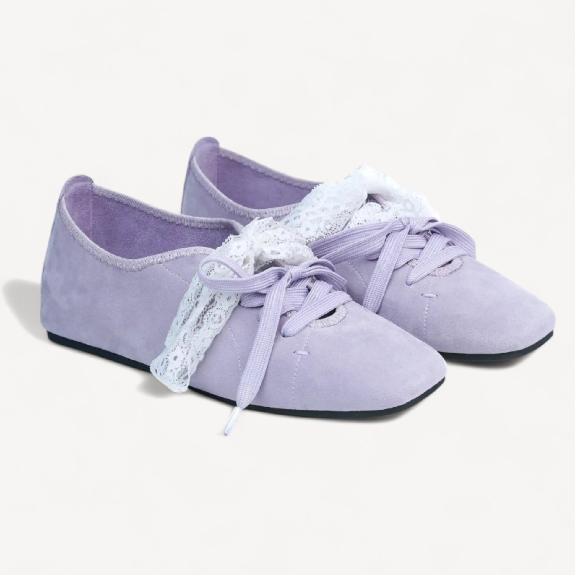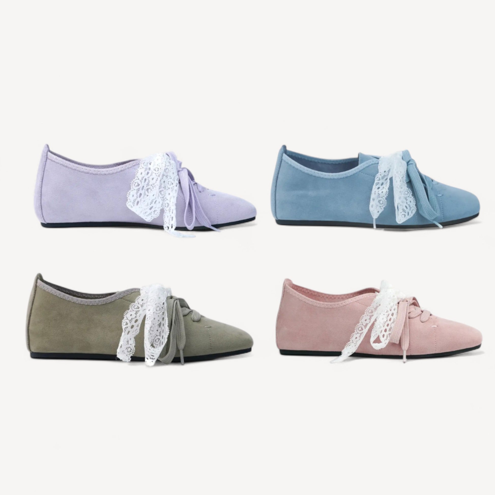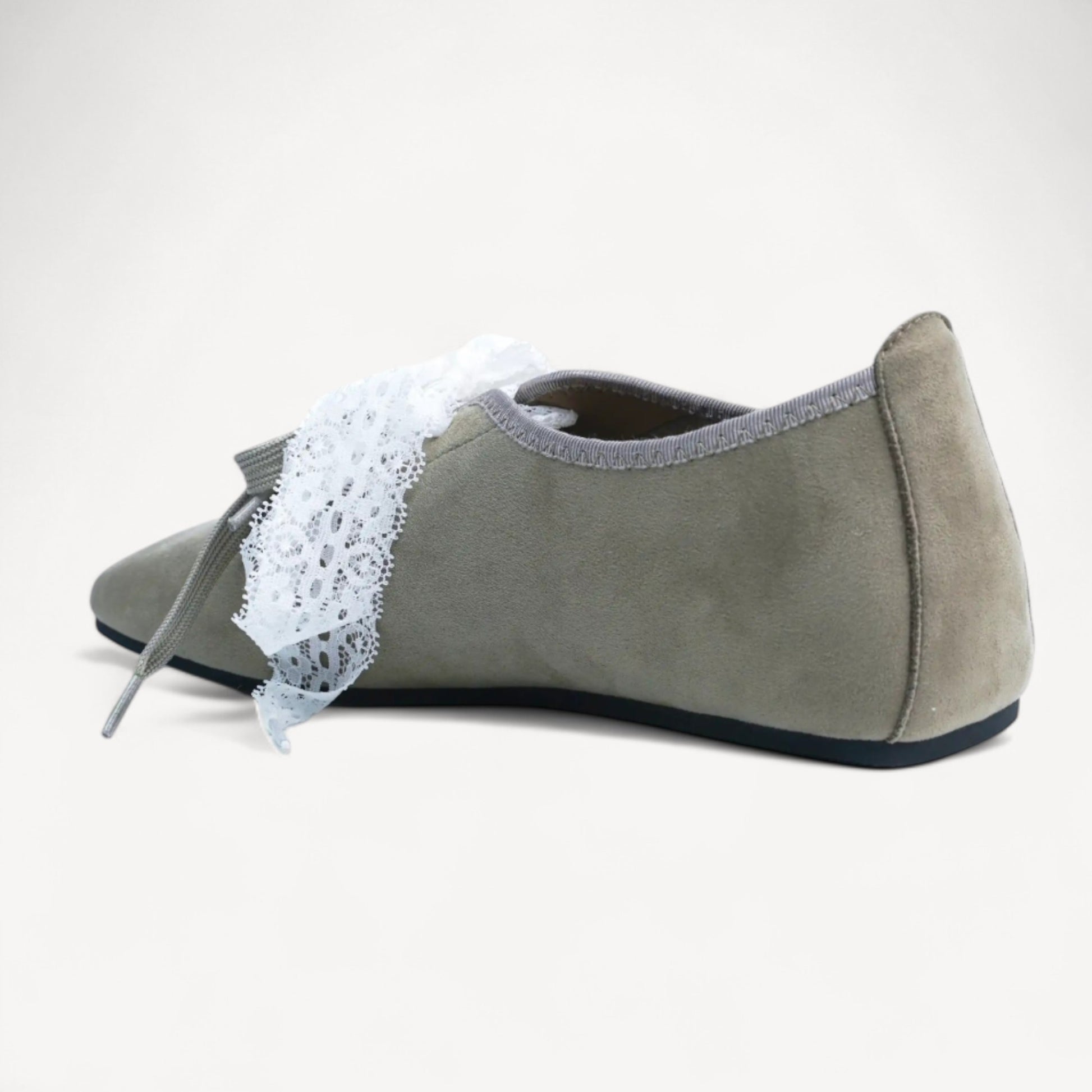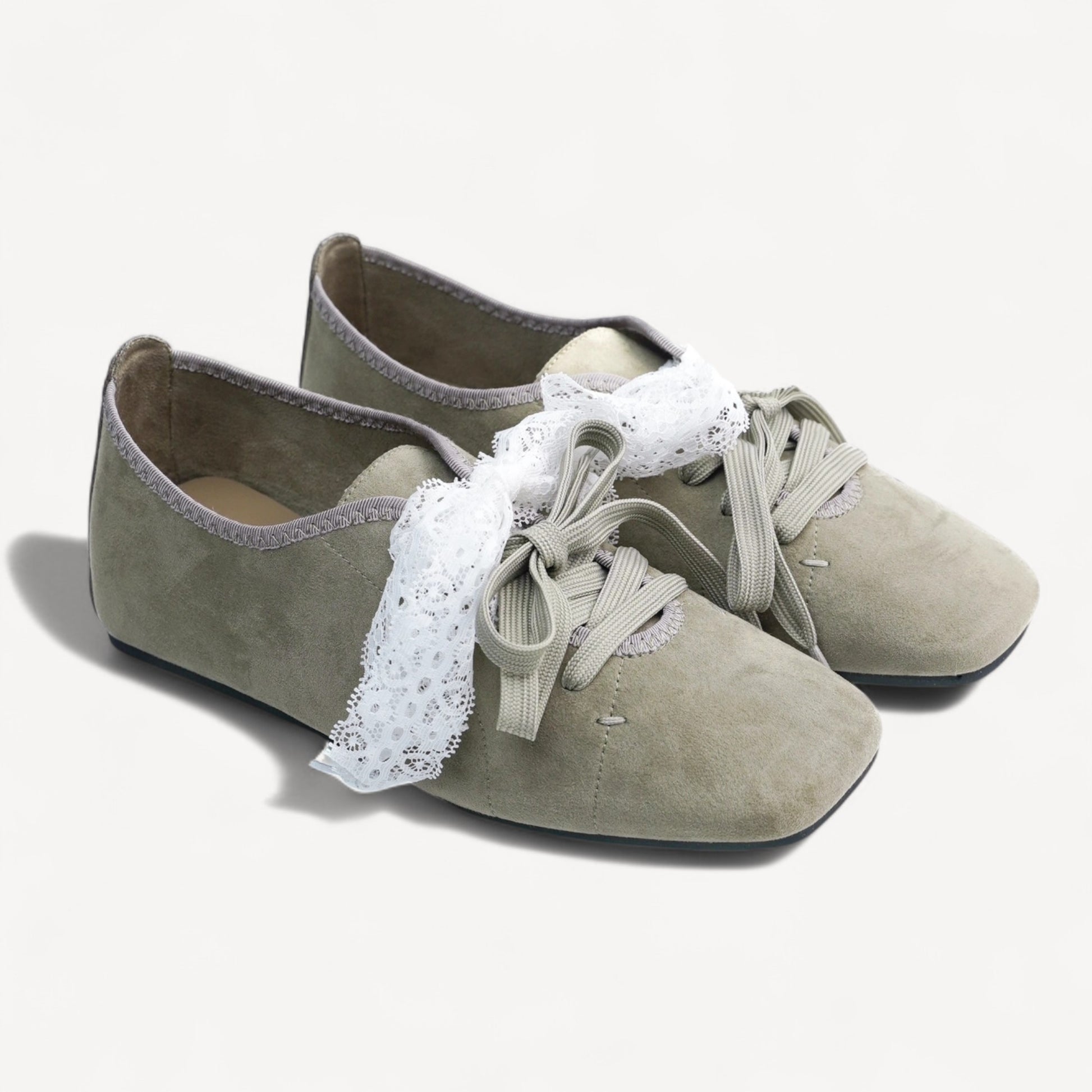 These matcha green suede ballet flats feature delicate lace straps, offering ballet-inspired grace with modern comfort. Soft suede and a refined silhouette make them ideal for casual outings, brunch, or relaxed weekends. Lightweight and versatile, they add a subtle, refreshing touch to any outfit.