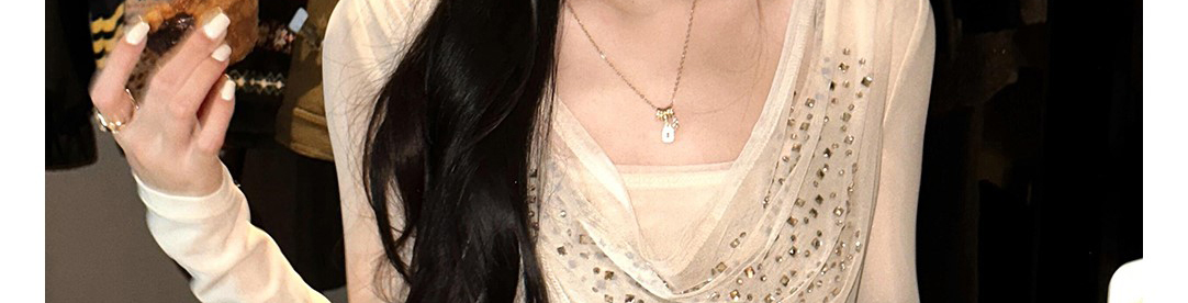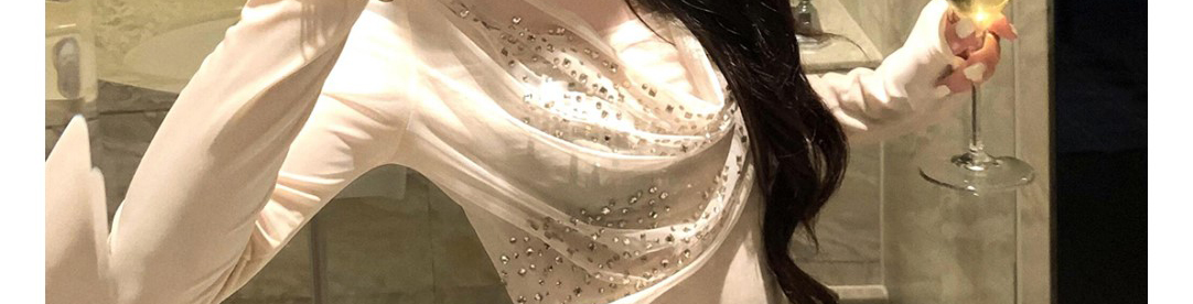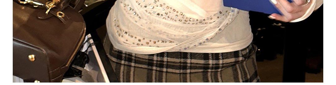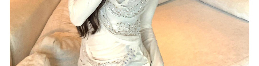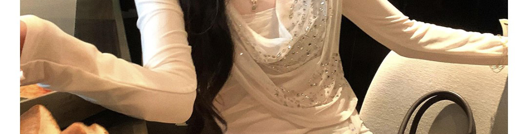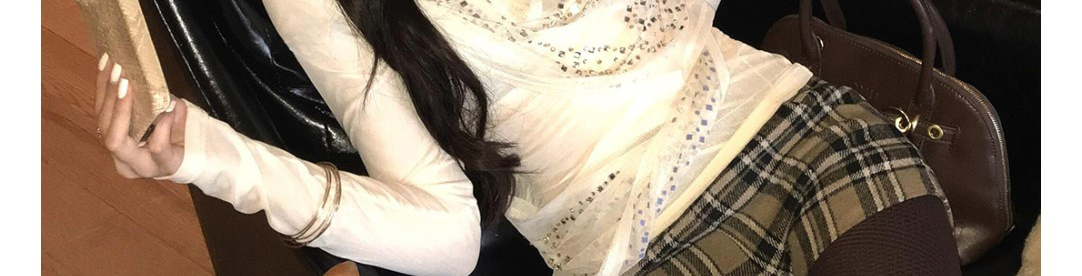 - Top: Shimmering mesh top with sequin and draped neckline design, showing a soft feminine silhouette.