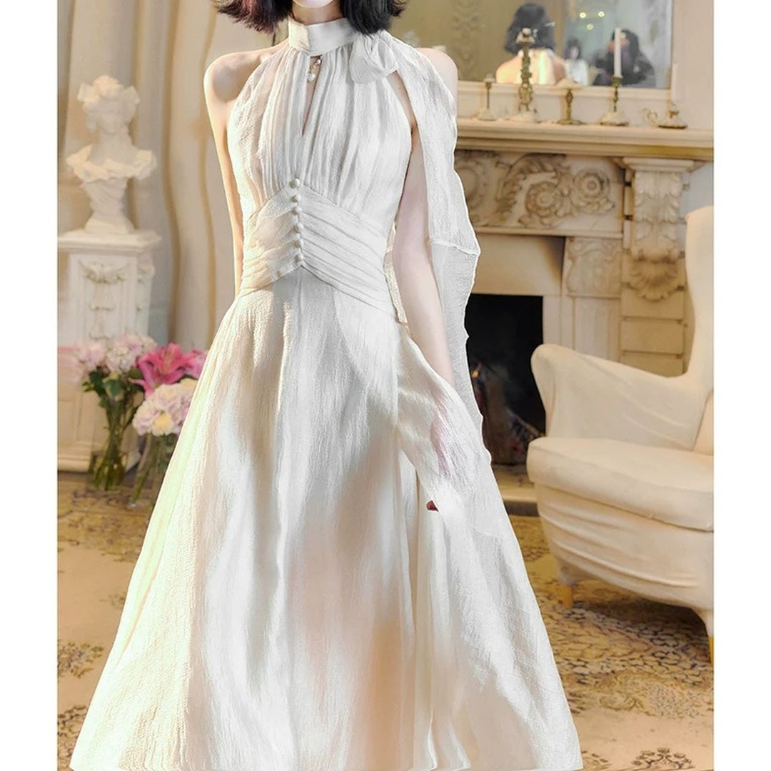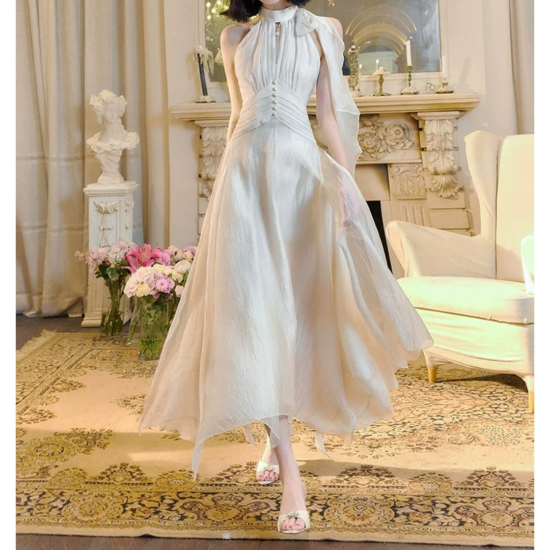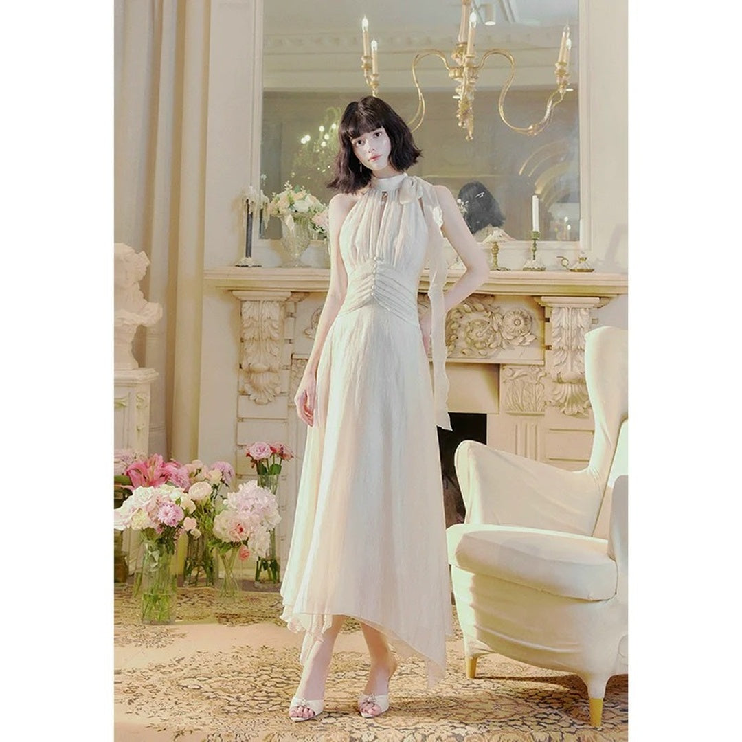 - Lightweight Milan-inspired gown dress with halter neckline, ruffled hem, and asymmetrical cut. Elegant and flowy, perfect for beach vacations or summer evenings.