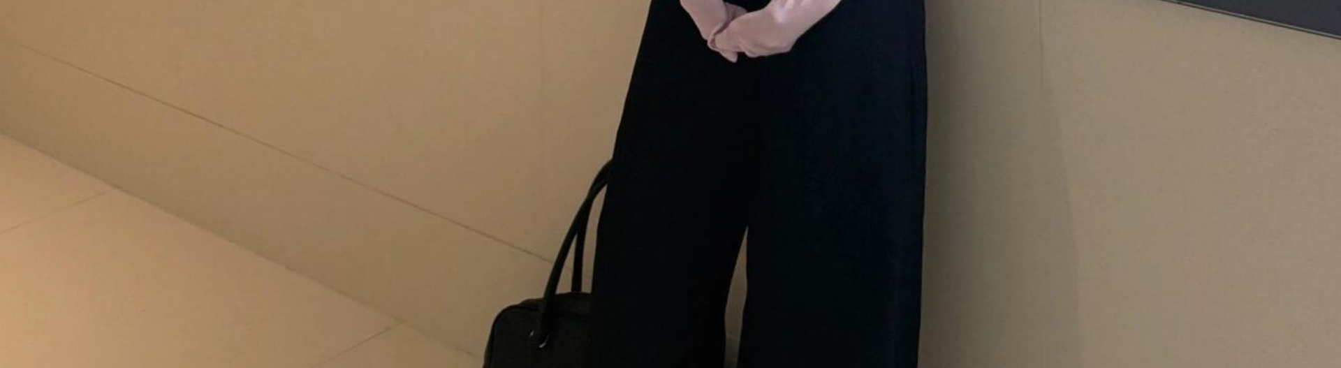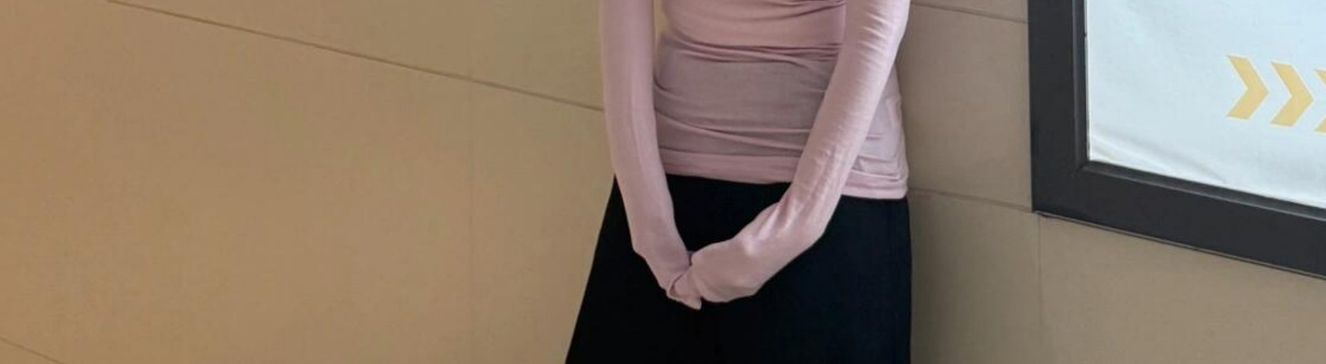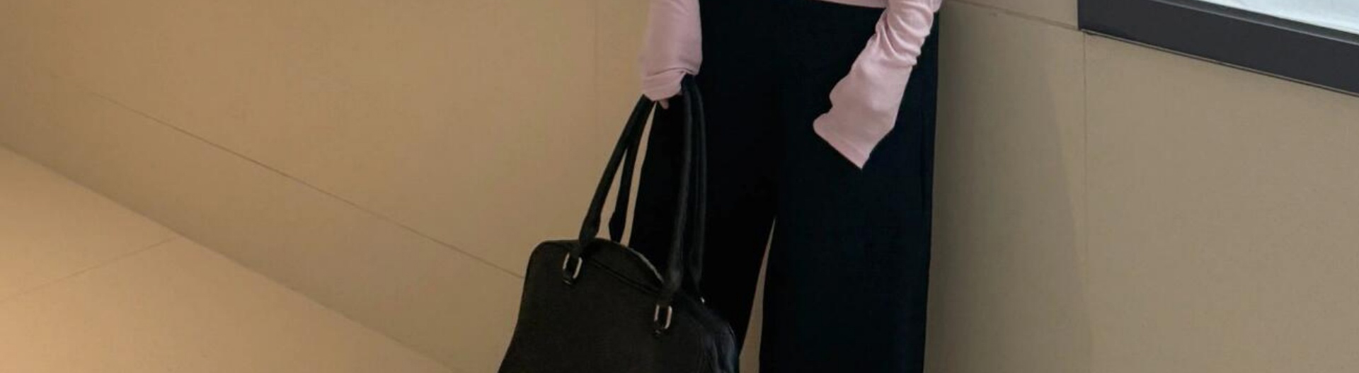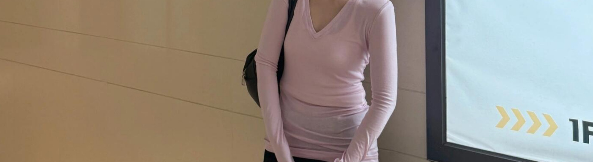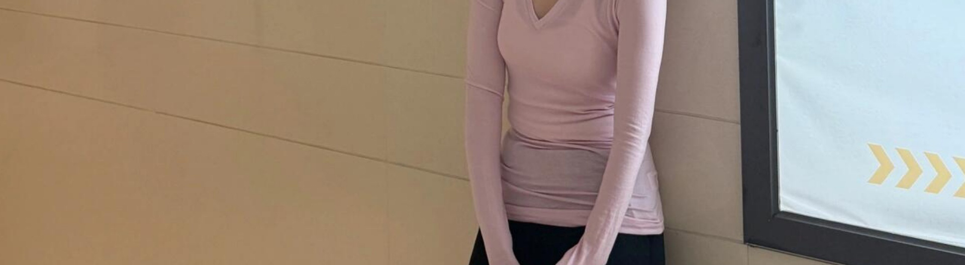 - Top: Slim-fit long sleeve V-neck tee in soft pink, lightweight and stretchy fabric for autumn layering.