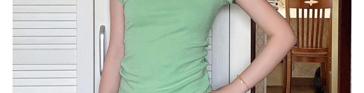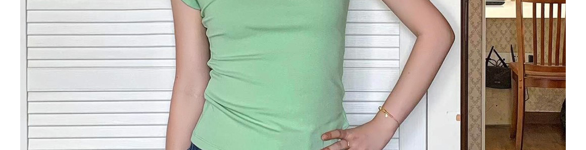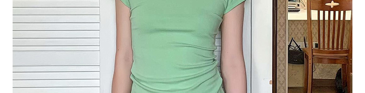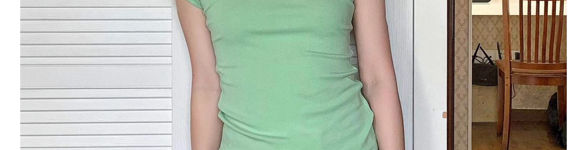 - Top: Slim-fit short sleeve tee in mint green with regular shoulder cut, lightweight summer fabric.