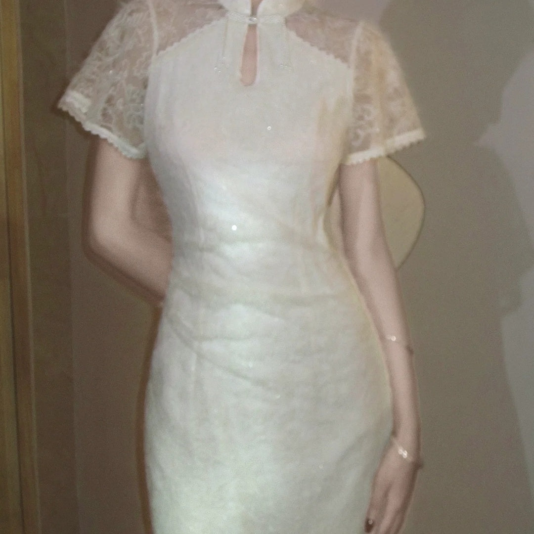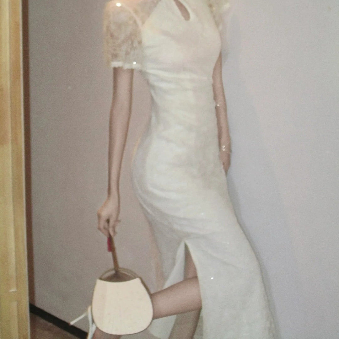 Modern Chinese gown dress with lace cutout and sleeveless design. Elegant for cultural events, weddings, or evening parties.