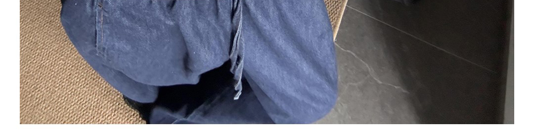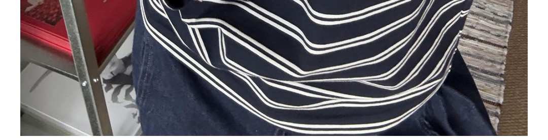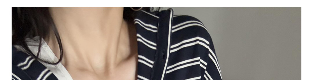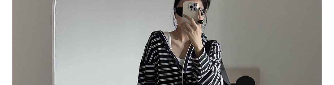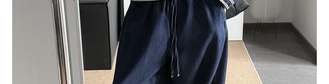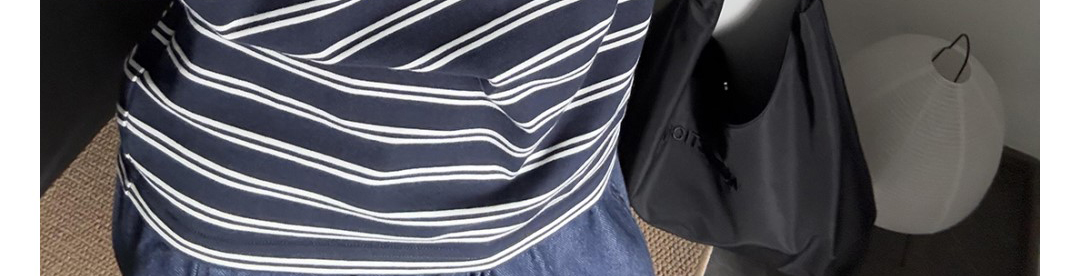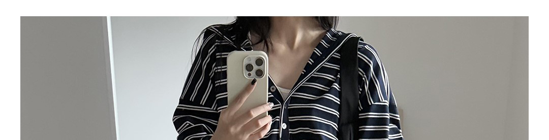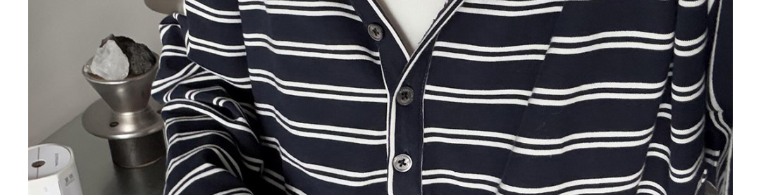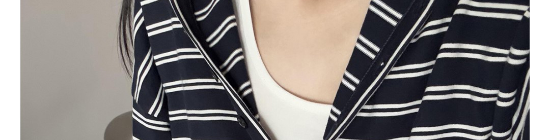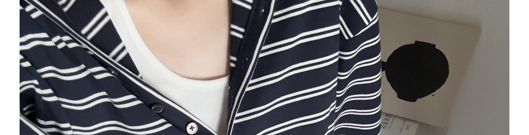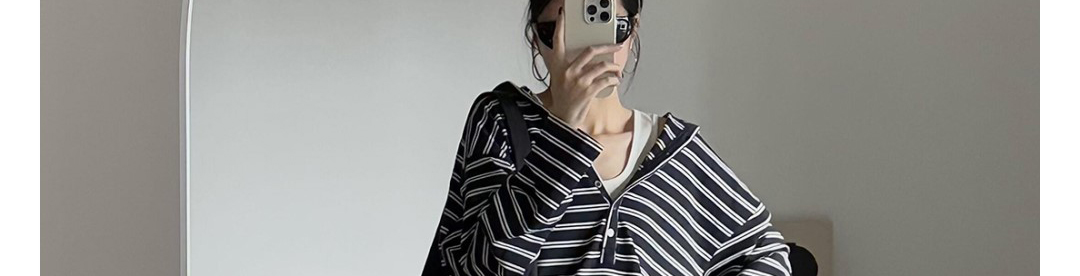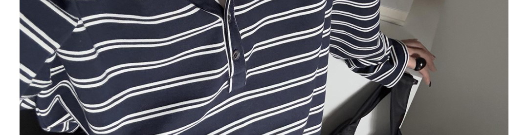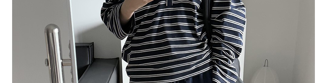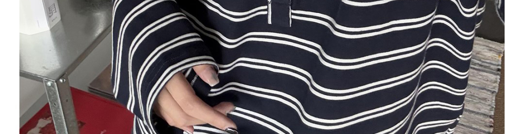 - Top: Navy long-sleeve tee with hood, half collar, stripes, and relaxed fit.