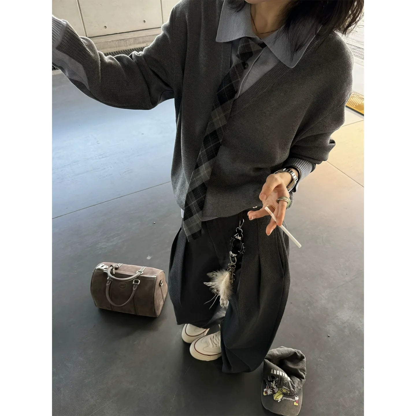 Old Money Fake Layer V-Neck Sweater Polo Collar Knit Pullover Autumn-Winter Cleanfit Top