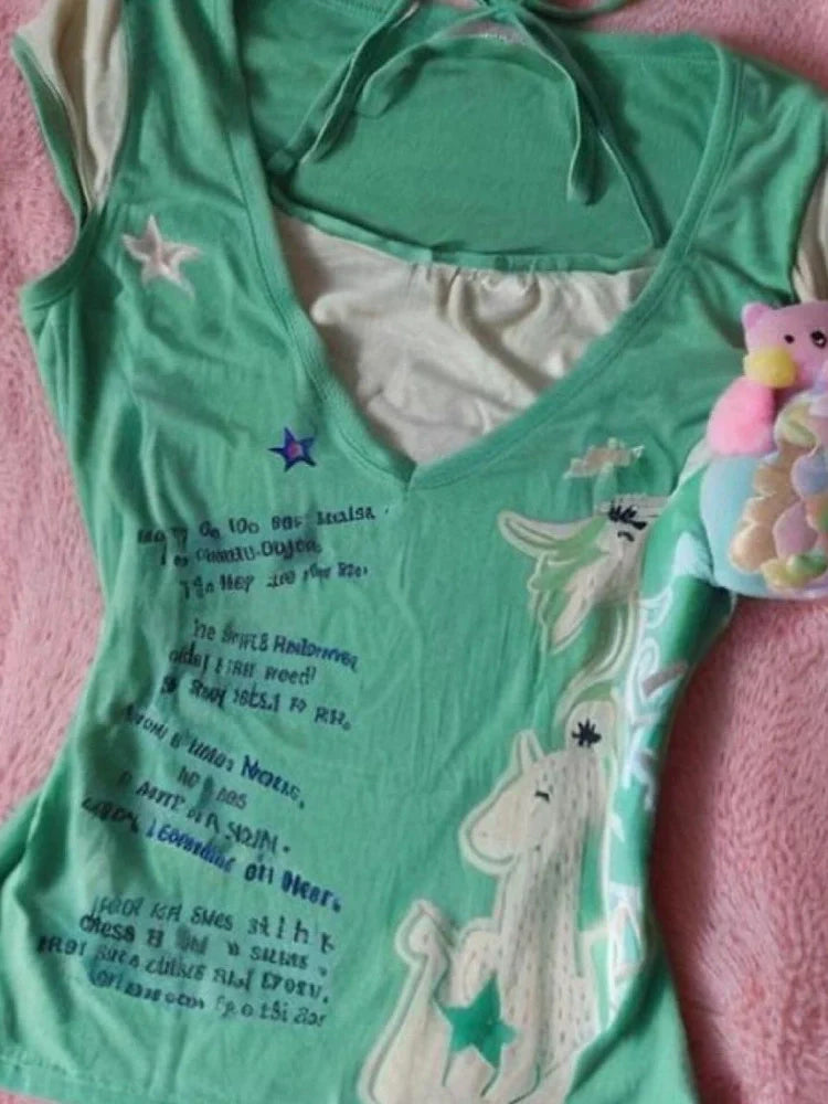 - Top: Old-school green () short-sleeve T-shirt with fake two-piece design, capturing Y2K subculture () vibes and light subculture () style for summer.