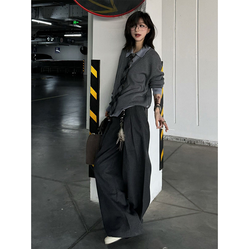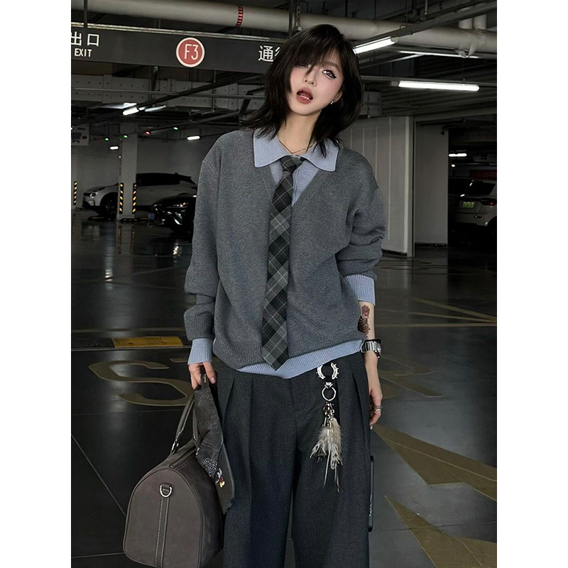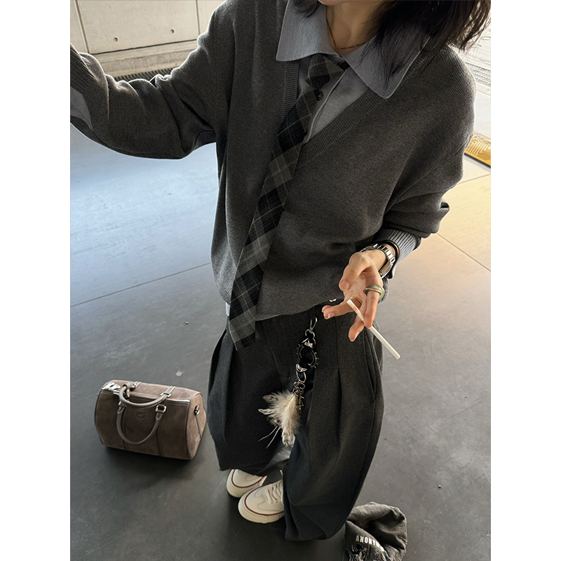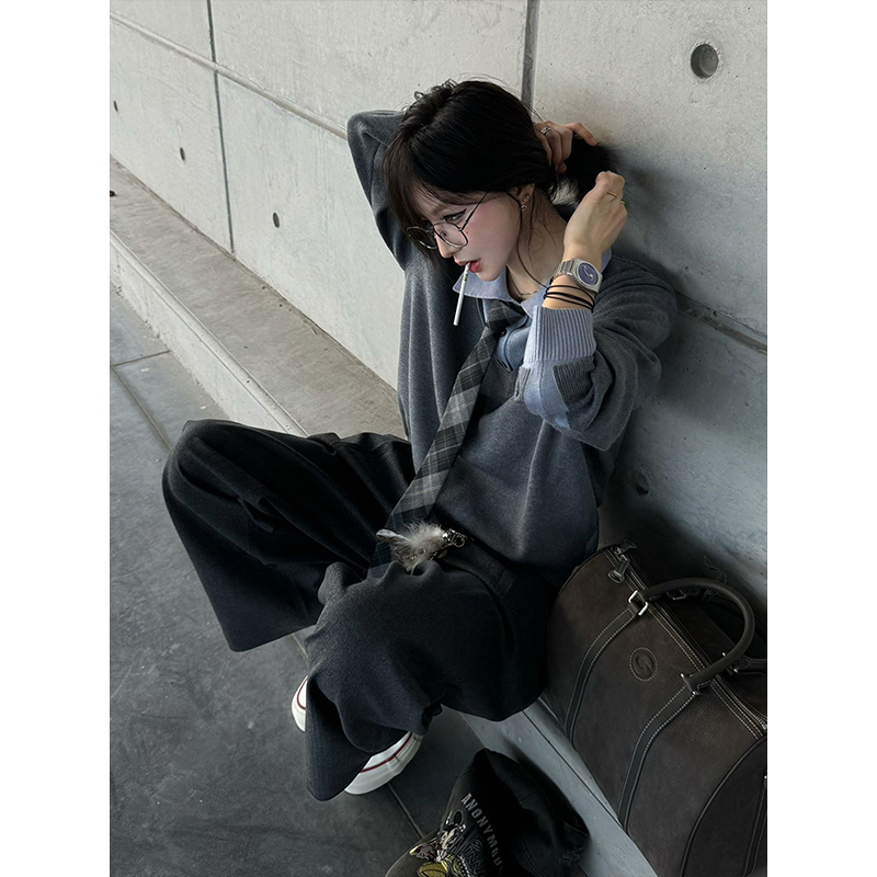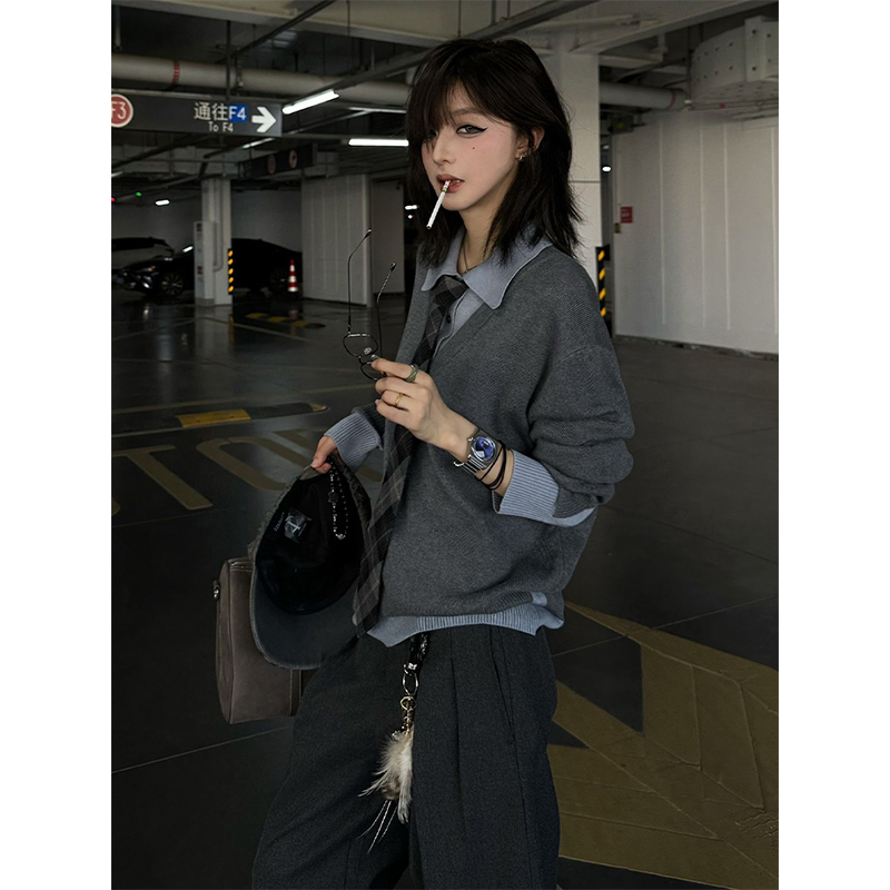 Old money-inspired layered polo knit with contrast color blocking. Loose and elegant design for daily wear.