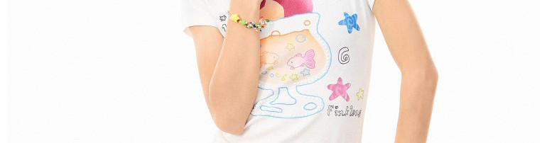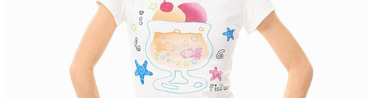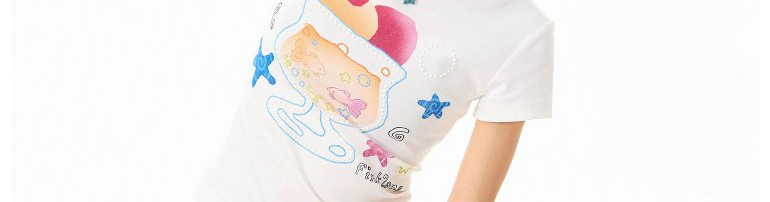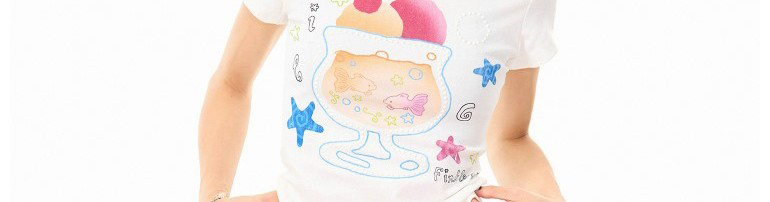 - Top: Slim-fit short sleeve cotton tee with pearl and fishbowl print, regular shoulder cut, breathable summer fabric.
