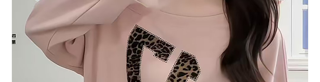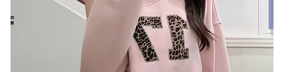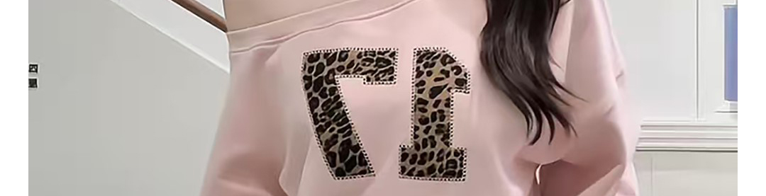 - Top: Pink off-shoulder sweatshirt with leopard print and numeric patchwork design in soft fleece fabric.